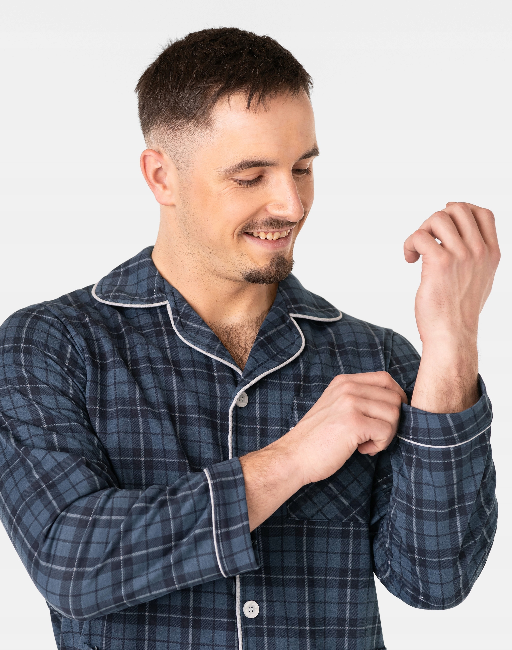 Ciepła, rozpinana, niezwykle przyjemna w dotyku (co ma bardzo duże znaczenie, gdy zakładamy ją na gołe ciało) dwuczęściowa piżama męska przeznaczona nie tylko jako nocna garderoba do snu ale także i do codziennego krzątania się po domu. Rozpinana konstrukcja z długim rękawem umożliwia łatwe zakładanie i zdejmowanie, dodając praktyczności do stylu. Długie spodnie z kieszeniami na elastycznej gumce z rozpinanym rozporkiem doskonale dopasowują się do sylwetki, zapewniając swobodę ruchów. Uszyta z bardzo dobrej jakości ciepłego flanelowego materiału bawełnianego, który przepuszcza powietrze, pozwala skórze oddychać i zapobiega poceniu się ciała zapewniając komfort w czasie snu.