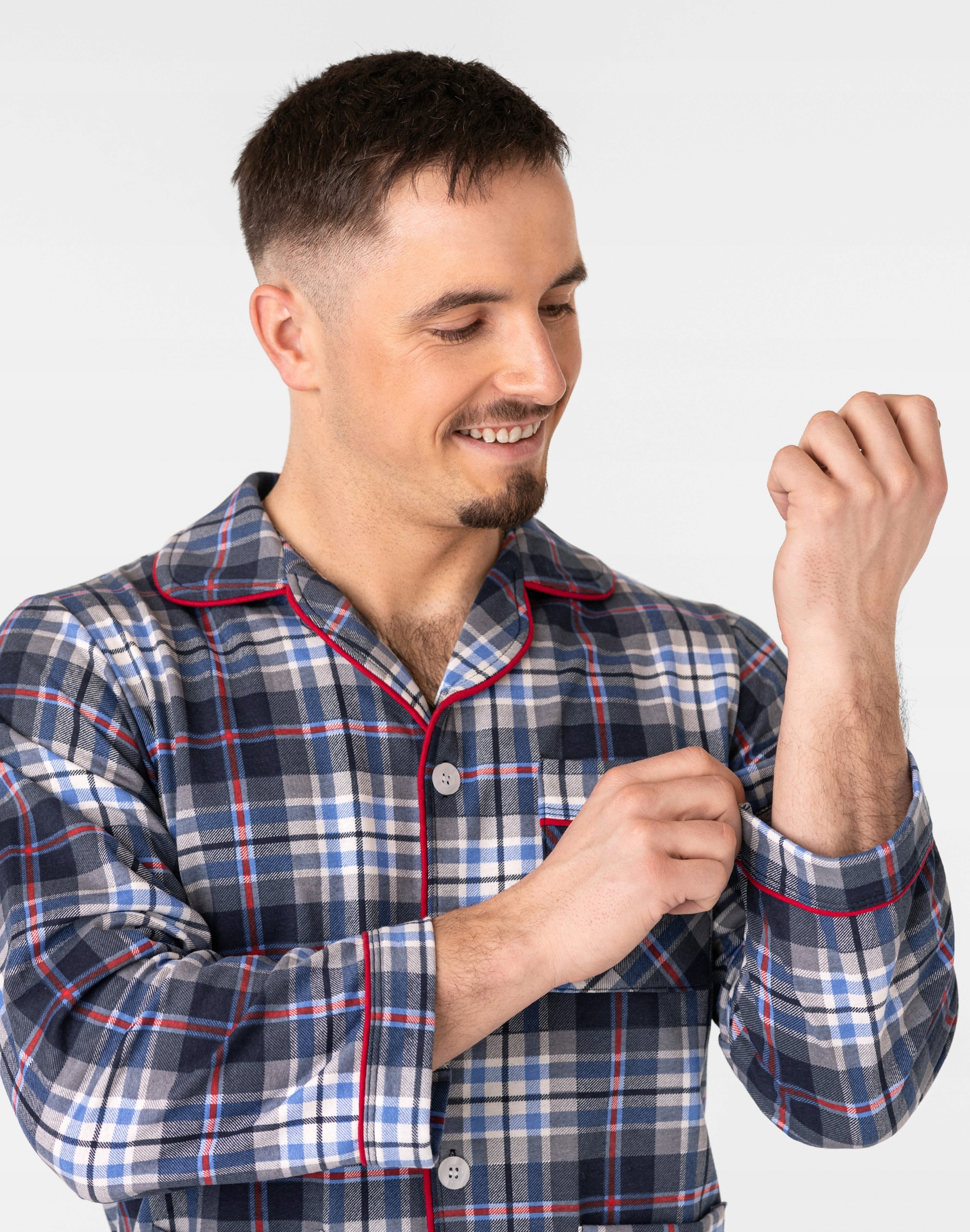 Ciepła, rozpinana, niezwykle przyjemna w dotyku (co ma bardzo duże znaczenie, gdy zakładamy ją na gołe ciało) dwuczęściowa piżama męska przeznaczona nie tylko jako nocna garderoba do snu ale także i do codziennego krzątania się po domu. Rozpinana konstrukcja z długim rękawem umożliwia łatwe zakładanie i zdejmowanie, dodając praktyczności do stylu. Długie spodnie z kieszeniami na elastycznej gumce z rozpinanym rozporkiem doskonale dopasowują się do sylwetki, zapewniając swobodę ruchów. Uszyta z bardzo dobrej jakości ciepłego flanelowego materiału bawełnianego, który przepuszcza powietrze, pozwala skórze oddychać i zapobiega poceniu się ciała zapewniając komfort w czasie snu.