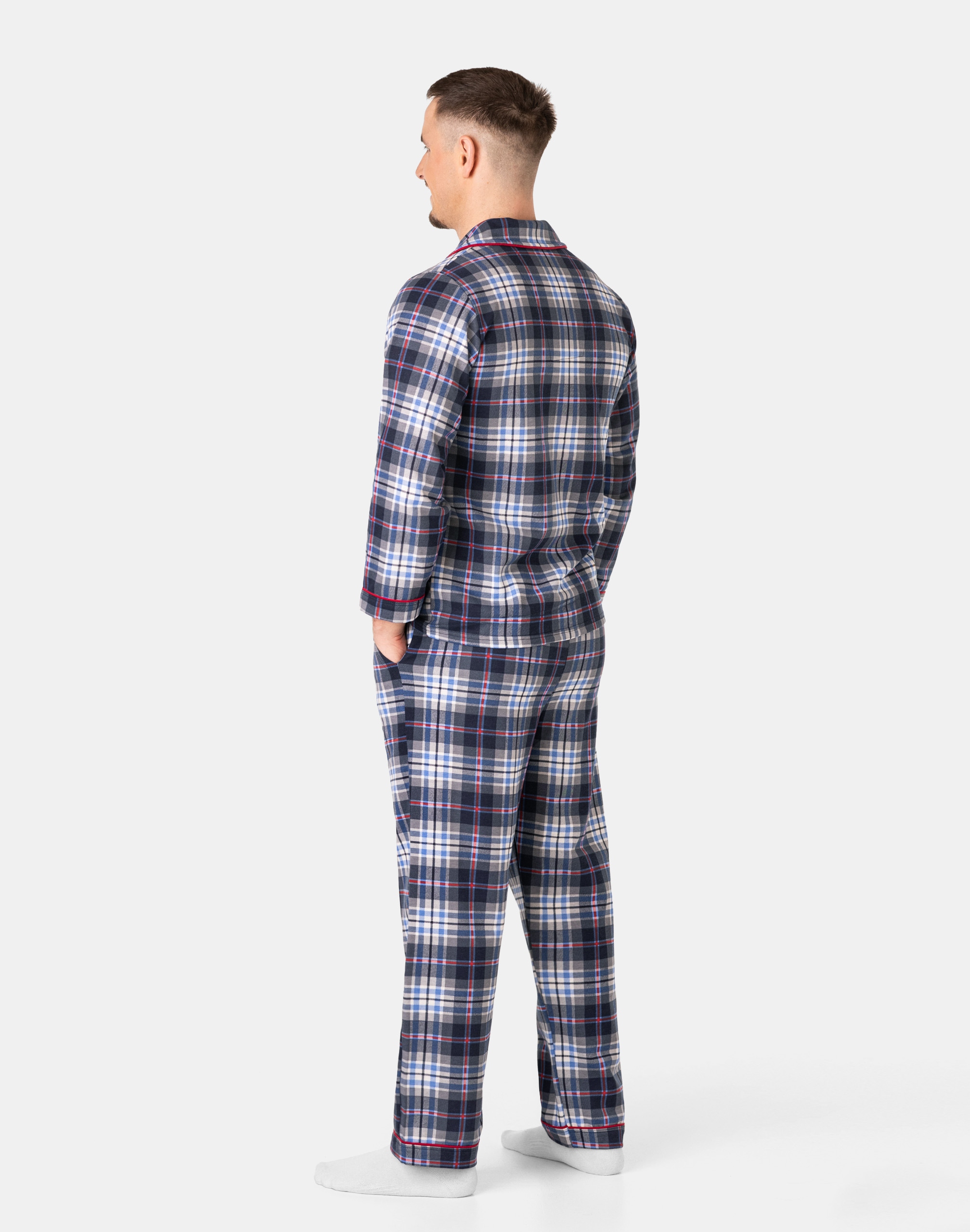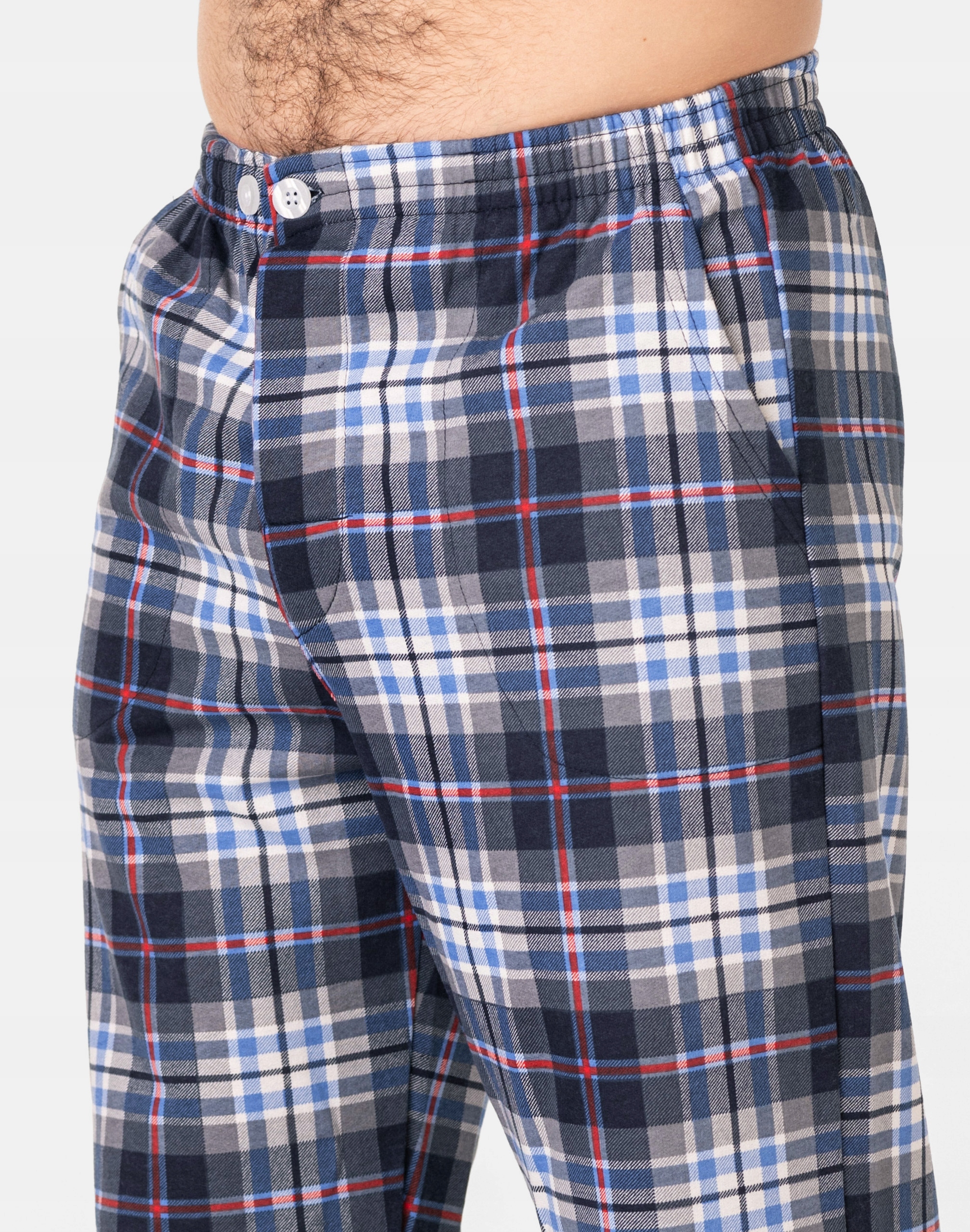 Ciepła, rozpinana, niezwykle przyjemna w dotyku (co ma bardzo duże znaczenie, gdy zakładamy ją na gołe ciało) dwuczęściowa piżama męska przeznaczona nie tylko jako nocna garderoba do snu ale także i do codziennego krzątania się po domu. Rozpinana konstrukcja z długim rękawem umożliwia łatwe zakładanie i zdejmowanie, dodając praktyczności do stylu. Długie spodnie z kieszeniami na elastycznej gumce z rozpinanym rozporkiem doskonale dopasowują się do sylwetki, zapewniając swobodę ruchów. Uszyta z bardzo dobrej jakości ciepłego flanelowego materiału bawełnianego, który przepuszcza powietrze, pozwala skórze oddychać i zapobiega poceniu się ciała zapewniając komfort w czasie snu.