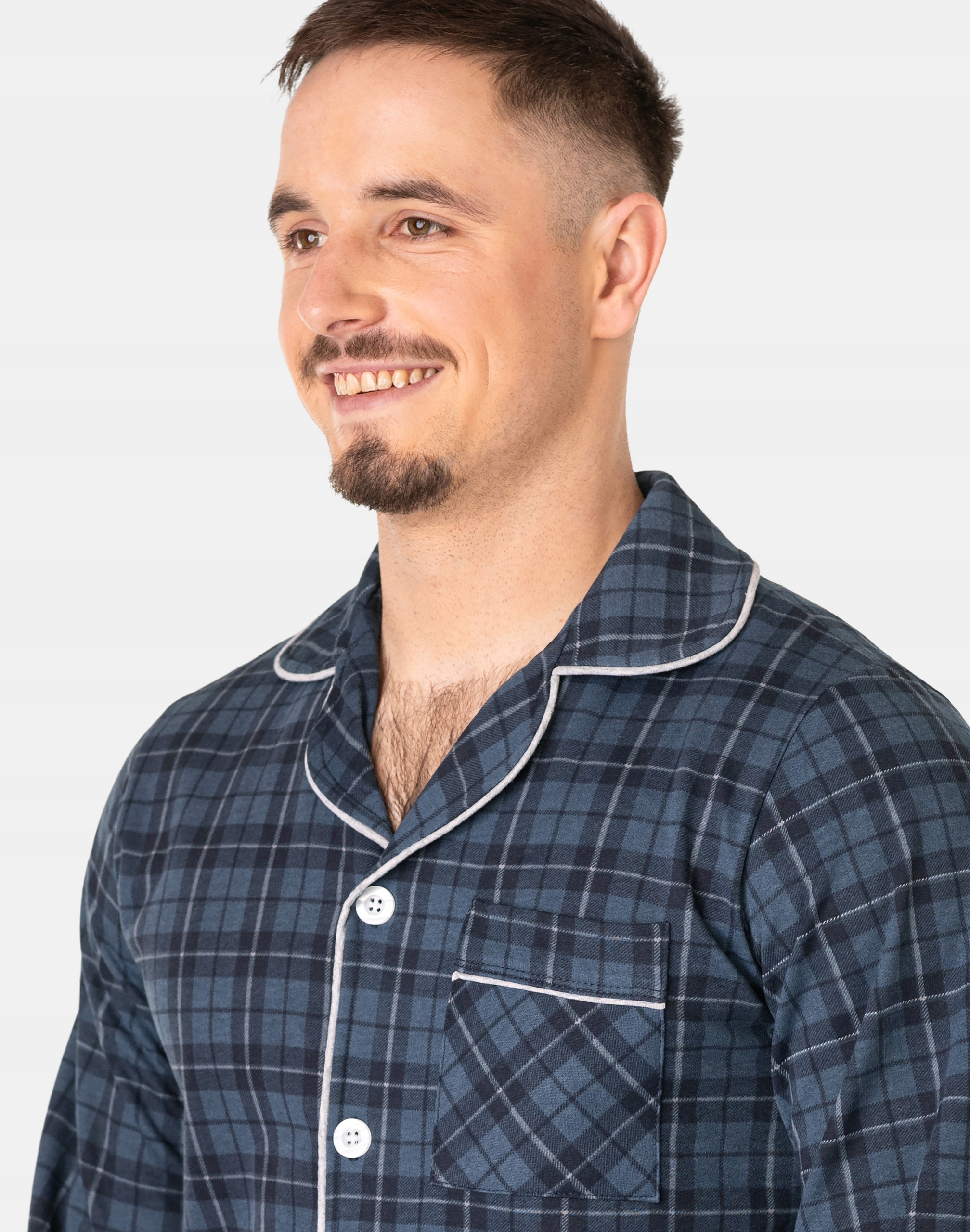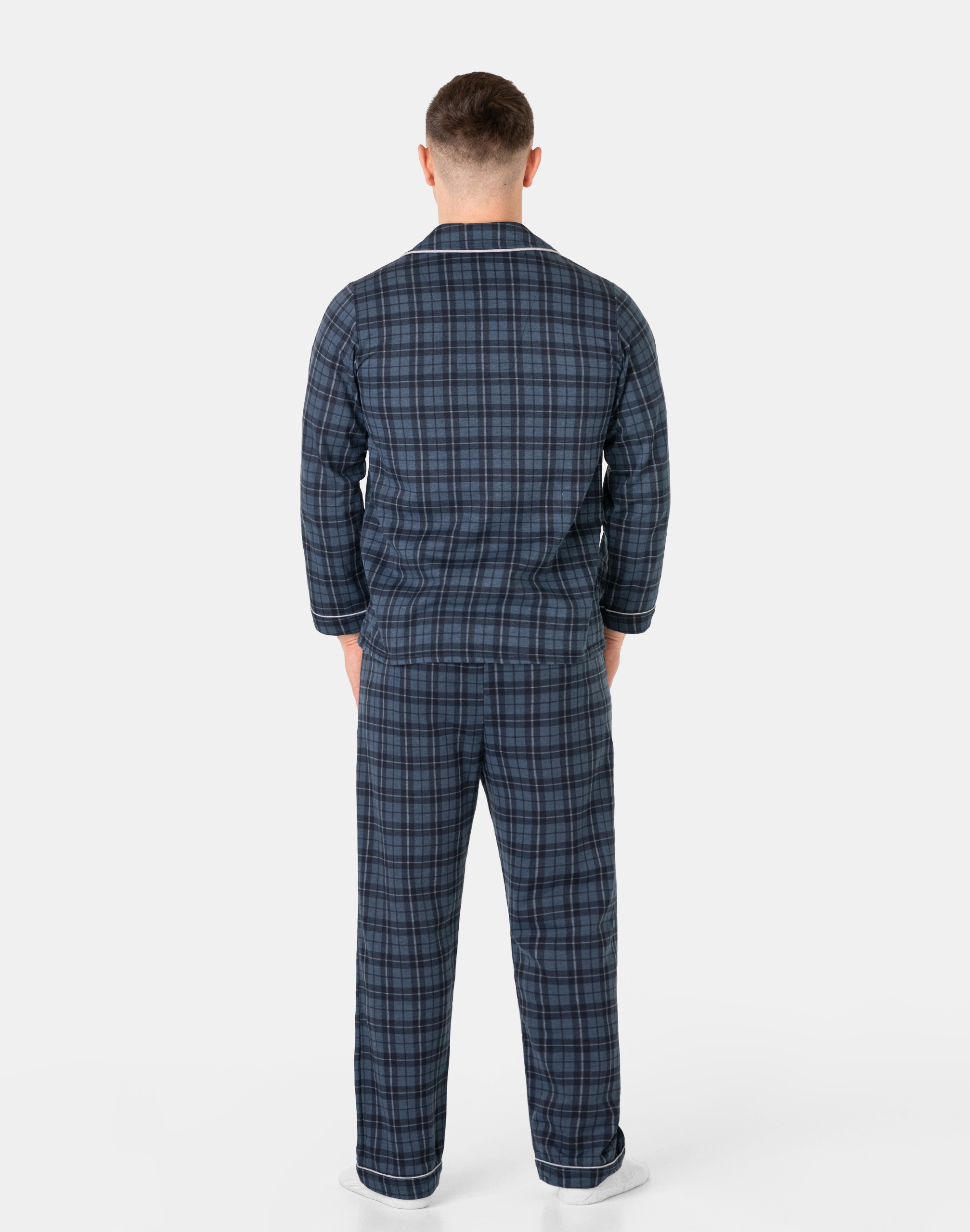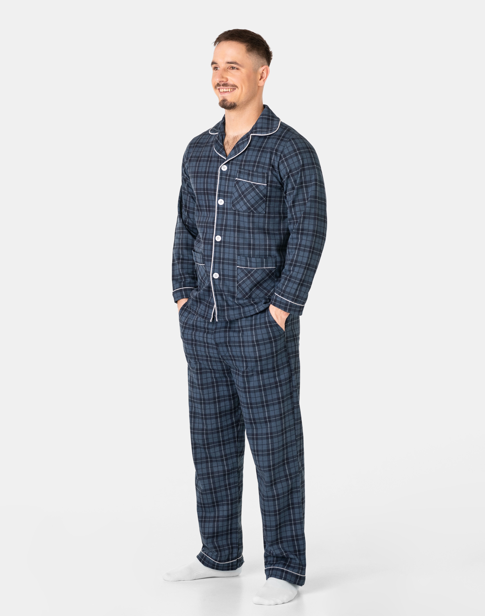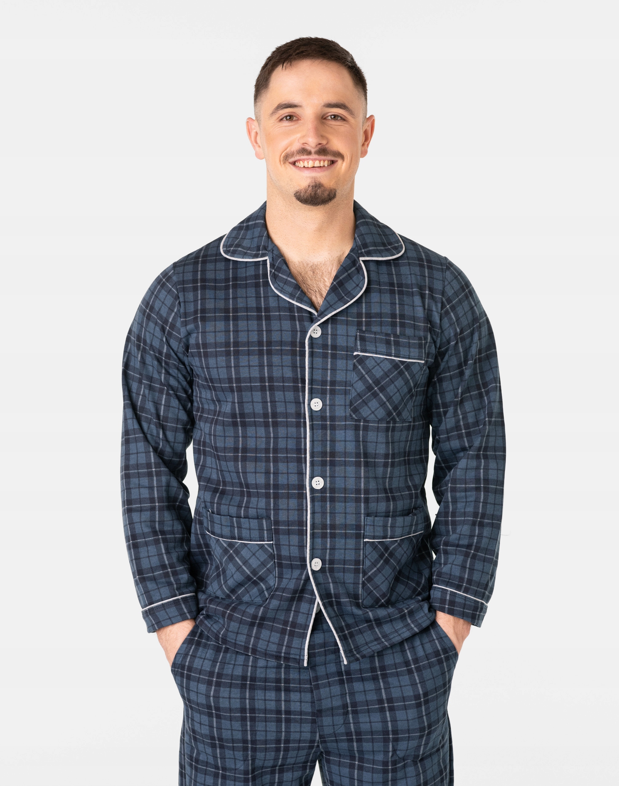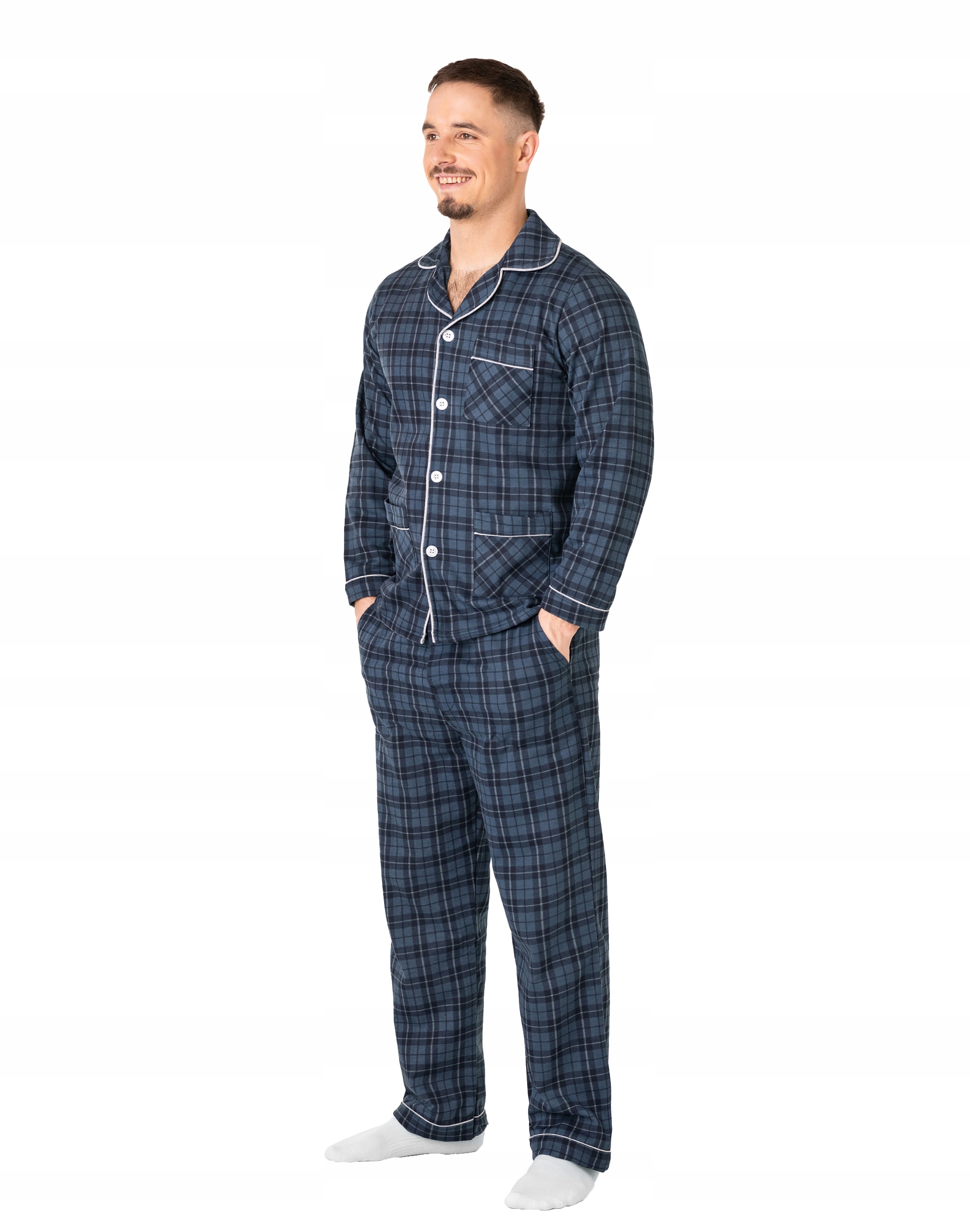 Ciepła, rozpinana, niezwykle przyjemna w dotyku (co ma bardzo duże znaczenie, gdy zakładamy ją na gołe ciało) dwuczęściowa piżama męska przeznaczona nie tylko jako nocna garderoba do snu ale także i do codziennego krzątania się po domu. Rozpinana konstrukcja z długim rękawem umożliwia łatwe zakładanie i zdejmowanie, dodając praktyczności do stylu. Długie spodnie z kieszeniami na elastycznej gumce z rozpinanym rozporkiem doskonale dopasowują się do sylwetki, zapewniając swobodę ruchów. Uszyta z bardzo dobrej jakości ciepłego flanelowego materiału bawełnianego, który przepuszcza powietrze, pozwala skórze oddychać i zapobiega poceniu się ciała zapewniając komfort w czasie snu.