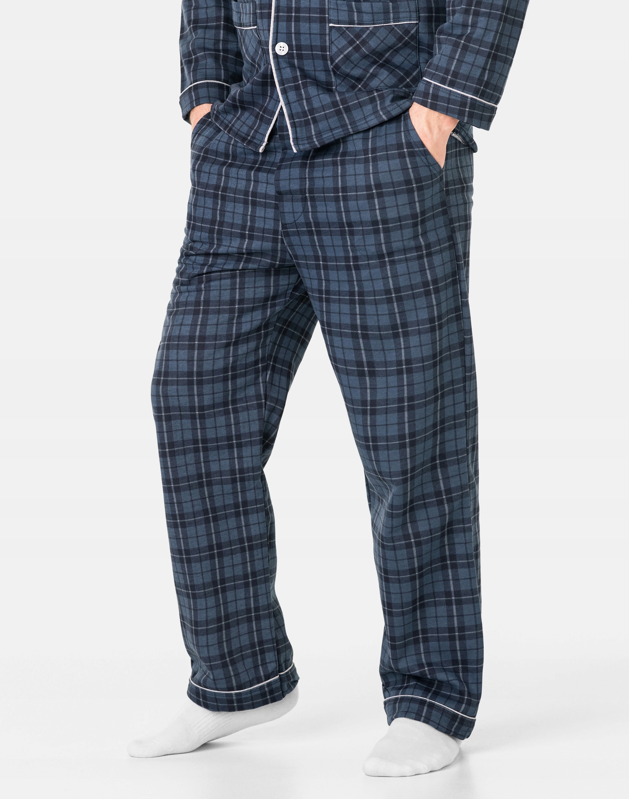 Ciepła, rozpinana, niezwykle przyjemna w dotyku (co ma bardzo duże znaczenie, gdy zakładamy ją na gołe ciało) dwuczęściowa piżama męska przeznaczona nie tylko jako nocna garderoba do snu ale także i do codziennego krzątania się po domu. Rozpinana konstrukcja z długim rękawem umożliwia łatwe zakładanie i zdejmowanie, dodając praktyczności do stylu. Długie spodnie z kieszeniami na elastycznej gumce z rozpinanym rozporkiem doskonale dopasowują się do sylwetki, zapewniając swobodę ruchów. Uszyta z bardzo dobrej jakości ciepłego flanelowego materiału bawełnianego, który przepuszcza powietrze, pozwala skórze oddychać i zapobiega poceniu się ciała zapewniając komfort w czasie snu.