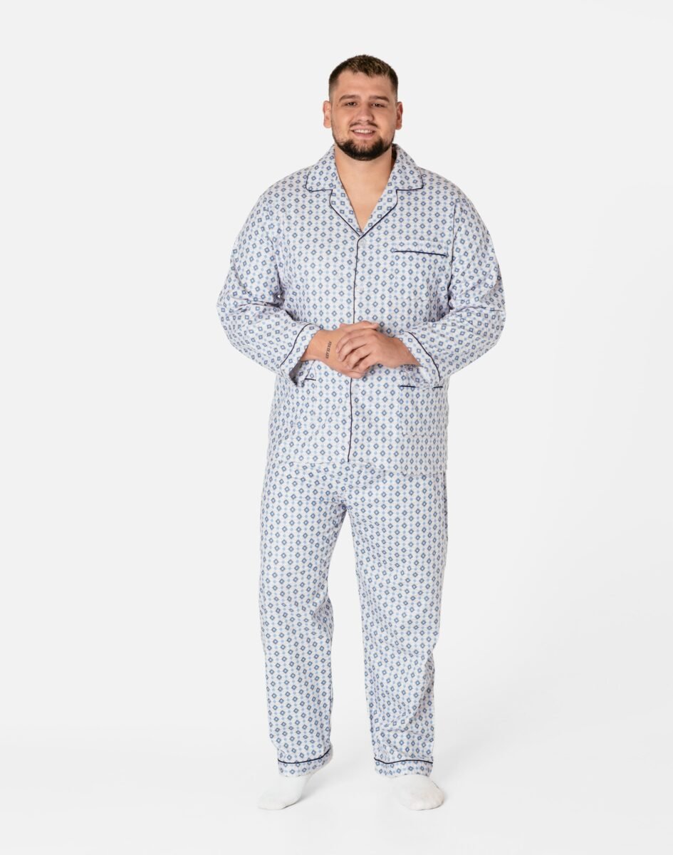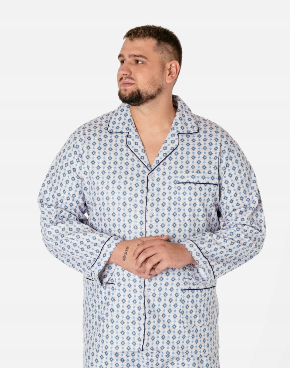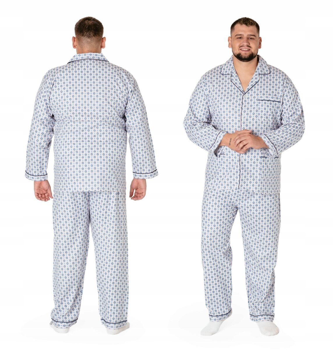 Ciepła, rozpinana, niezwykle przyjemna w dotyku (co ma bardzo duże znaczenie, gdy zakładamy ją na gołe ciało) dwuczęściowa piżama męska przeznaczona nie tylko jako nocna garderoba do snu ale także i do codziennego krzątania się po domu. Rozpinana konstrukcja z długim rękawem umożliwia łatwe zakładanie i zdejmowanie, dodając praktyczności do stylu. Długie spodnie bez kieszeni na elastycznej gumce z rozpinanym rozporkiem doskonale dopasowują się do sylwetki, zapewniając swobodę ruchów. Uszyta z bardzo dobrej jakości ciepłego flanelowego materiału bawełnianego, który przepuszcza powietrze, pozwala skórze oddychać i zapobiega poceniu się ciała zapewniając komfort w czasie snu.