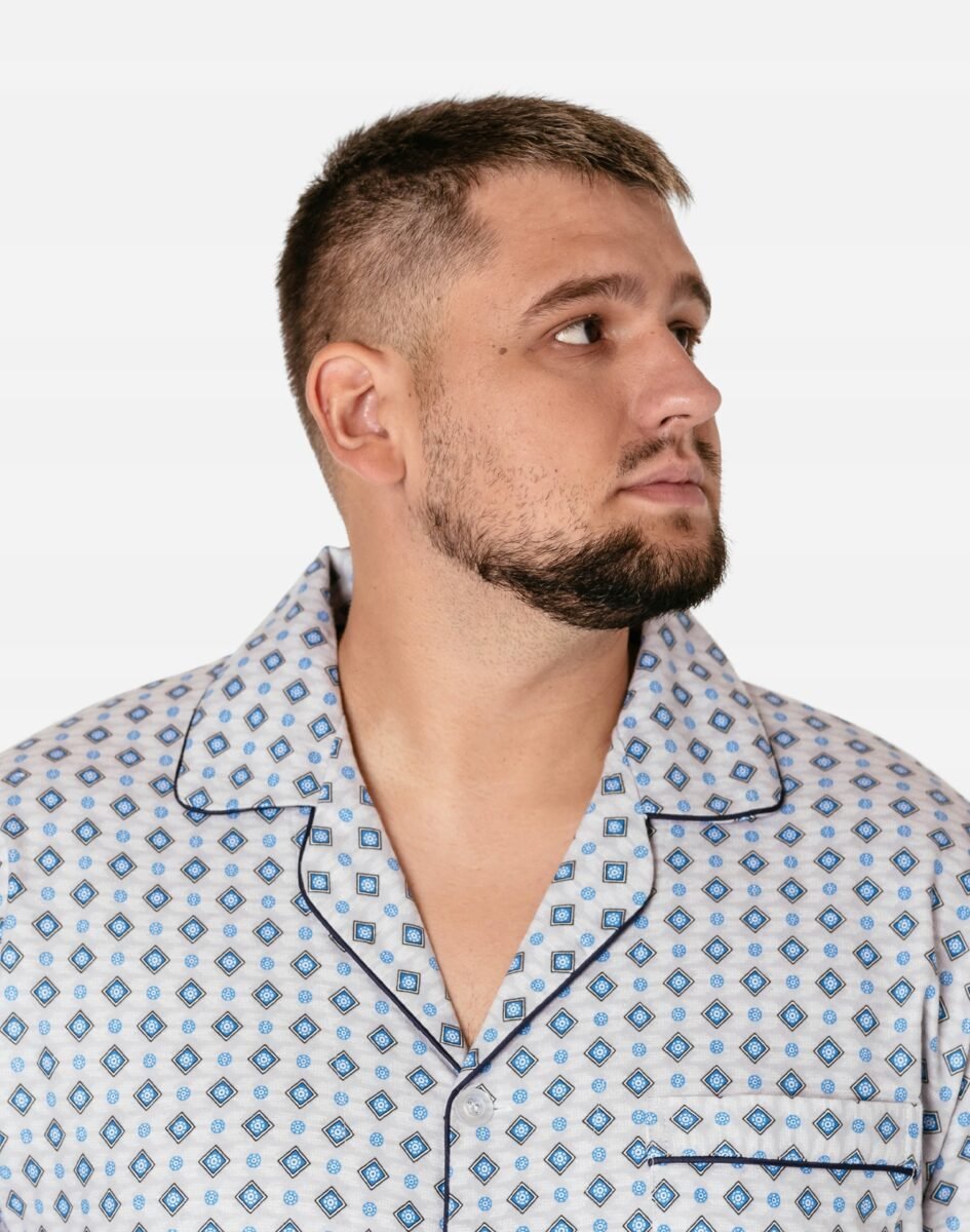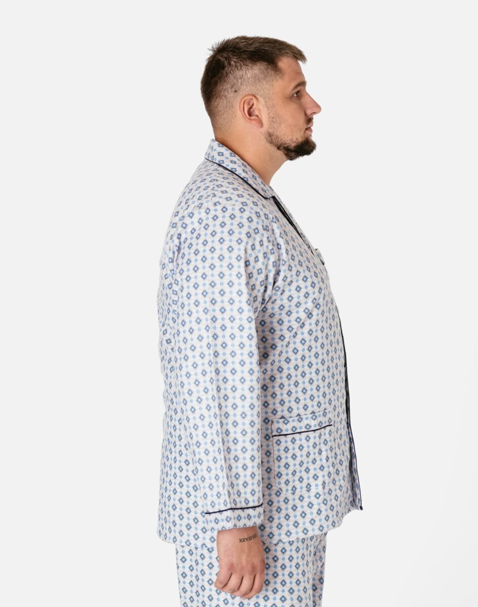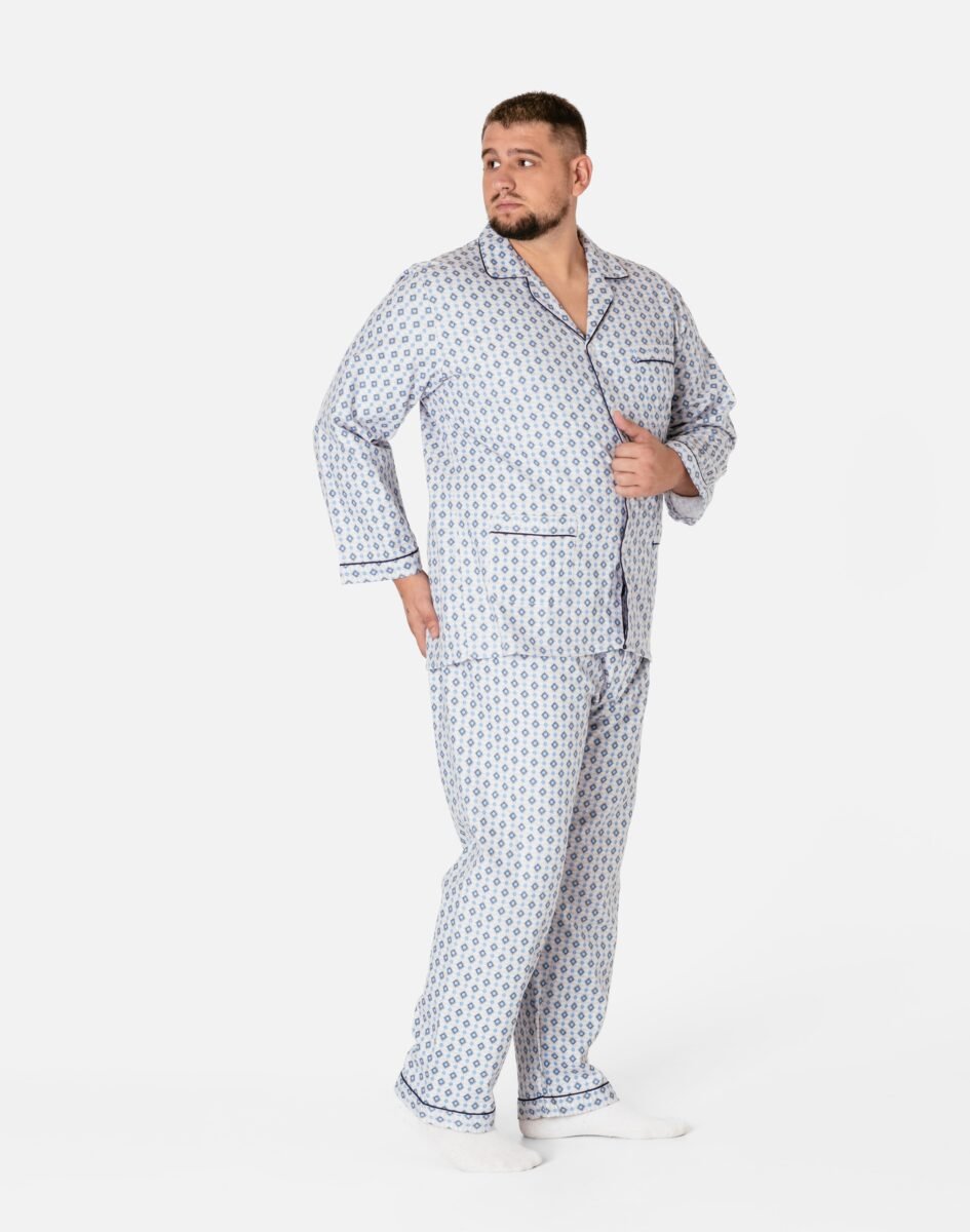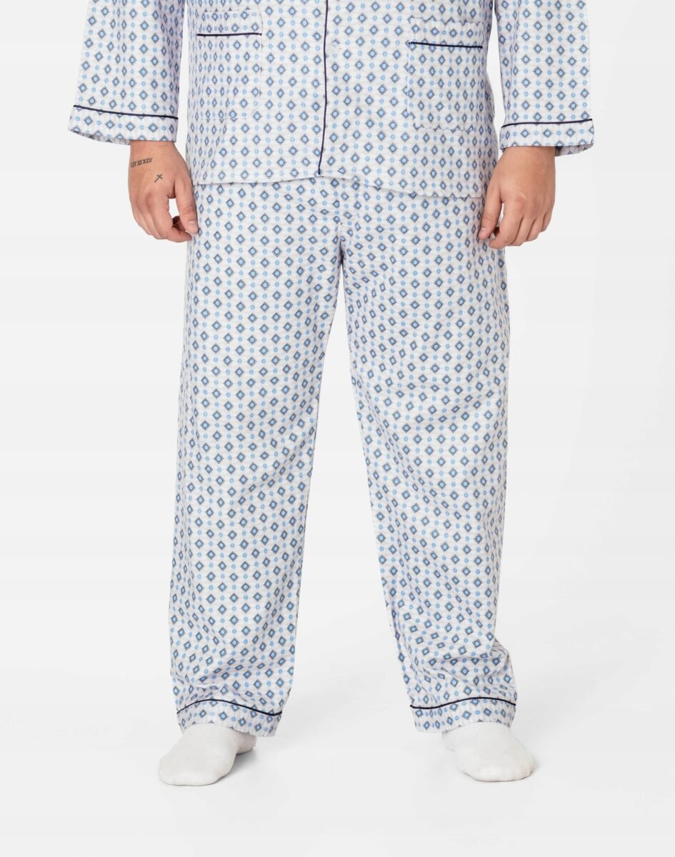 Ciepła, rozpinana, niezwykle przyjemna w dotyku (co ma bardzo duże znaczenie, gdy zakładamy ją na gołe ciało) dwuczęściowa piżama męska przeznaczona nie tylko jako nocna garderoba do snu ale także i do codziennego krzątania się po domu. Rozpinana konstrukcja z długim rękawem umożliwia łatwe zakładanie i zdejmowanie, dodając praktyczności do stylu. Długie spodnie bez kieszeni na elastycznej gumce z rozpinanym rozporkiem doskonale dopasowują się do sylwetki, zapewniając swobodę ruchów. Uszyta z bardzo dobrej jakości ciepłego flanelowego materiału bawełnianego, który przepuszcza powietrze, pozwala skórze oddychać i zapobiega poceniu się ciała zapewniając komfort w czasie snu.