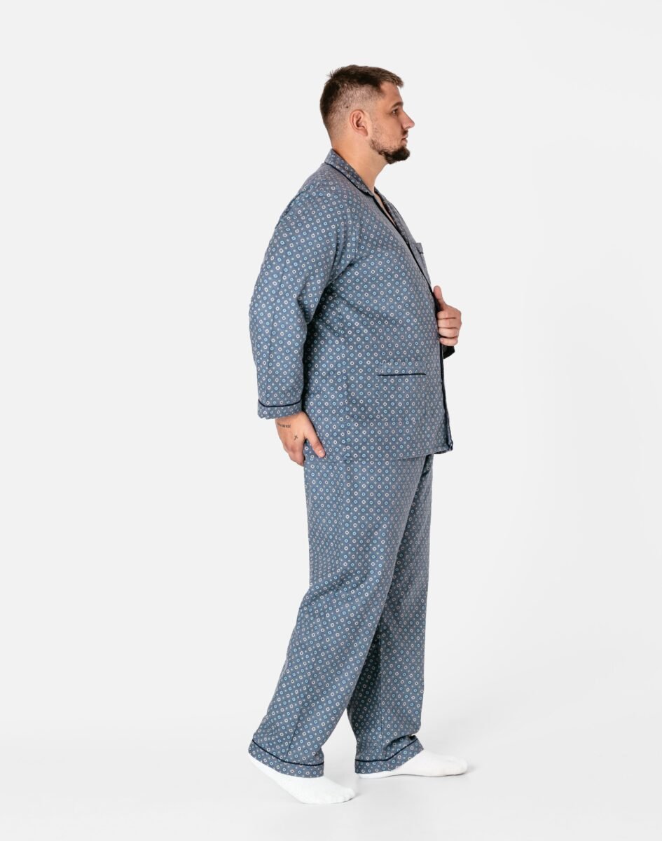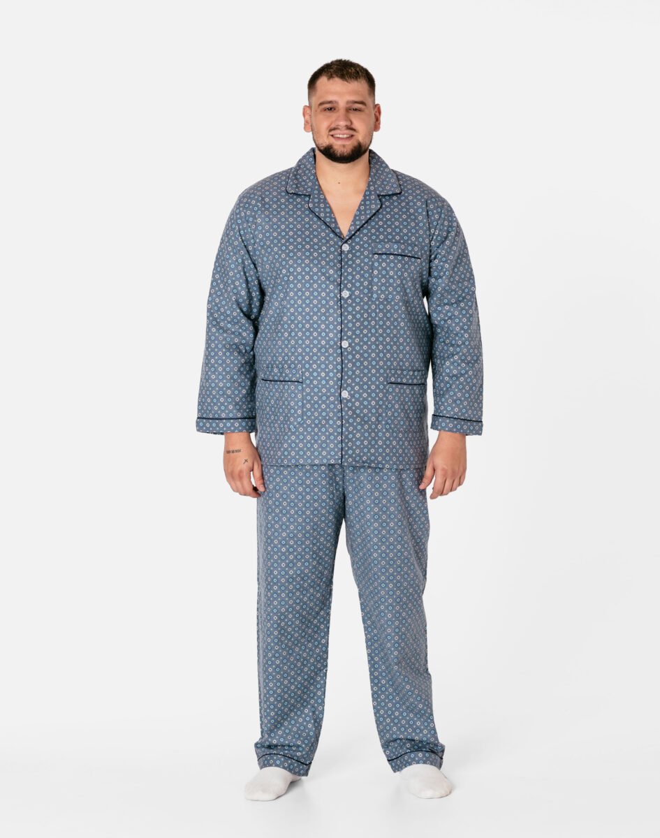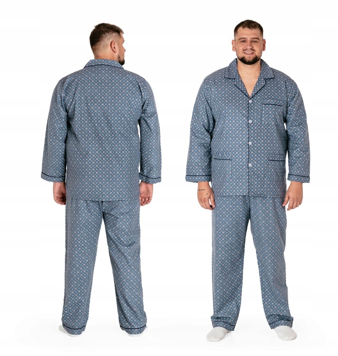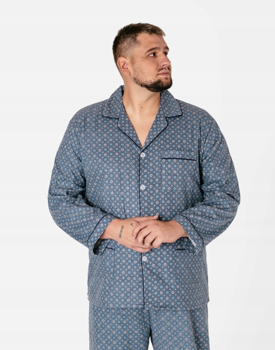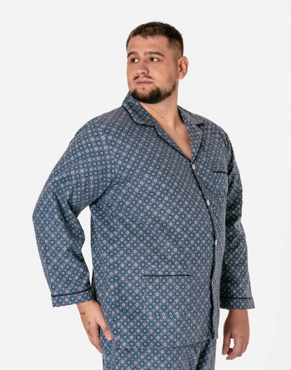 Ciepła, rozpinana, niezwykle przyjemna w dotyku (co ma bardzo duże znaczenie, gdy zakładamy ją na gołe ciało) dwuczęściowa piżama męska przeznaczona nie tylko jako nocna garderoba do snu ale także i do codziennego krzątania się po domu. Rozpinana konstrukcja z długim rękawem umożliwia łatwe zakładanie i zdejmowanie, dodając praktyczności do stylu. Długie spodnie bez kieszeni na elastycznej gumce z rozpinanym rozporkiem doskonale dopasowują się do sylwetki, zapewniając swobodę ruchów. Uszyta z bardzo dobrej jakości ciepłego flanelowego materiału bawełnianego, który przepuszcza powietrze, pozwala skórze oddychać i zapobiega poceniu się ciała zapewniając komfort w czasie snu.