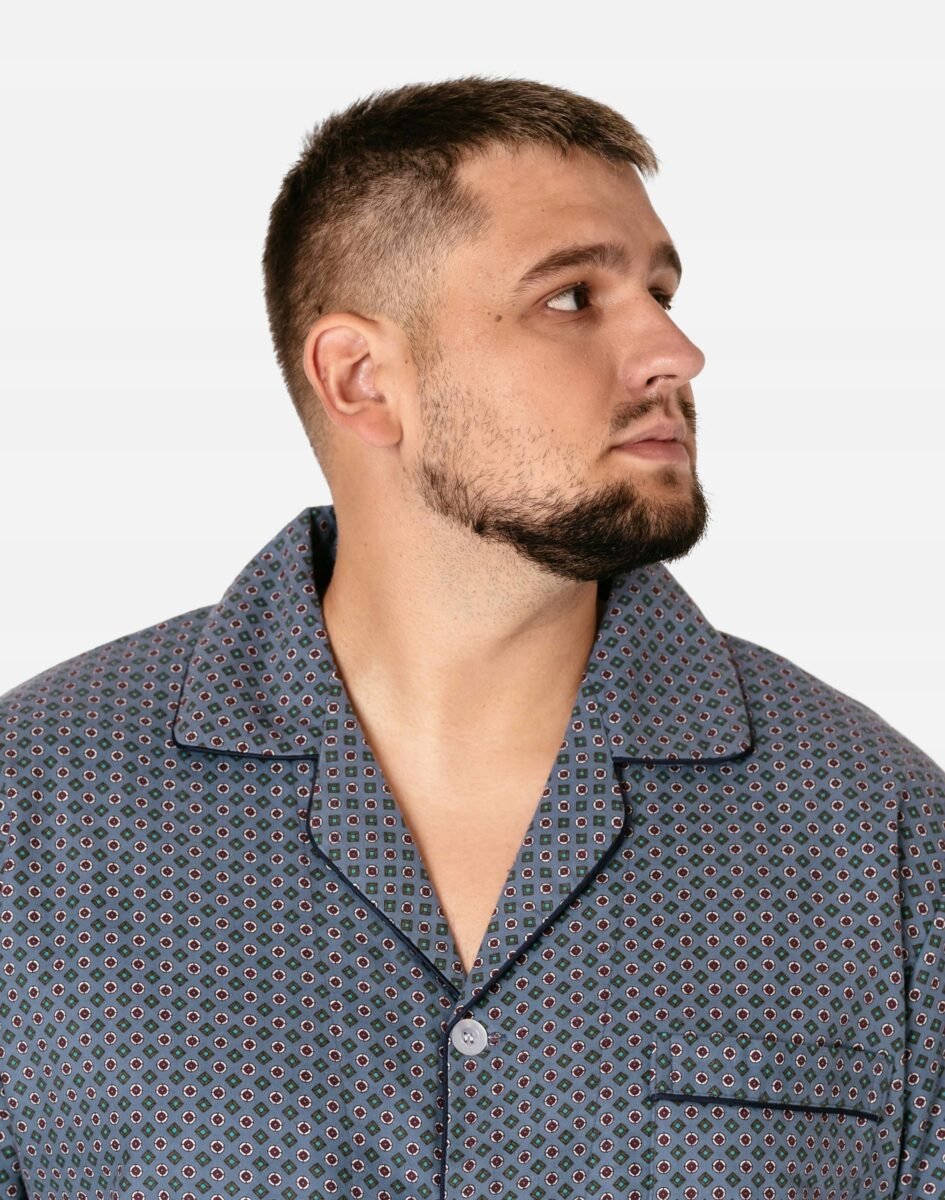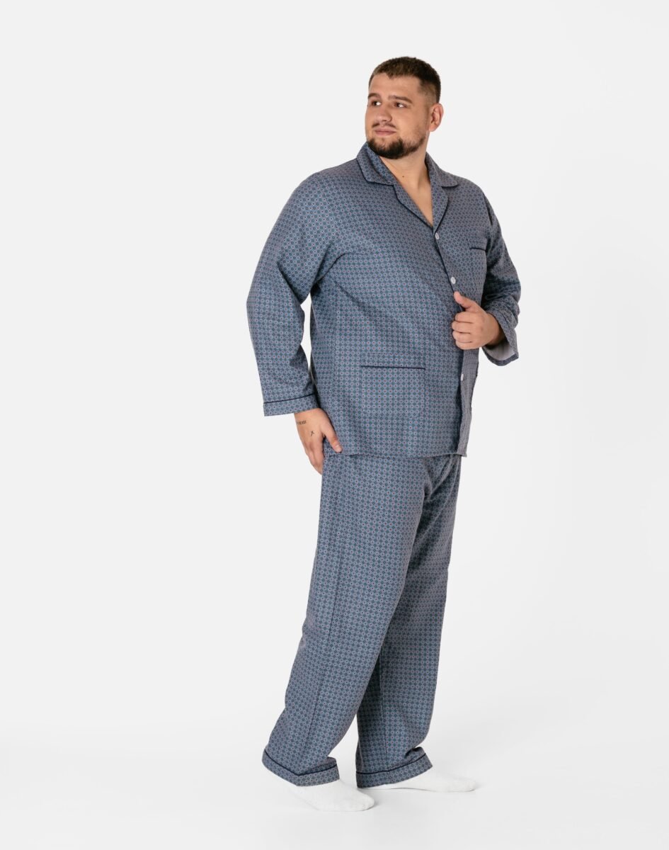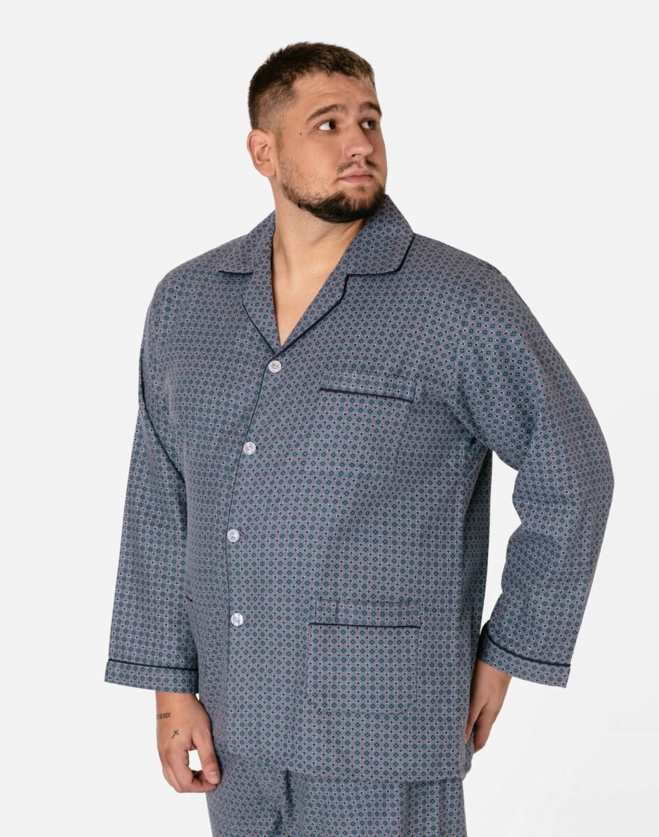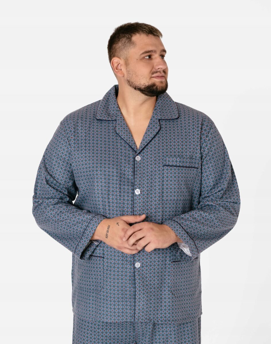 Ciepła, rozpinana, niezwykle przyjemna w dotyku (co ma bardzo duże znaczenie, gdy zakładamy ją na gołe ciało) dwuczęściowa piżama męska przeznaczona nie tylko jako nocna garderoba do snu ale także i do codziennego krzątania się po domu. Rozpinana konstrukcja z długim rękawem umożliwia łatwe zakładanie i zdejmowanie, dodając praktyczności do stylu. Długie spodnie bez kieszeni na elastycznej gumce z rozpinanym rozporkiem doskonale dopasowują się do sylwetki, zapewniając swobodę ruchów. Uszyta z bardzo dobrej jakości ciepłego flanelowego materiału bawełnianego, który przepuszcza powietrze, pozwala skórze oddychać i zapobiega poceniu się ciała zapewniając komfort w czasie snu.