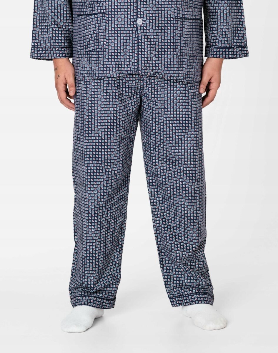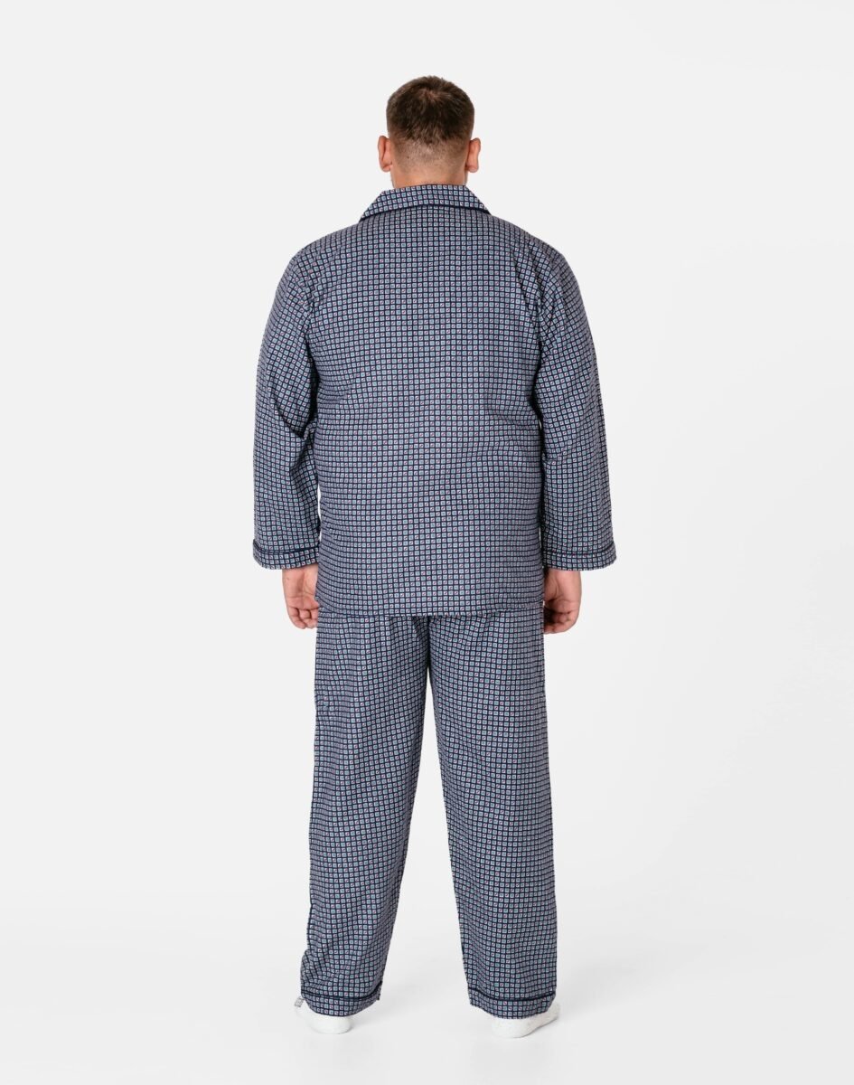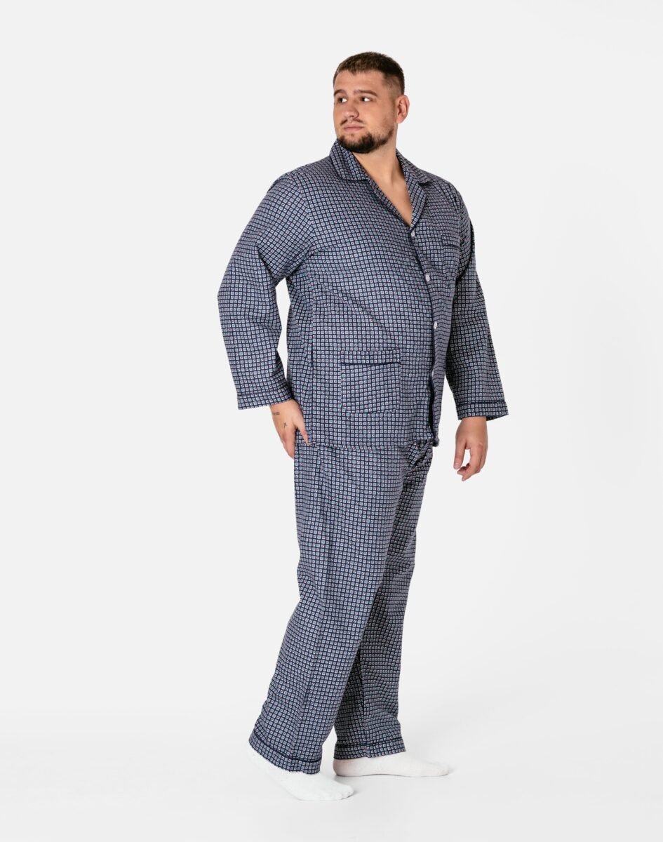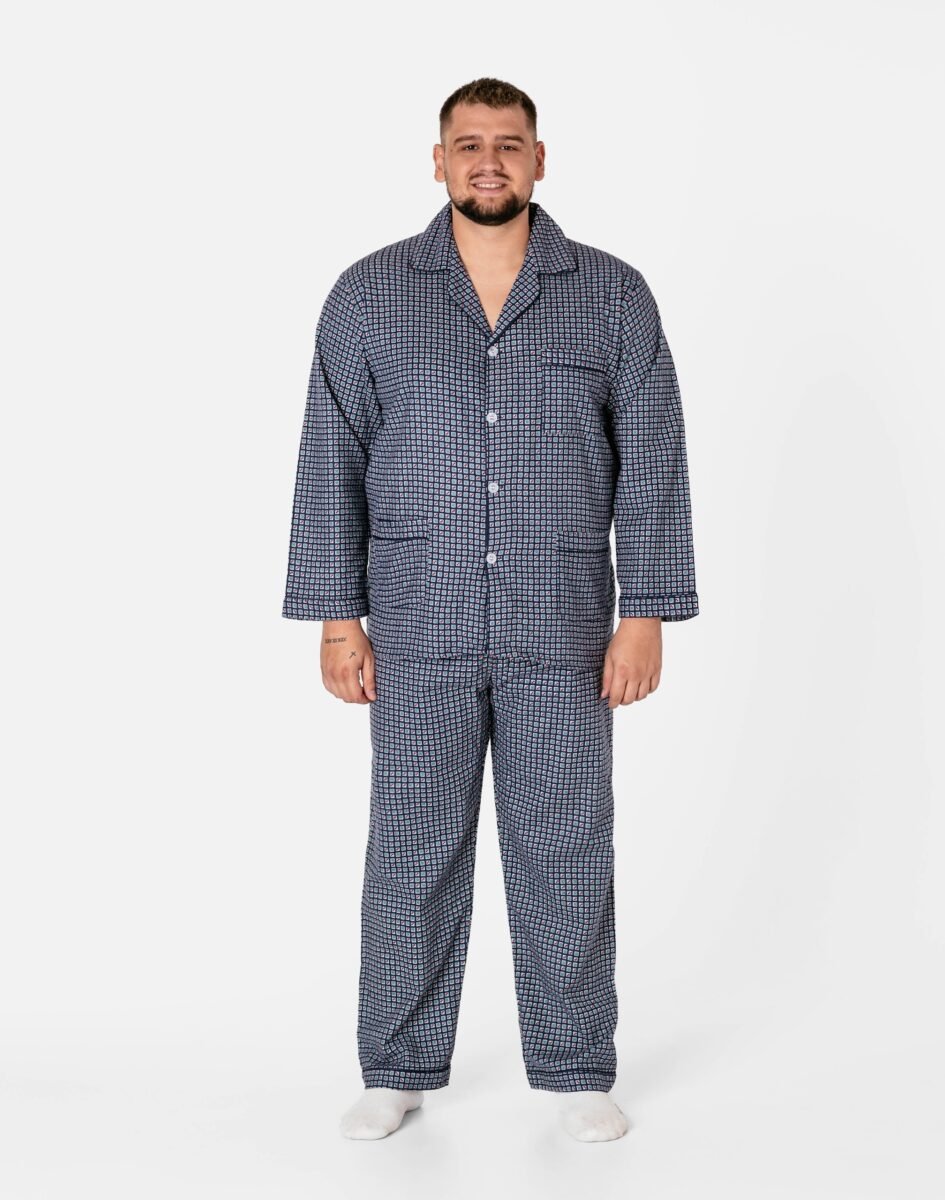 Ciepła, rozpinana, niezwykle przyjemna w dotyku (co ma bardzo duże znaczenie, gdy zakładamy ją na gołe ciało) dwuczęściowa piżama męska przeznaczona nie tylko jako nocna garderoba do snu ale także i do codziennego krzątania się po domu. Rozpinana konstrukcja z długim rękawem umożliwia łatwe zakładanie i zdejmowanie, dodając praktyczności do stylu. Długie spodnie bez kieszeni na elastycznej gumce z rozpinanym rozporkiem doskonale dopasowują się do sylwetki, zapewniając swobodę ruchów. Uszyta z bardzo dobrej jakości ciepłego flanelowego materiału bawełnianego, który przepuszcza powietrze, pozwala skórze oddychać i zapobiega poceniu się ciała zapewniając komfort w czasie snu.