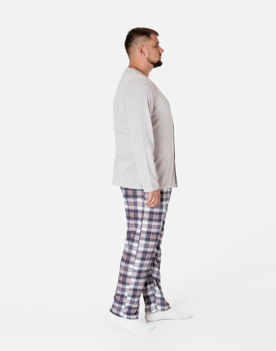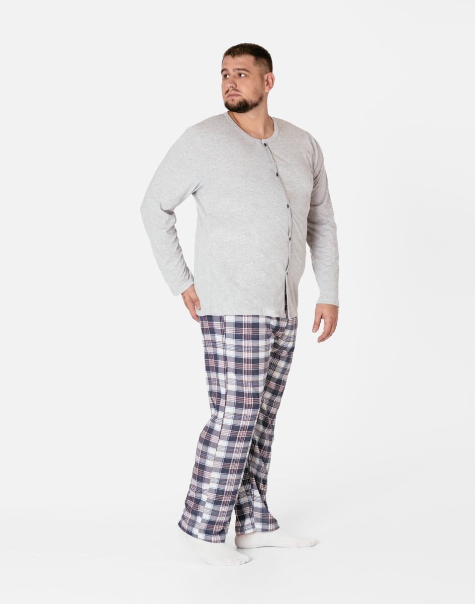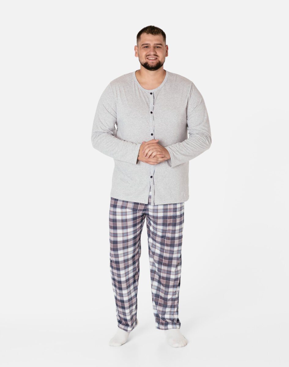 Bawełniana, rozpinana, niezwykle przyjemna w dotyku (co ma bardzo duże znaczenie, gdy zakładamy ją na gołe ciało) dwuczęściowa piżama męska przeznaczona nie tylko jako nocna garderoba do snu ale także i do codziennego krzątania się po domu. Luźny fason piżamy nie obciera skóry i pozwala na pełną swobodę ruchów. Rozpinana konstrukcja z długim rękawem umożliwia łatwe zakładanie i zdejmowanie, dodając praktyczności do stylu. Długie spodnie z wpuszczanymi kieszeniami na bokach i elastycznej gumce doskonale dopasowują się do sylwetki, zapewniając swobodę ruchów. Uszyta z bardzo dobrej jakości cienkiego materiału 100% bawełnianego, który zapewnia odpowiednią cyrkulację powietrza, pozwala skórze oddychać i zapobiega poceniu oraz przegrzewaniu się ciała, zapewniając długi i komfortowy sen.