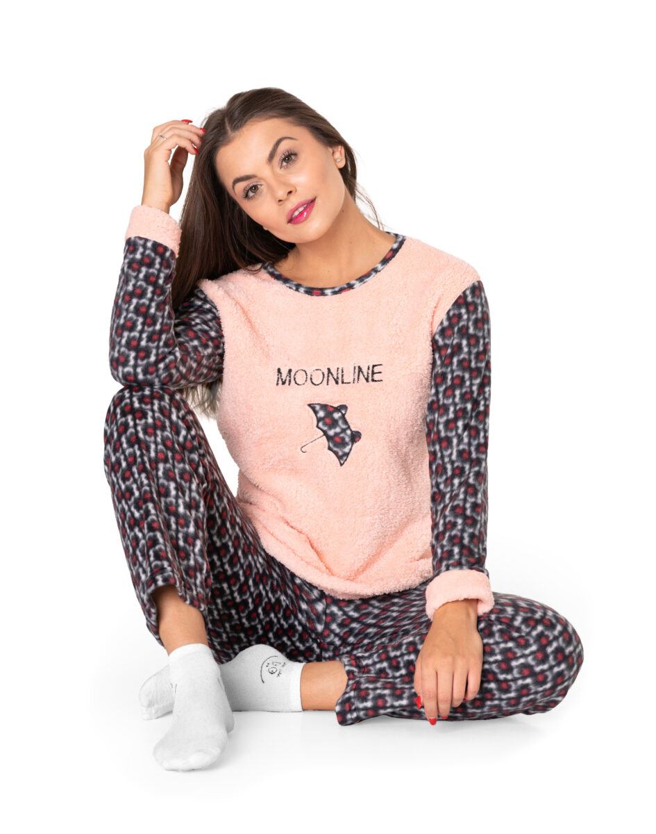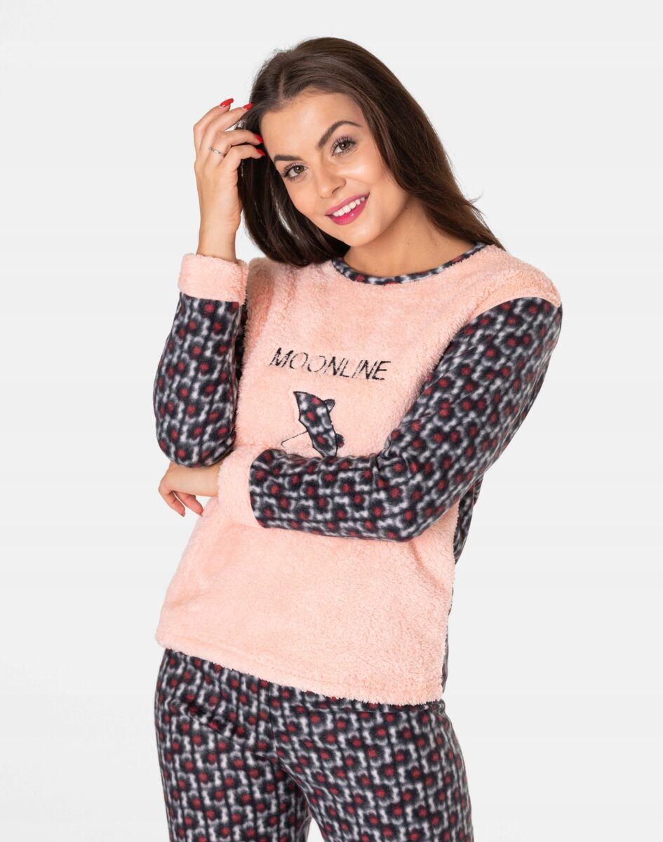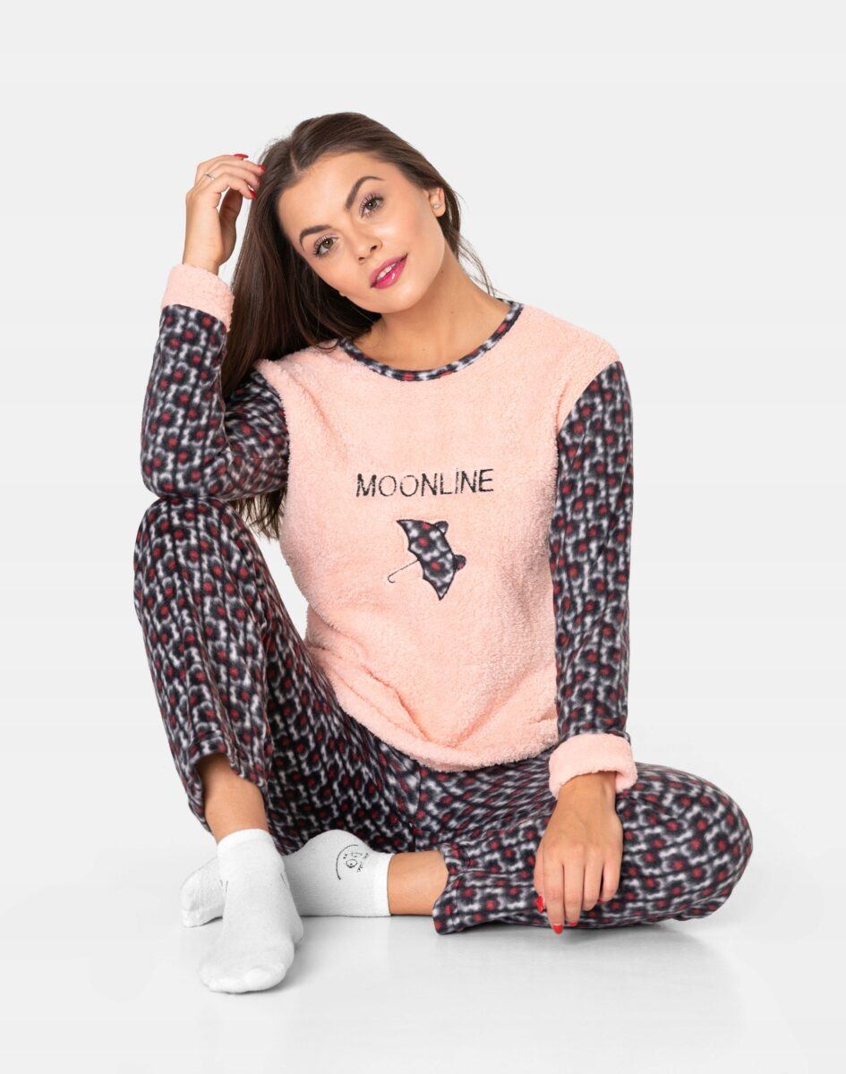 Ciepła, niezwykle przyjemna w dotyku (co ma bardzo duże znaczenie, gdy zakładamy ją na gołe ciało) dwuczęściowa piżamka polarowa damska przeznaczona nie tylko jako nocna garderoba do snu ale także do codziennego krzątania się po domu. Dwuczęściowa, uszyta z miękkiej, puszystej, przyjemnej w dotyku dzianiny polarowej i ciepłego futerka typu Wellsoft, łączącej w sobie skuteczną izolację przed zimnem oraz niską wagę. Jest wyjątkowo ciepła i skutecznie ogrzeje Twoje ciało nawet w najzimniejsze zimowe noce zapewniając komfort termiczny w czasie snu. Włókna polarowe tworzą miliony komórek powietrznych, które utrzymują ciepło wewnątrz zapewniając przez to doskonałą ochronę przed chłodem. Dodatkową zaletą piżamy z polaru jest to, że wysycha w bardzo szybkim tempie. Piżamka jest przez to bardzo ciepła, wygodna i oddychająca (utrzymuje ciepły i suchy mikroklimat skóry) a jednocześnie wyjątkowo lekka. Dzięki tym właściwościom skóra naturalnie oddycha natomiast mikroskopijne torebki powietrza w strukturze materiału utrzymują właściwą ciepłotę ciała. Zapewnia bardzo wysoki współczynnik ochrony termicznej w stosunku do wagi w porównaniu do innych np. frotowych czy welurowych piżam. Dołączona opaska na oczy ułatwia szybkie zasypianie, zapewnia spokojny głęboki sen a poranne promienie słońca nie rozbudzają. Dzięki opasce Twój sen może trwać znacznie dłużej nawet gdy dzień już w pełni.