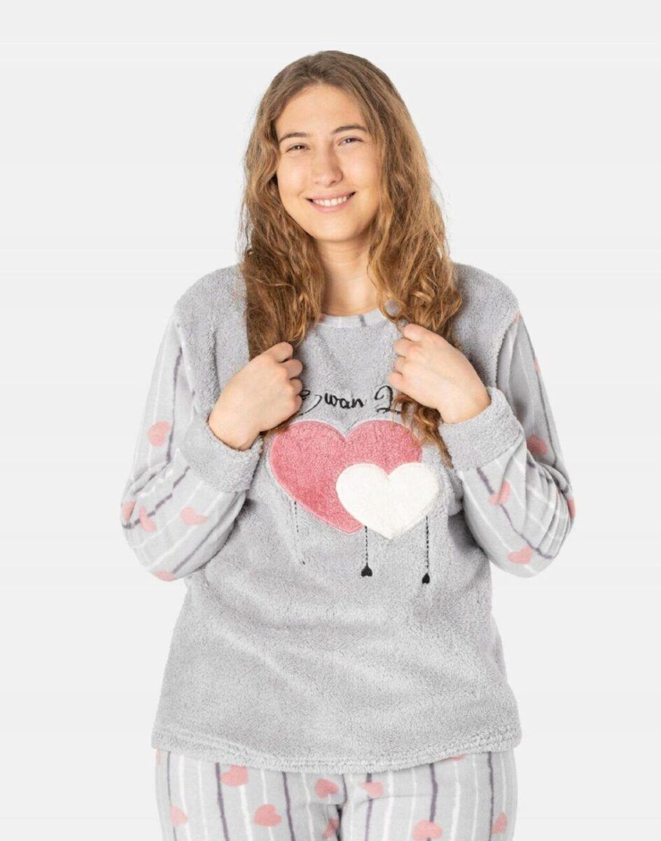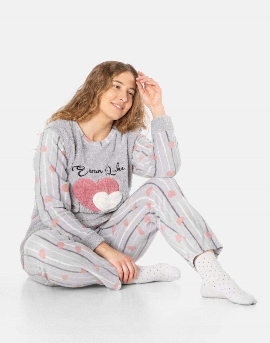 Ciepła, niezwykle przyjemna w dotyku (co ma bardzo duże znaczenie, gdy zakładamy ją na gołe ciało) dwuczęściowa piżamka polarowa damska przeznaczona nie tylko jako nocna garderoba do snu ale także i do codziennego krzątania się po domu. Dwuczęściowa uszyta z bardzo dobrej jakości dzianiny polarowej i ciepłego futerka typu Wellsoft na przodzie koszulki, łączącej w sobie skuteczną izolację przed zimnem oraz niską wagę. Jest bardzo ciepła i skutecznie ogrzeje Twoje ciało nawet w najzimniejsze grudniowe noce zapewniając komfort w czasie snu. Włókna polarowe tworzą miliony komórek powietrznych które utrzymują ciepło wewnątrz zapewniając przez to doskonałą ochronę przed chłodem. Dodatkową zaletą piżamy z polaru jest to, że wysycha w bardzo szybkim tempie, nie zatrzymuje w sobie wilgoci lecz pozwalają jej wyparować na zewnątrz a sama tkanina pozostaje sucha. Piżamka jest przez to bardzo ciepła, wygodna i oddychająca (utrzymuje ciepły i suchy mikroklimat skóry) a jednocześnie wyjątkowo lekka. Dzięki tym właściwościom skóra naturalnie oddycha natomiast mikroskopijne torebki powietrza w strukturze materiału utrzymują właściwą ciepłotę ciała. Zapewnia bardzo wysoki współczynnik ochrony termicznej w stosunku do wagi w porównaniu do bawełnianych czy frottowych piżam. Nieodzowna w długie chłodne wieczory, noce czy też poranki bo może także posłużyć jako ciepły, domowy dres. Dołączona do piżamki opaska na oczy ułatwia szybkie zasypianie, zapewnia spokojny głęboki sen a poranne promienie słońca nie rozbudzają. Dzięki opasce Twój sen może trwać znacznie dłużej nawet gdy dzień już w pełni. Idealna nie tylko na chłodniejsze noce, ale także sprawdza się po kąpieli, po pobycie w saunie, rano przy krzątaniu się po mieszkaniu lub jako strój odpowiedni podczas wieczornego wypoczynku z NETFLIXEM przed telewizorem i zrelaksowania się po wielu godzinach spędzonych w pracy.