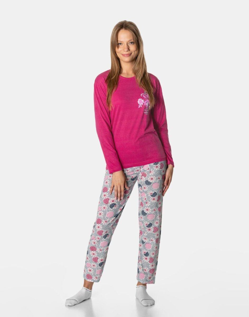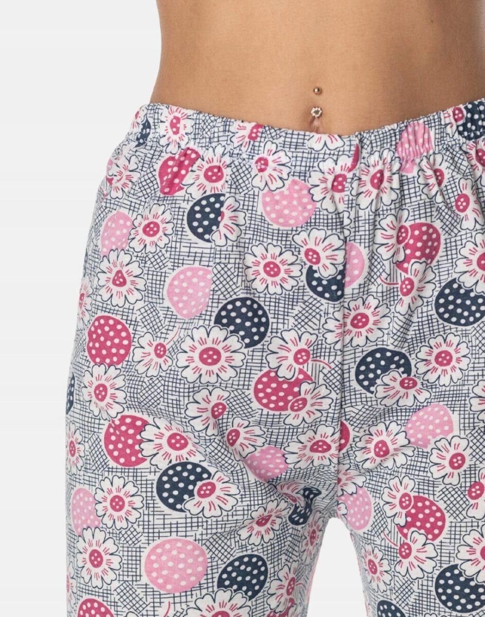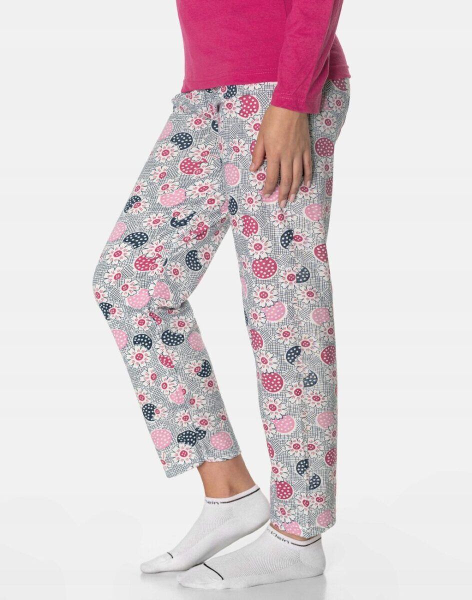 Bawełniana przyjemna w dotyku dwuczęściowa piżamka damska, w której nie tylko wygodnie i przyjemnie się śpi, ale także z chęcią spędza się czas w domu. Uszyta z bardzo dobrej jakości materiału bawełnianego średniej grubości, który zapewnia odpowiednią cyrkulację powietrza, pozwala skórze oddychać i zapobiega poceniu się ciała, zapewniając długi i komfortowy sen. Luźny fason piżamki nie obciera skóry i pozwala na pełną swobodę ruchów. Nieodzowna wieczorem, w nocy czy też porankiem delikatnie otulając nasze ciało. Idealna nie tylko wieczorem ułatwiając szybkie zasypianie, ale także sprawdza się po kąpieli, po pobycie w saunie, rano przy krzątaniu się po mieszkaniu lub jako strój odpowiedni podczas wieczornego wypoczynku przed telewizorem i zrelaksowania się po wielu godzinach spędzonych w ciężkiej pracy.