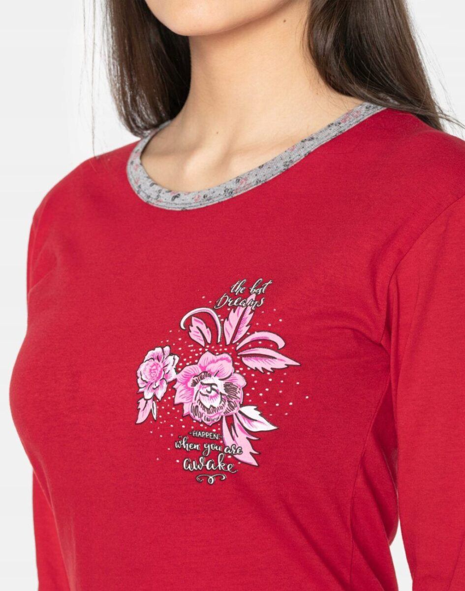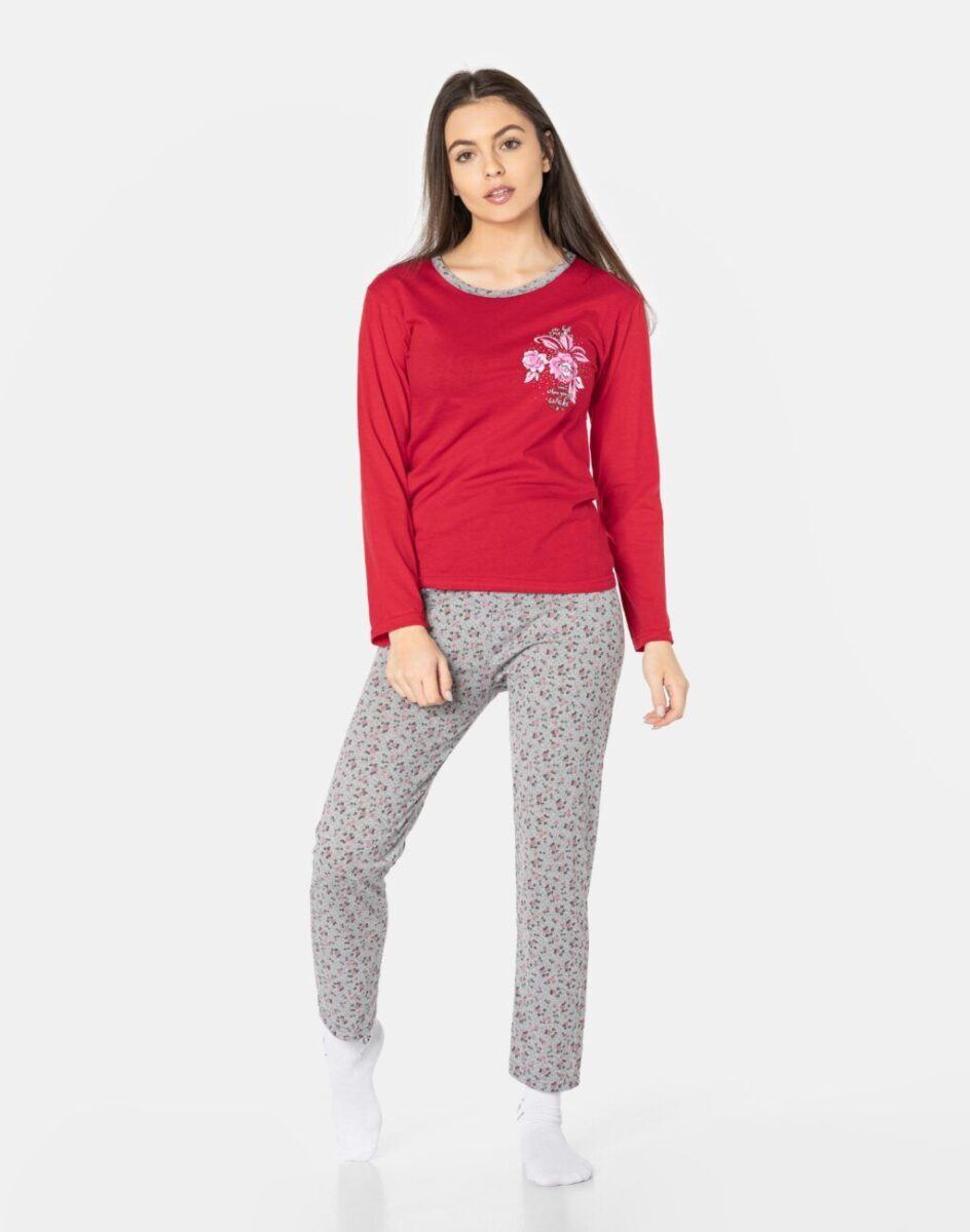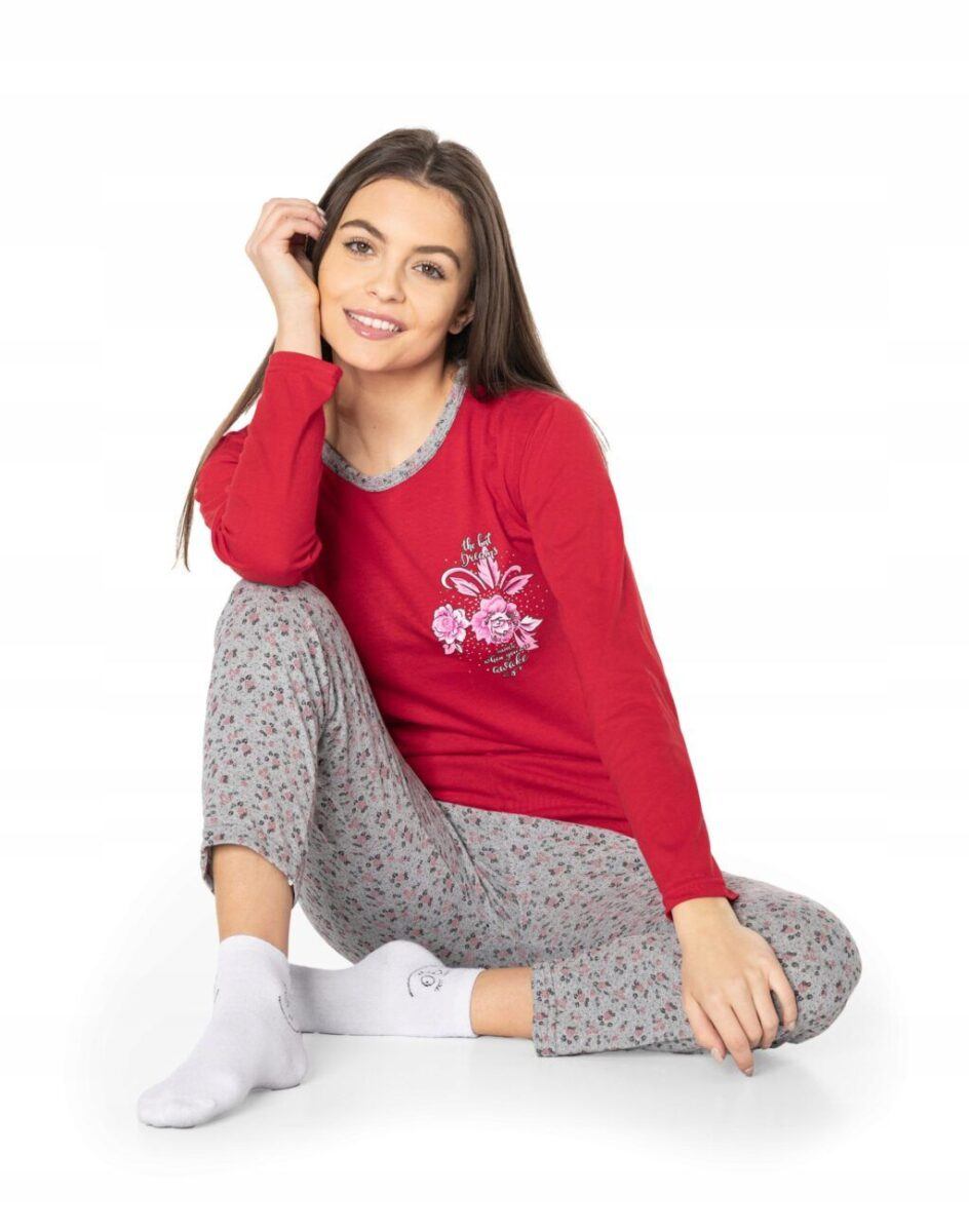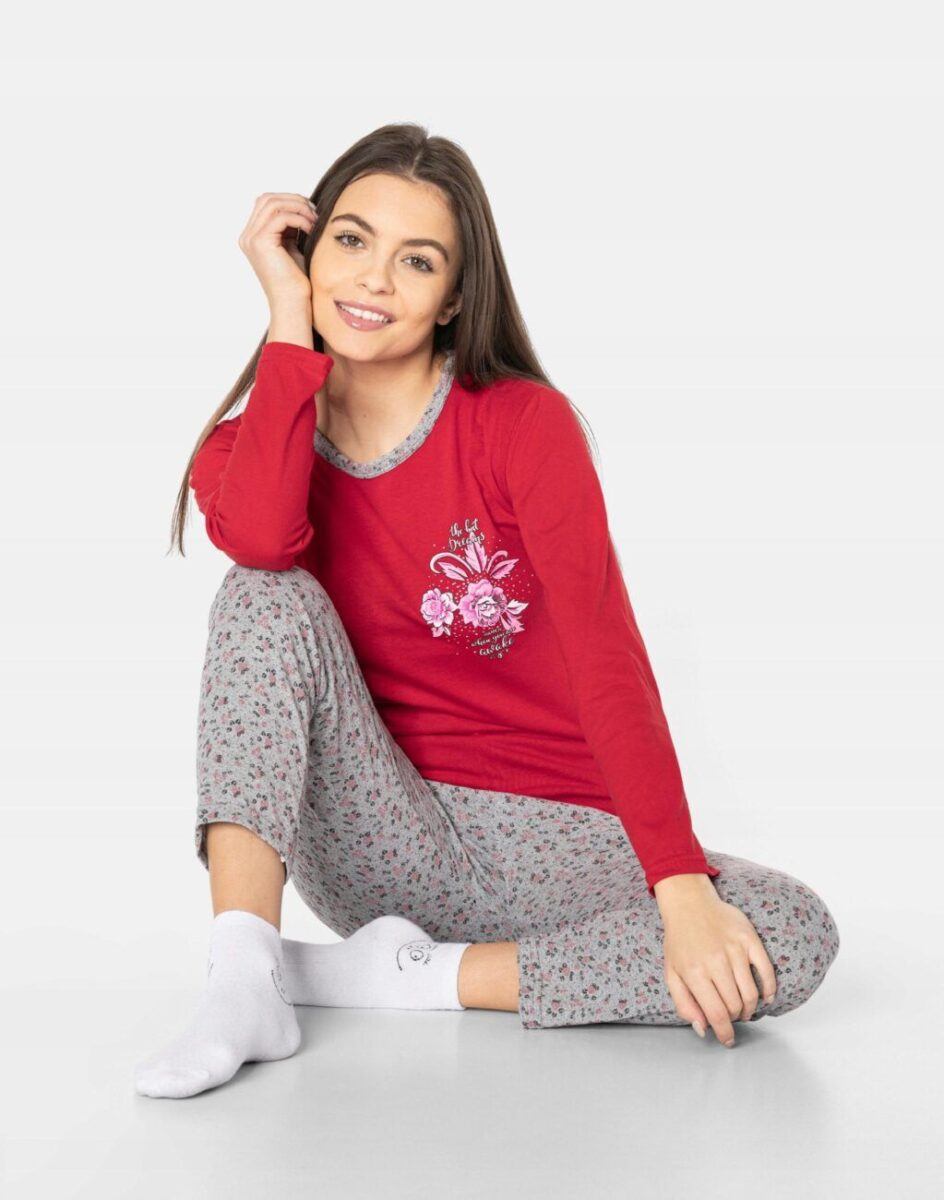 Bawełniana przyjemna w dotyku dwuczęściowa piżamka damska, w której nie tylko wygodnie i przyjemnie się śpi, ale także z chęcią spędza się czas w domu. Uszyta z bardzo dobrej jakości materiału bawełnianego średniej grubości, który zapewnia odpowiednią cyrkulację powietrza, pozwala skórze oddychać i zapobiega poceniu się ciała, zapewniając długi i komfortowy sen. Luźny fason piżamki nie obciera skóry i pozwala na pełną swobodę ruchów. Nieodzowna wieczorem, w nocy czy też porankiem delikatnie otulając nasze ciało. Idealna nie tylko wieczorem ułatwiając szybkie zasypianie, ale także sprawdza się po kąpieli, po pobycie w saunie, rano przy krzątaniu się po mieszkaniu lub jako strój odpowiedni podczas wieczornego wypoczynku przed telewizorem i zrelaksowania się po wielu godzinach spędzonych w ciężkiej pracy.