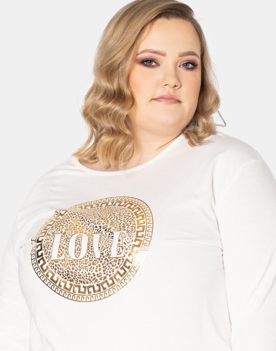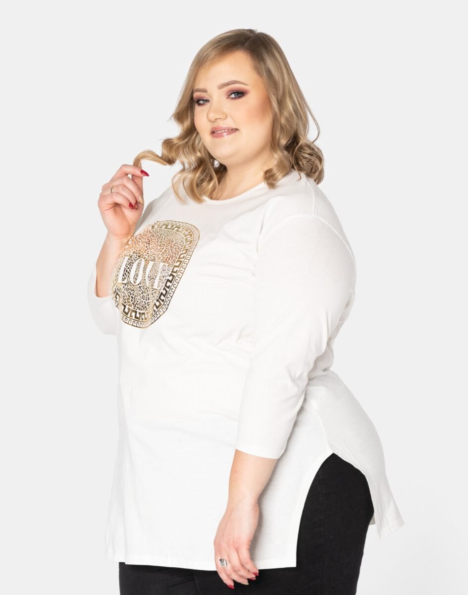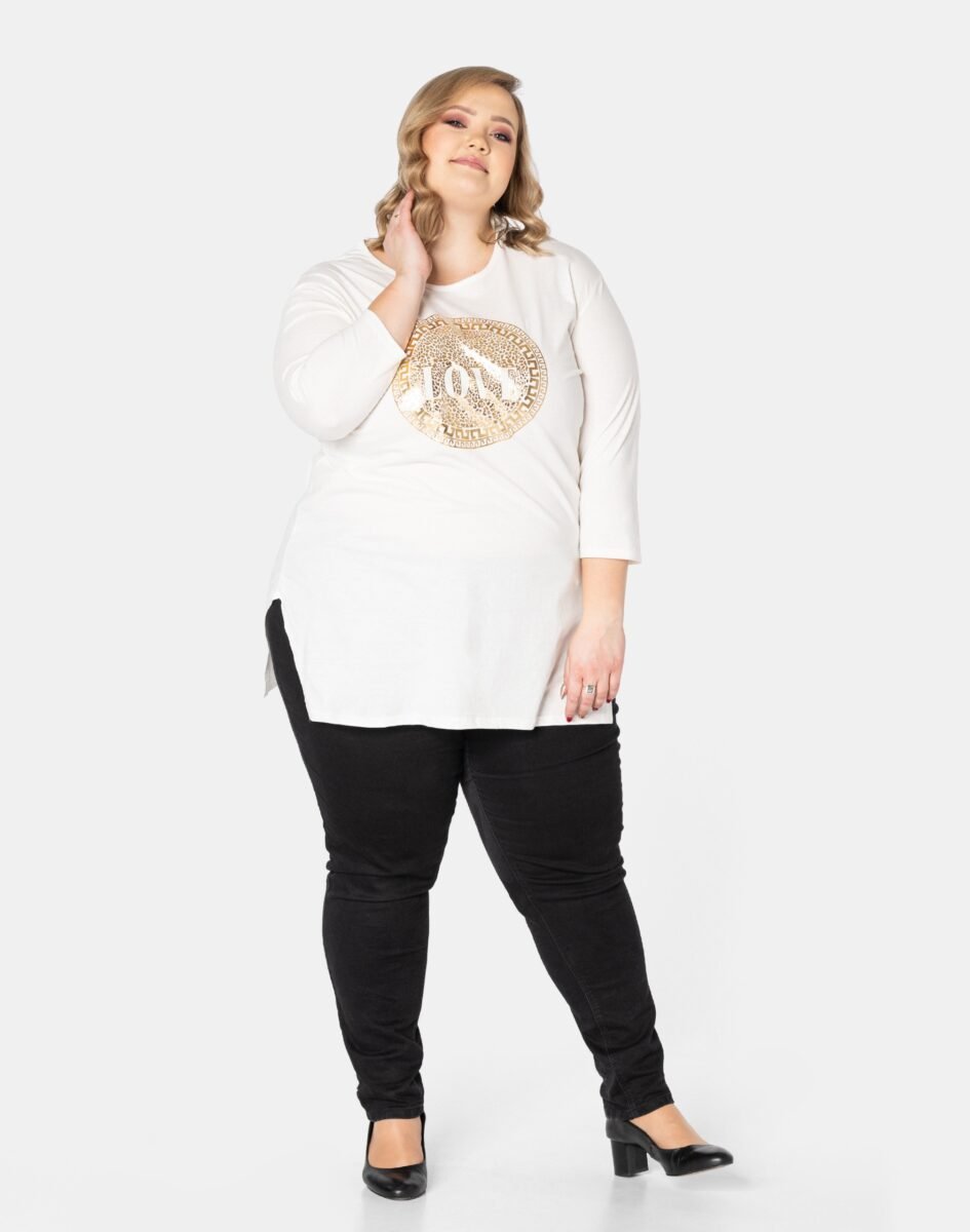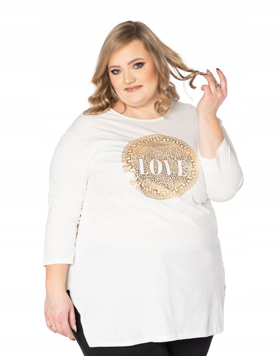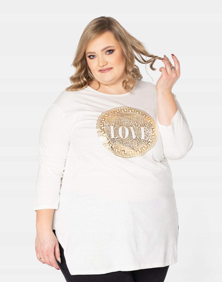 Efektowna bluzka damska, wyprodukowana z wysokiej jakości miękkiej, miłej w dotyku i przyjemnej dla ciała dzianiny bawełnianej. To idealny wybór dla każdej kobiety, bo niezależnie od typu figury, wieku, czy rozmiaru jaki nosisz zawsze będziesz w niej wyglądać elegancko, kobieco i atrakcyjnie. Klasyczna, wkładana przez głowę z luźnym rękawem 3/4, ozdobiona z przodu efektownym firmowym nadrukiem. Możesz ją śmiało nosić do eleganckich spodni, spódnic czy też na sportowo do legginsów. Bluzkę w tym kolorze możesz założyć niemal do każdej stylizacji. Tworzy doskonałe zestawienie z wąskimi spodniami (rurki, cygaretki), dopasowanymi dżinsami i jest świetnym uzupełnieniem casualowych stylizacji. Elegancki i prosty krój fantastycznie pasować będzie do pracy, jak i na wieczorne wyjście z przyjaciółmi.