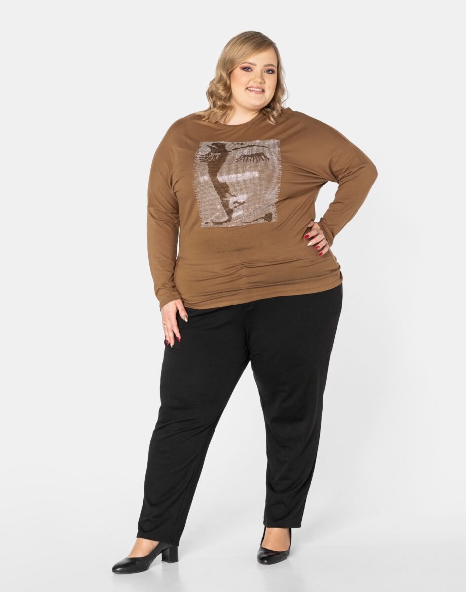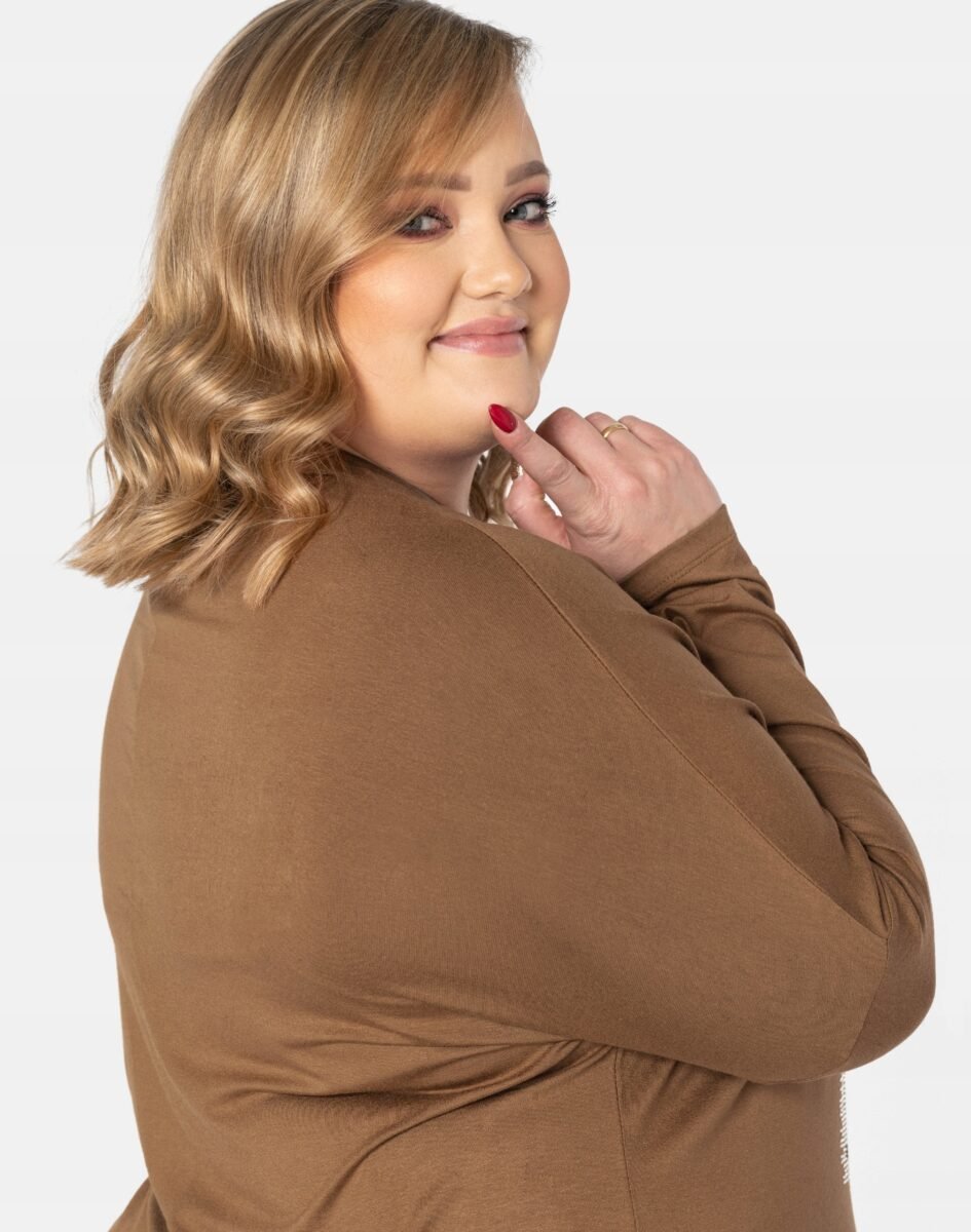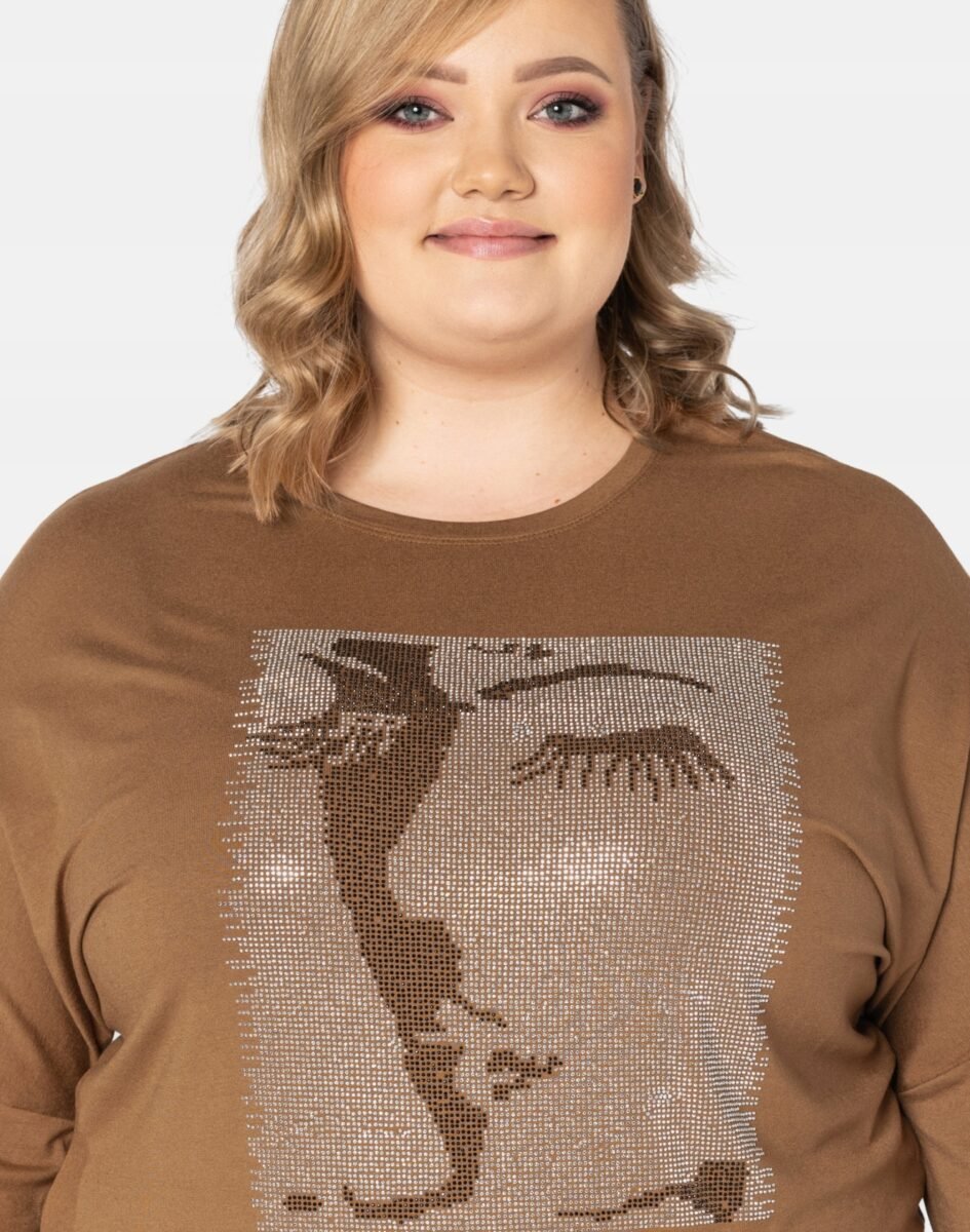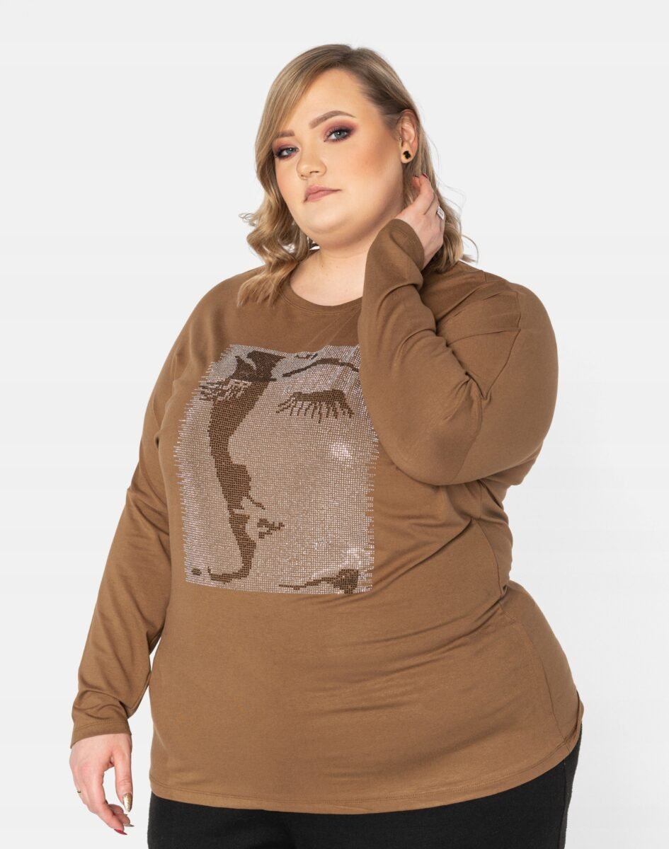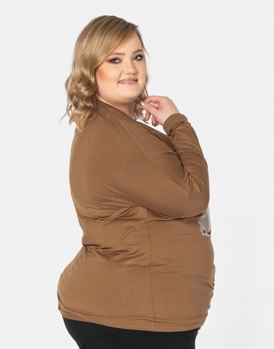 Efektowna bluzka damska, wyprodukowana z wysokiej jakości miękkiej, miłej w dotyku i przyjemnej dla ciała dzianiny bawełnianej. To idealny wybór dla każdej kobiety, bo niezależnie od typu figury, wieku, czy rozmiaru jaki nosisz zawsze będziesz w niej wyglądać elegancko, kobieco i atrakcyjnie. Klasyczna, wkładana przez głowę z długimi prostymi rękawami, ozdobiona z przodu efektowną aplikacją, wyłożoną delikatnymi cyrkoniami. Możesz ją śmiało nosić do eleganckich spodni, spódnic czy też na sportowo do legginsów. Bluzkę w tym kolorze możesz założyć niemal do każdej stylizacji. Tworzy doskonałe zestawienie z wąskimi spodniami (rurki, cygaretki), dopasowanymi dżinsami i jest świetnym uzupełnieniem casualowych stylizacji. Elegancki i prosty krój fantastycznie pasować będzie do pracy, jak i na wieczorne wyjście z przyjaciółmi.