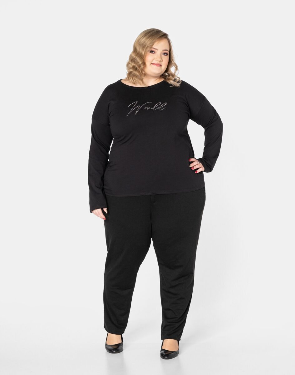Efektowna bluzka damska, wyprodukowana z wysokiej jakości miękkiej, miłej w dotyku i przyjemnej dla ciała dzianiny bawełnianej. To idealny wybór dla każdej kobiety, bo niezależnie od typu figury, wieku, czy rozmiaru jaki nosisz zawsze będziesz w niej wyglądać elegancko, kobieco i atrakcyjnie. Klasyczna, wkładana przez głowę z długimi prostymi rękawami, ozdobiona z przodu efektowną aplikacją, wyłożoną delikatnymi cyrkoniami. Możesz ją śmiało nosić do eleganckich spodni, spódnic czy też na sportowo do legginsów. Bluzkę w tym kolorze możesz założyć niemal do każdej stylizacji. Tworzy doskonałe zestawienie z wąskimi spodniami (rurki, cygaretki), dopasowanymi dżinsami i jest świetnym uzupełnieniem casualowych stylizacji. Elegancki i prosty krój fantastycznie pasować będzie do pracy, jak i na wieczorne wyjście z przyjaciółmi.