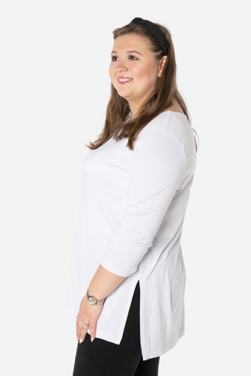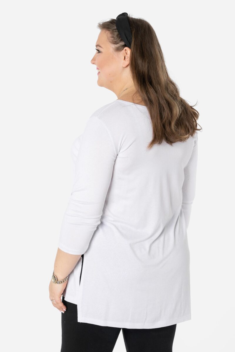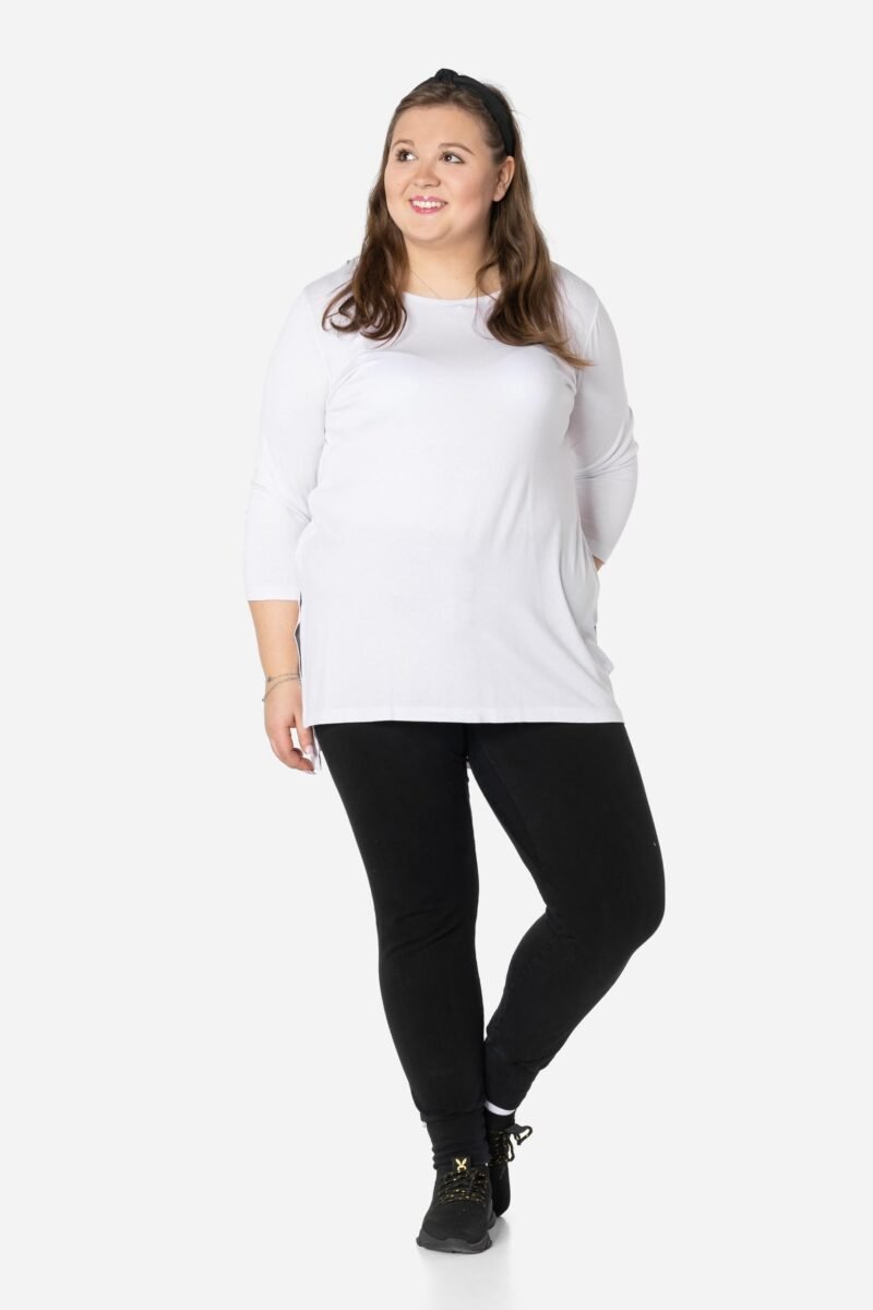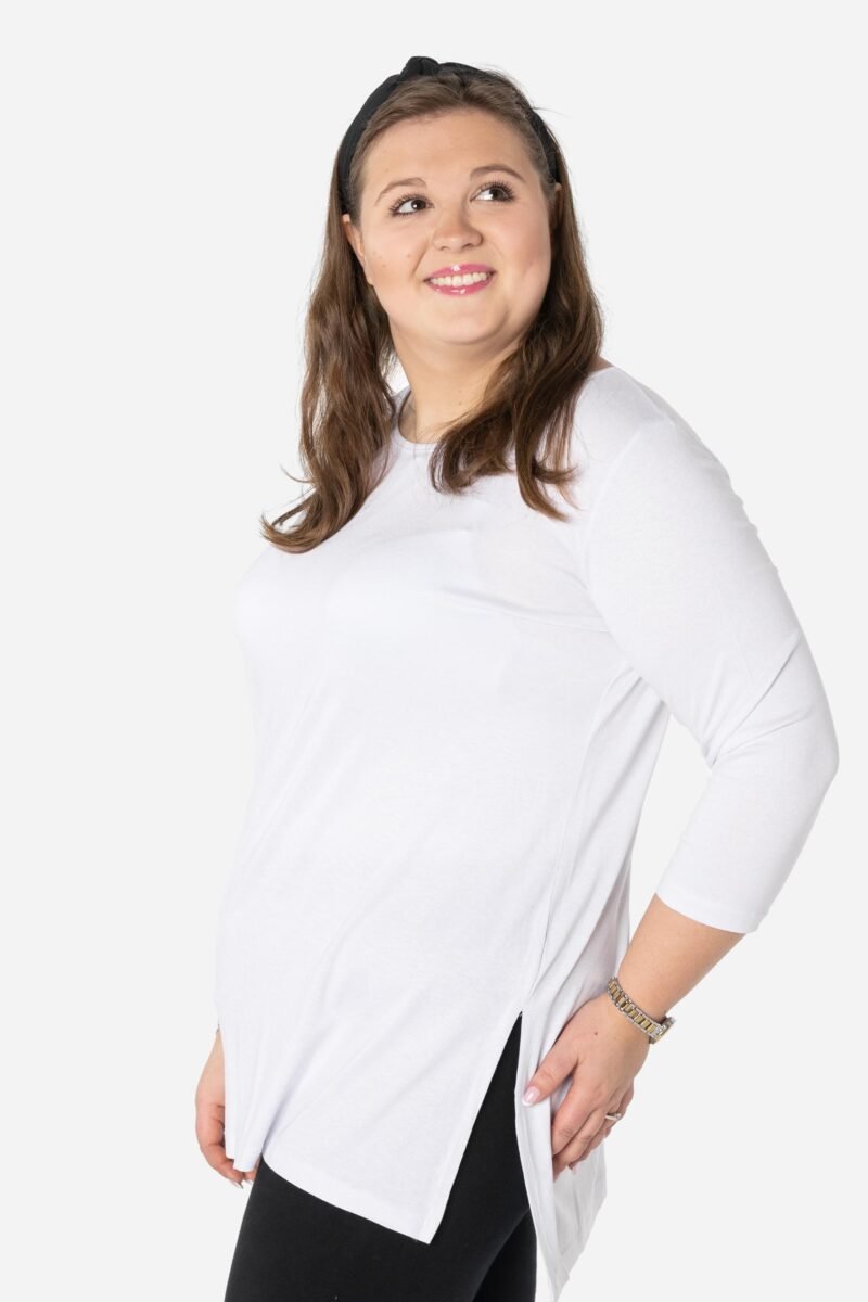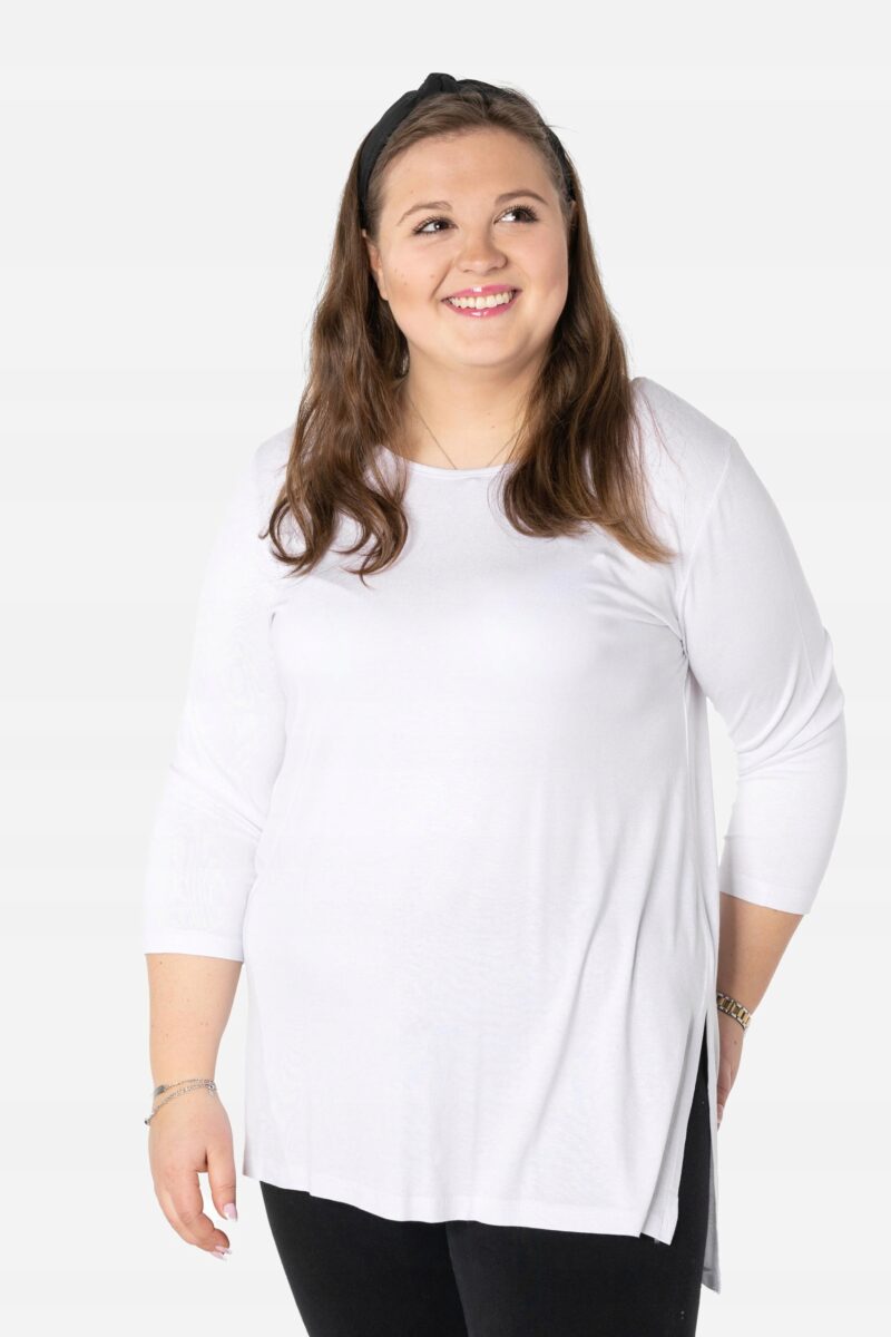 Efektowna długa bluzka/tunika damska, wyprodukowana z wysokiej jakości elastycznej, miłej w dotyku i przyjemnej dla ciała cienkiej dzianiny wiskozowej z niewielkim dodatkiem lycry (elastan) zapewniającej maksymalną wygodę i komfort użytkowania. To idealny wybór dla każdej kobiety, bo niezależnie od typu figury, wieku, czy rozmiaru jaki nosisz zawsze będziesz w niej wyglądać elegancko, kobieco i atrakcyjnie. Klasyczna, gładka, wkładana przez głowę z okrągłym dekoltem i rękawami 3/4. Długość midi która z powodzeniem zakrywa biodra. Dół bluzki szeroki, luźny z rozcięciami na bokach. Możesz ją śmiało nosić do eleganckich spodni, spódnic czy też na sportowo do legginsów. Tworzy doskonałe zestawienie z wąskimi spodniami (rurki, cygaretki), dopasowanymi dżinsami bo spodnie powinny stanowić przeciwwagę do obszernej bluzki/tuniki. Elegancki, prosty i luźny krój fantastycznie pasować będzie zarówno do pracy, jak i na wieczorne wyjście z przyjaciółmi. Uratuje cię w sytuacji, gdy nie będziesz miała czasu na wymyślanie, w co się ubrać.