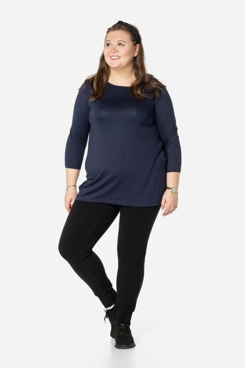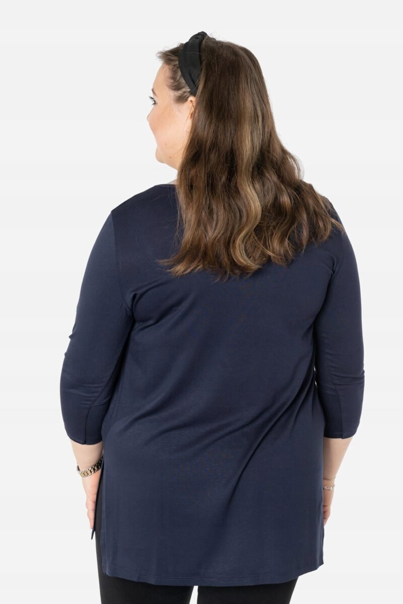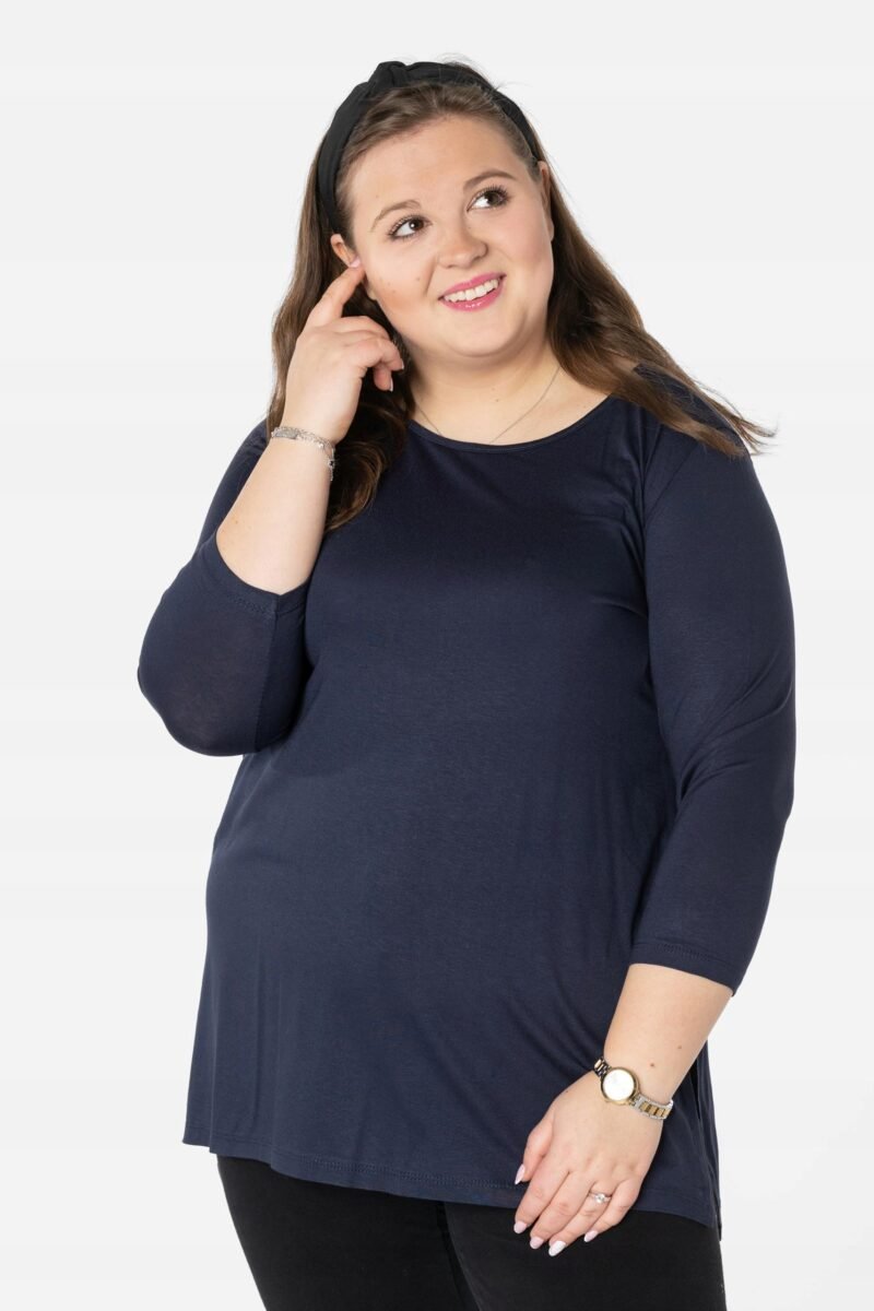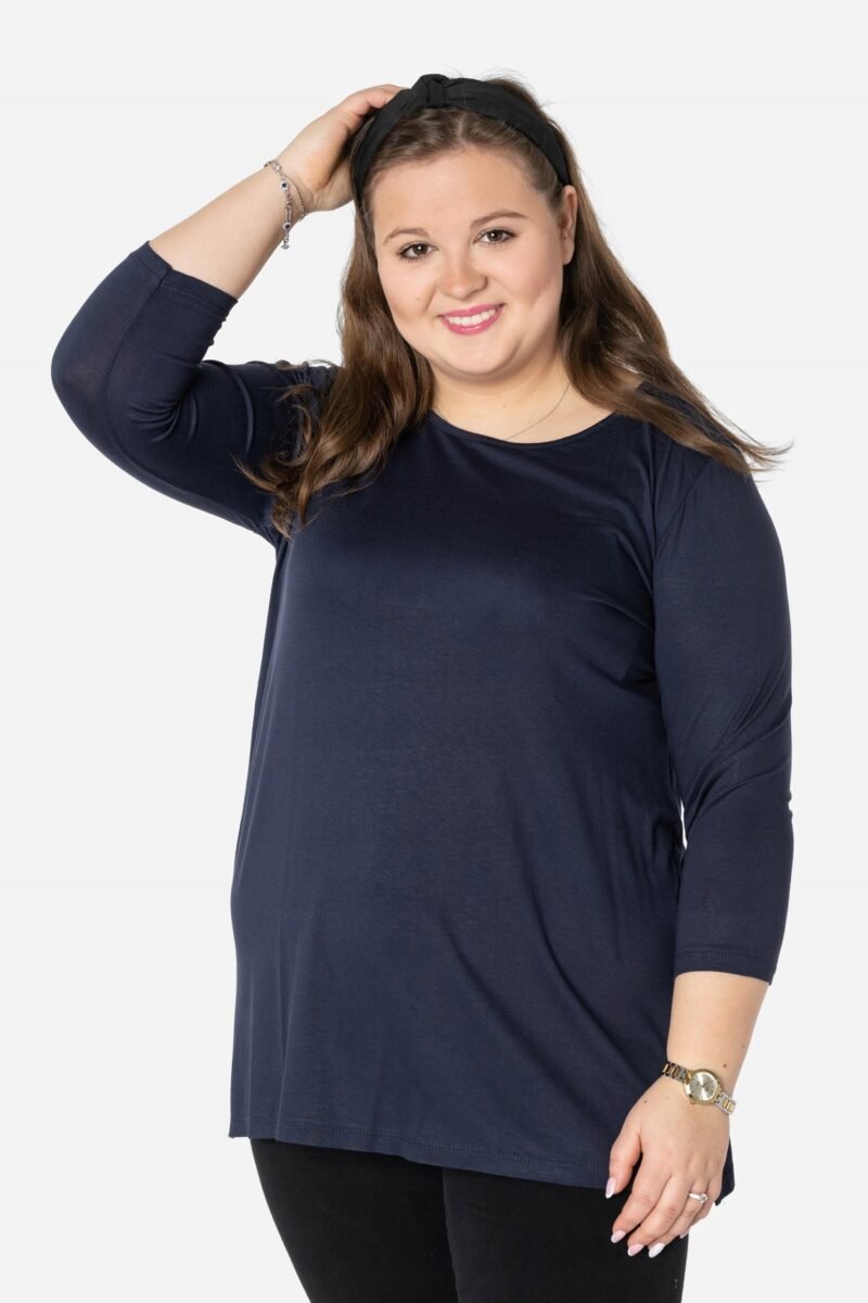 Efektowna długa bluzka/tunika damska, wyprodukowana z wysokiej jakości elastycznej, miłej w dotyku i przyjemnej dla ciała cienkiej dzianiny wiskozowej z niewielkim dodatkiem lycry (elastan) zapewniającej maksymalną wygodę i komfort użytkowania. To idealny wybór dla każdej kobiety, bo niezależnie od typu figury, wieku, czy rozmiaru jaki nosisz zawsze będziesz w niej wyglądać elegancko, kobieco i atrakcyjnie. Klasyczna, gładka, wkładana przez głowę z okrągłym dekoltem i rękawami 3/4. Długość midi która z powodzeniem zakrywa biodra. Dół bluzki szeroki, luźny z rozcięciami na bokach. Możesz ją śmiało nosić do eleganckich spodni, spódnic czy też na sportowo do legginsów. Tworzy doskonałe zestawienie z wąskimi spodniami (rurki, cygaretki), dopasowanymi dżinsami bo spodnie powinny stanowić przeciwwagę do obszernej bluzki/tuniki. Elegancki, prosty i luźny krój fantastycznie pasować będzie zarówno do pracy, jak i na wieczorne wyjście z przyjaciółmi. Uratuje cię w sytuacji, gdy nie będziesz miała czasu na wymyślanie, w co się ubrać.