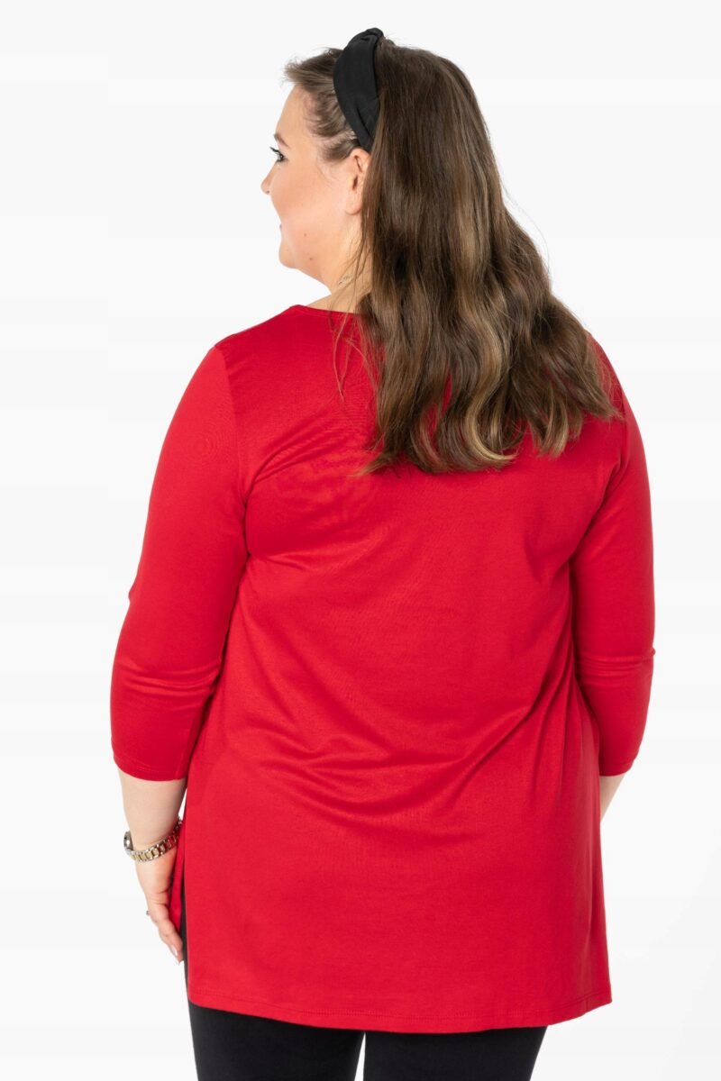 Efektowna długa bluzka/tunika damska, wyprodukowana z wysokiej jakości elastycznej, miłej w dotyku i przyjemnej dla ciała cienkiej dzianiny wiskozowej z niewielkim dodatkiem lycry (elastan) zapewniającej maksymalną wygodę i komfort użytkowania. To idealny wybór dla każdej kobiety, bo niezależnie od typu figury, wieku, czy rozmiaru jaki nosisz zawsze będziesz w niej wyglądać elegancko, kobieco i atrakcyjnie. Klasyczna, gładka, wkładana przez głowę z okrągłym dekoltem i rękawami 3/4. Długość midi która z powodzeniem zakrywa biodra. Dół bluzki szeroki, luźny z rozcięciami na bokach. Możesz ją śmiało nosić do eleganckich spodni, spódnic czy też na sportowo do legginsów. Tworzy doskonałe zestawienie z wąskimi spodniami (rurki, cygaretki), dopasowanymi dżinsami bo spodnie powinny stanowić przeciwwagę do obszernej bluzki/tuniki. Elegancki, prosty i luźny krój fantastycznie pasować będzie zarówno do pracy, jak i na wieczorne wyjście z przyjaciółmi. Uratuje cię w sytuacji, gdy nie będziesz miała czasu na wymyślanie, w co się ubrać.