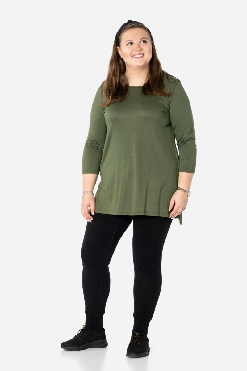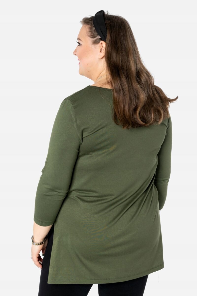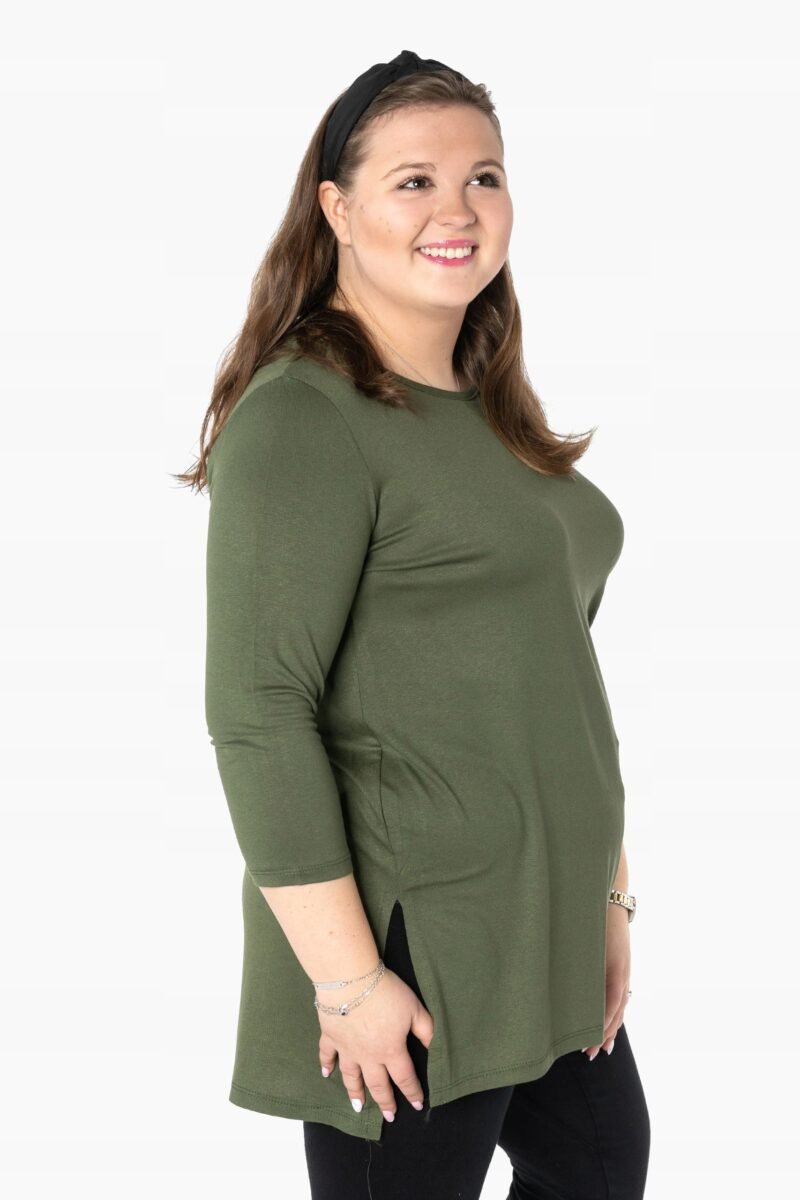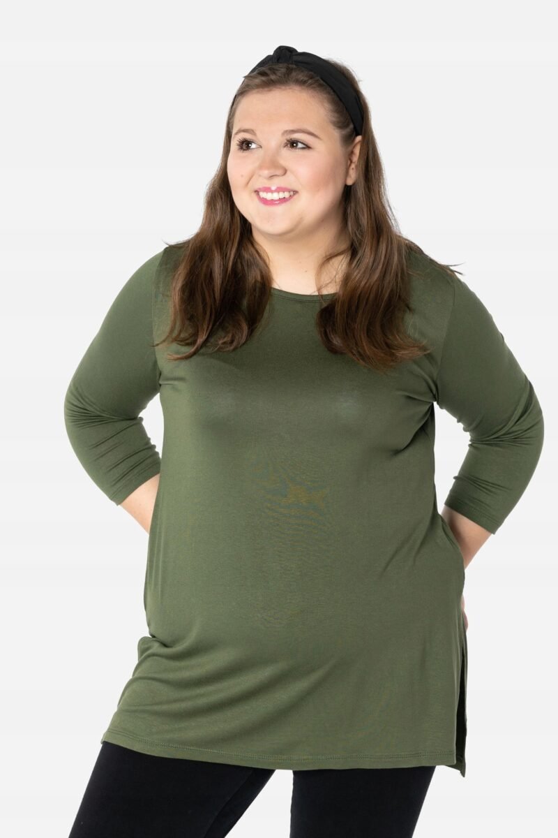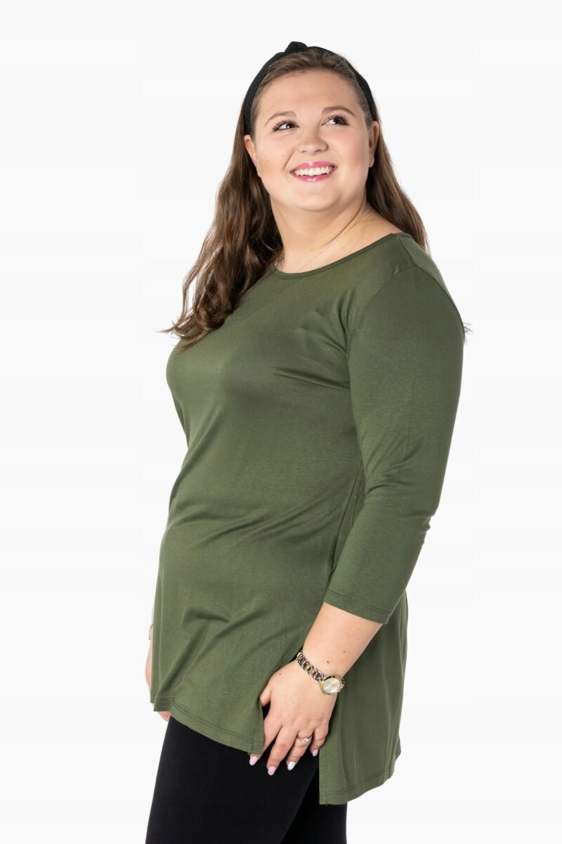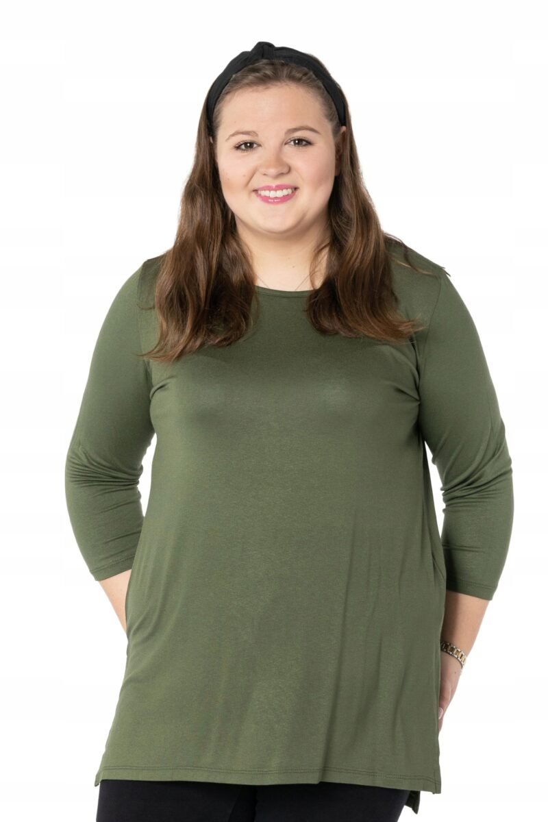 Efektowna długa bluzka/tunika damska, wyprodukowana z wysokiej jakości elastycznej, miłej w dotyku i przyjemnej dla ciała cienkiej dzianiny wiskozowej z niewielkim dodatkiem lycry (elastan) zapewniającej maksymalną wygodę i komfort użytkowania. To idealny wybór dla każdej kobiety, bo niezależnie od typu figury, wieku, czy rozmiaru jaki nosisz zawsze będziesz w niej wyglądać elegancko, kobieco i atrakcyjnie. Klasyczna, gładka, wkładana przez głowę z okrągłym dekoltem i rękawami 3/4. Długość midi która z powodzeniem zakrywa biodra. Dół bluzki szeroki, luźny z rozcięciami na bokach. Możesz ją śmiało nosić do eleganckich spodni, spódnic czy też na sportowo do legginsów. Tworzy doskonałe zestawienie z wąskimi spodniami (rurki, cygaretki), dopasowanymi dżinsami bo spodnie powinny stanowić przeciwwagę do obszernej bluzki/tuniki. Elegancki, prosty i luźny krój fantastycznie pasować będzie zarówno do pracy, jak i na wieczorne wyjście z przyjaciółmi. Uratuje cię w sytuacji, gdy nie będziesz miała czasu na wymyślanie, w co się ubrać.