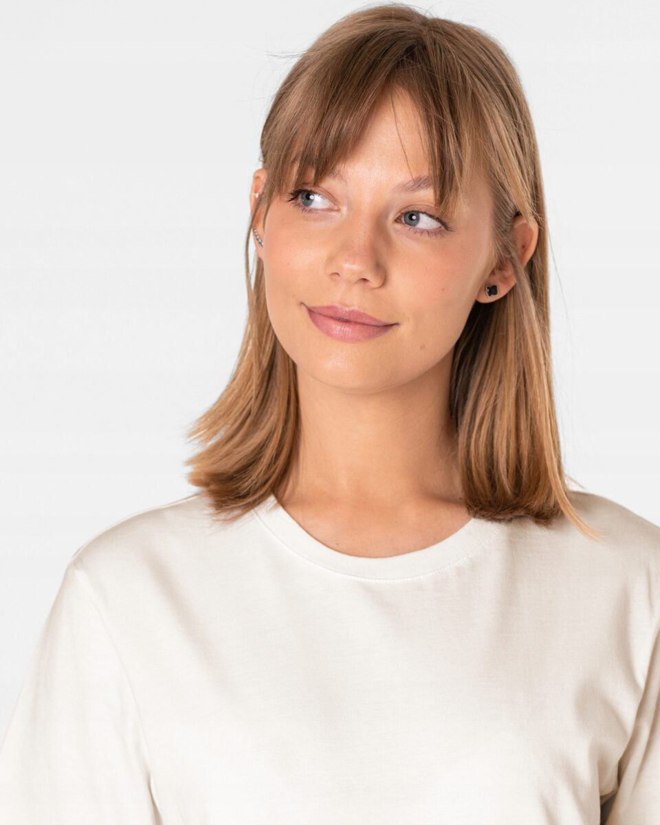 Wysokiej jakości dzianina bawełniana jest oddychająca, odporna na promieniowanie UV, elastyczna, rozciągliwa w czterech kierunkach, idealnie dopasowuje się i jest bardzo komfortowa. Przyjemna w dotyku, nie prześwituje i jest odporna na zmechacenie, a dzięki silikonowaniu włókien w procesie produkcji idealnie gładka. Koszulka nie ogranicza ruchów, a niewielka gramatura pozytywnie wpływa na komfort użytkowania w ciepłe i gorące dni wiosny i lata. Trwałe i elastyczne wykończenie bluzki (użycie do produkcji elastycznych nici) gwarantuje komfort i wygodę jej użytkownikowi w każdych warunkach. Możesz w niej chodzić na co dzień z gwarancją znakomitego nastroju i poczuciem wolności, a jednocześnie świadomością, że Twój look nawiązuje do zawsze aktualnych trendów w modzie kobiecej.