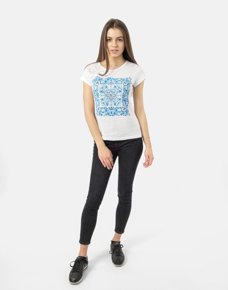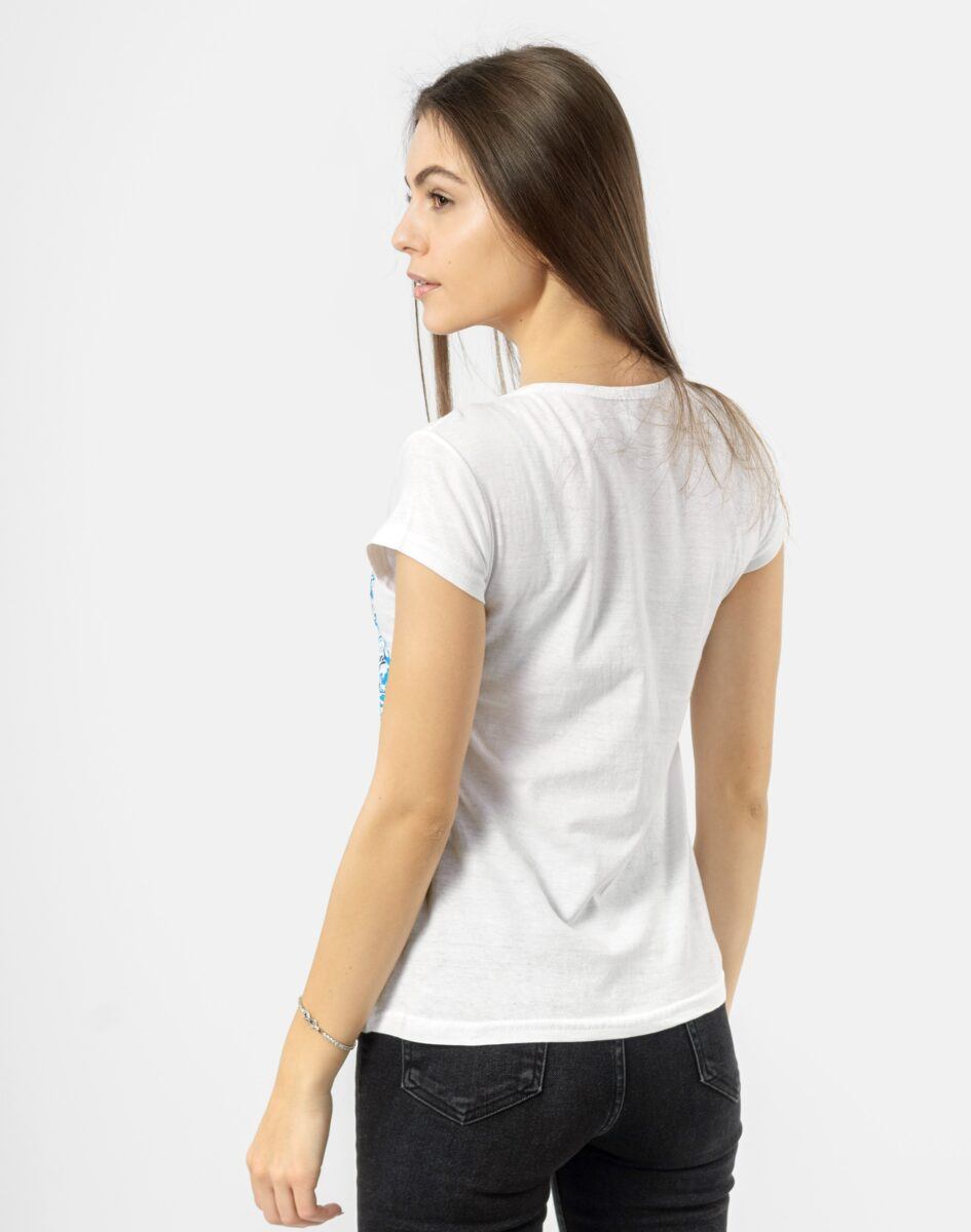 Komfortowa bluzka damska do codziennego użytku z krótkim rękawem i okrągłym dekoltem. Z przodu naniesiony trwałym termonadrukiem efektowny wzór w nowoczesnym designie. Tył gładki, jednolity. Wykonana z naturalnej, miękkiej, organicznej bawełny, o gramaturze 140g/m2 zapewniającej maksymalną wygodę i komfort użytkowania. Odpowiedni krój koszulki nie ogranicza swobody ruchów a niewielka gramatura pozytywnie wpływa na komfort użytkowania w ciepłe i gorące dni wiosny i lata. Zapewni Ci atrakcyjny modny wygląd i jednocześnie sportowy charakter!