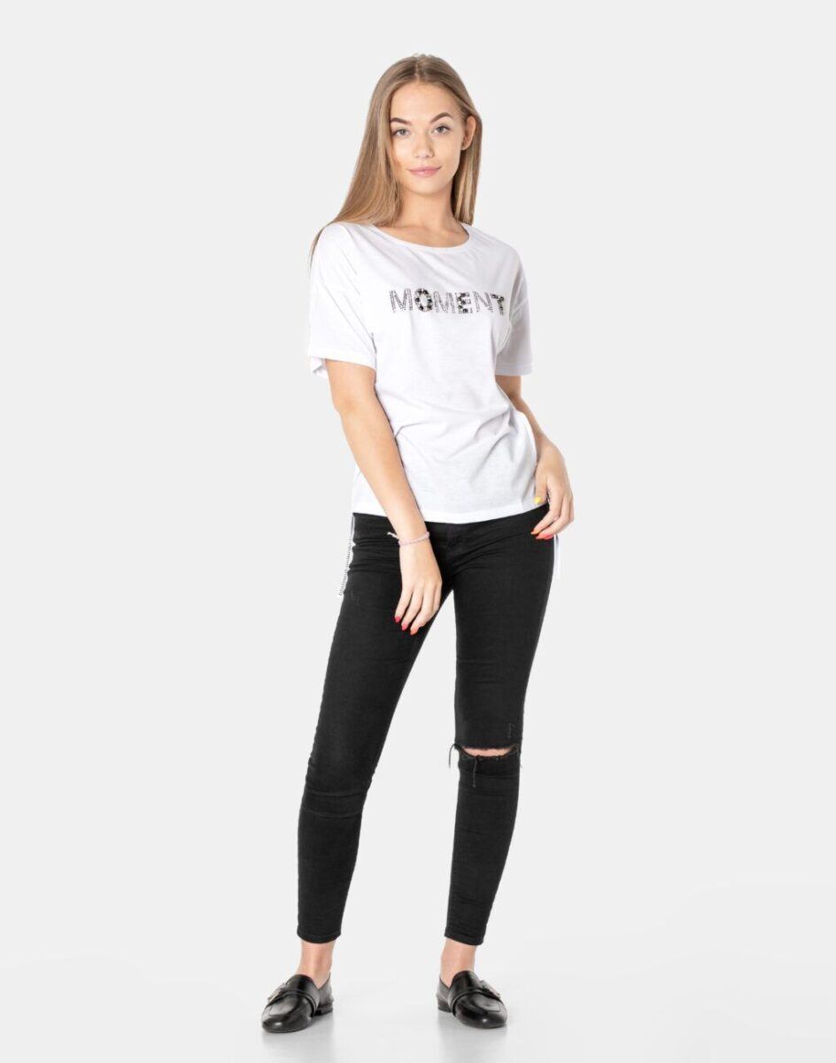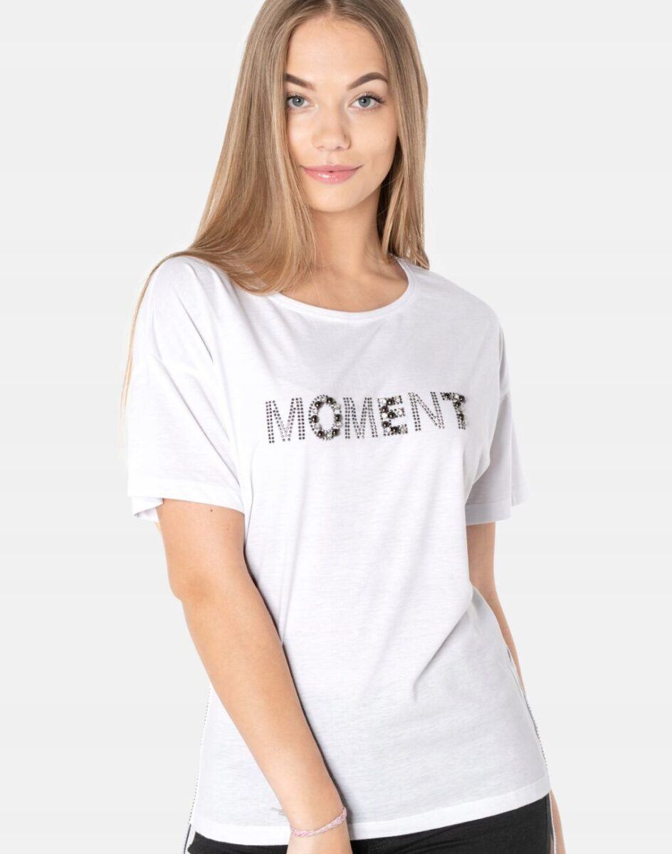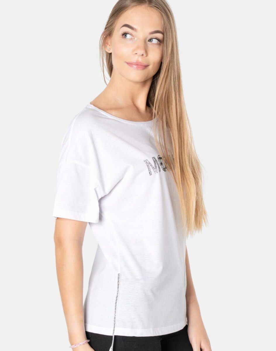 Komfortowa bluzka damska do codziennego użytku z krótkim rękawem i okrągłym dekoltem. Z przodu wykładany cyrkoniami napis, który jest niezwykle efektowny. Dół bluzki wykończony po bokach sznurkiem z ozdobnymi cyrkoniami. Tył gładki, jednolity. Koszulka wykonana z naturalnej, miękkiej, organicznej bawełny, o gramaturze 140g/m2 zapewniającej maksymalną wygodę i komfort użytkowania. Odpowiedni krój koszulki nie ograniczający swobody ruchów, a niewielka gramatura pozytywnie wpływa na komfort użytkowania w ciepłe i gorące dni wiosny i lata. Zapewni Ci atrakcyjny modny wygląd i jednocześnie sportowy charakter!