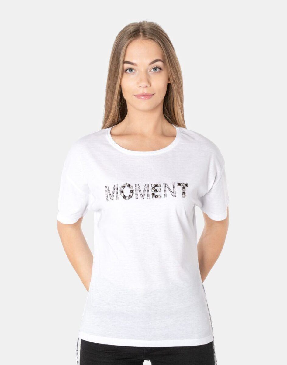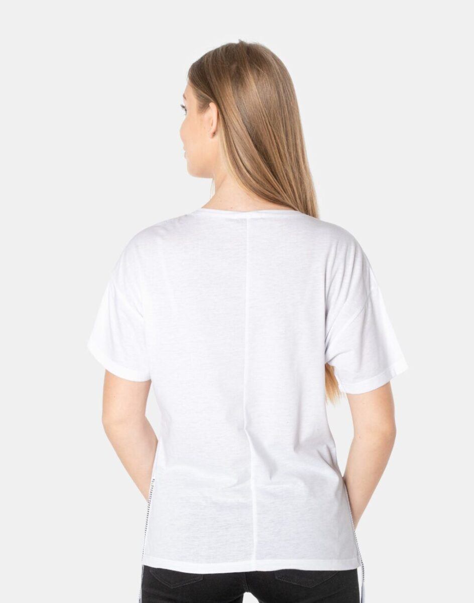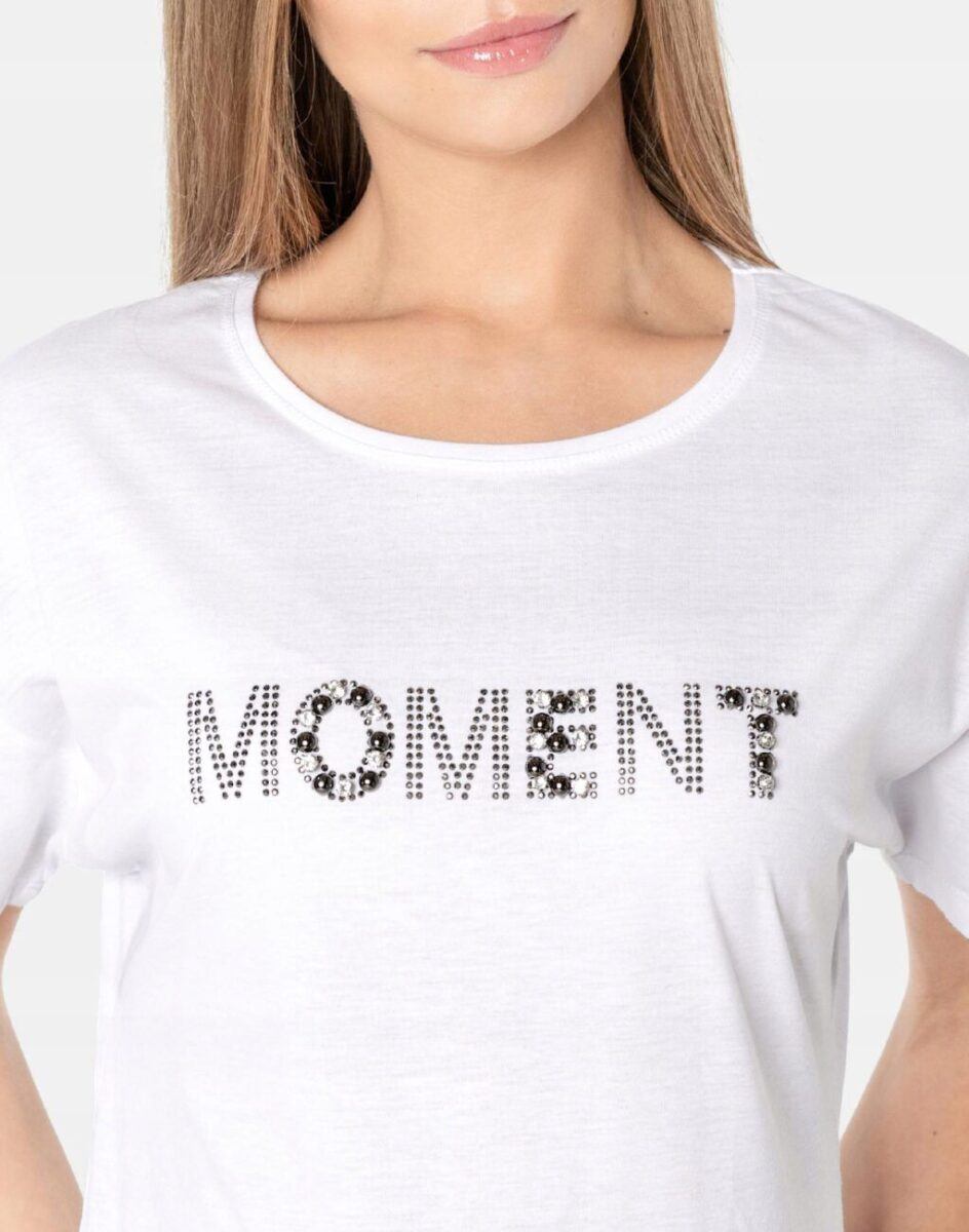 Komfortowa bluzka damska do codziennego użytku z krótkim rękawem i okrągłym dekoltem. Z przodu wykładany cyrkoniami napis, który jest niezwykle efektowny. Dół bluzki wykończony po bokach sznurkiem z ozdobnymi cyrkoniami. Tył gładki, jednolity. Koszulka wykonana z naturalnej, miękkiej, organicznej bawełny, o gramaturze 140g/m2 zapewniającej maksymalną wygodę i komfort użytkowania. Odpowiedni krój koszulki nie ograniczający swobody ruchów, a niewielka gramatura pozytywnie wpływa na komfort użytkowania w ciepłe i gorące dni wiosny i lata. Zapewni Ci atrakcyjny modny wygląd i jednocześnie sportowy charakter!