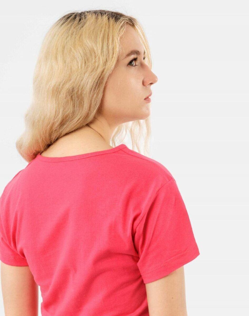 Komfortowa bluzka damska do codziennego użytku z krótkim rękawem i okrągłym dekoltem. Z przodu naniesiony trwałym termonadrukiem firmowy wzór w nowoczesnym designie. Tył gładki, jednolity. Wykonana z naturalnej, miękkiej, ekologicznej bawełny z dodatkiem poliestru, o gramaturze 140g/m2 zapewniającej maksymalną wygodę i komfort użytkowania. Odpowiedni krój koszulki nie ogranicza swobody ruchów, a niewielka gramatura pozytywnie wpływa na komfort użytkowania w ciepłe i gorące dni wiosny i lata. Zapewni Ci atrakcyjny modny wygląd i jednocześnie sportowy charakter!