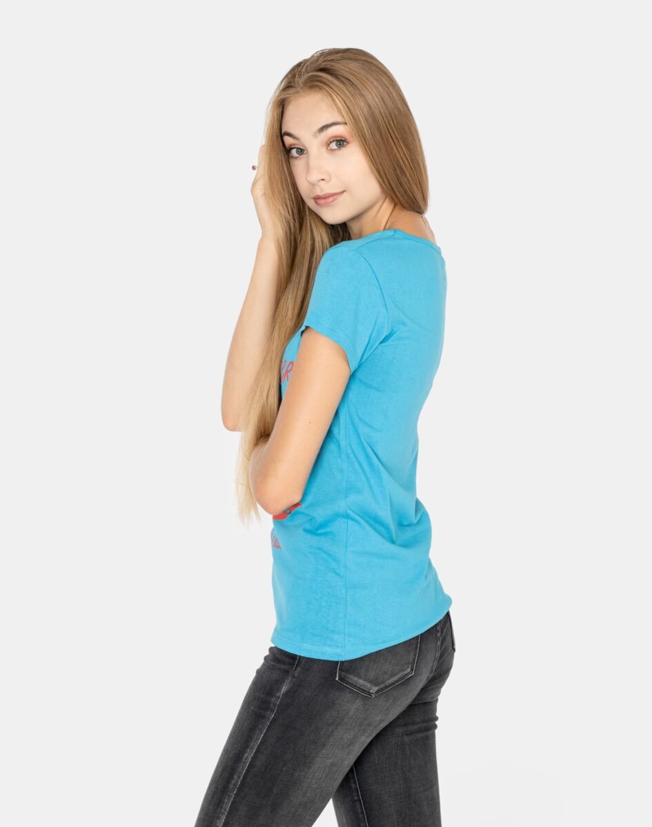 Komfortowa koszulka damska do codziennego użytku z krótkim rękawem i okrągłym dekoltem. Z przodu naniesiony termonadrukiem trwały i zupełnie niewyczuwalny w dotyku nadruk. Tył gładki, jednolity. Wykonana z naturalnej, miękkiej, organicznej bawełny, o gramaturze 140g/m2 zapewniającej maksymalną wygodę i komfort użytkowania. Odpowiedni krój koszulki nie ogranicza swobody ruchów, a niewielka gramatura pozytywnie wpływa na komfort użytkowania w ciepłe i gorące dni wiosny i lata. Zapewni Ci atrakcyjny modny wygląd i jednocześnie sportowy charakter!