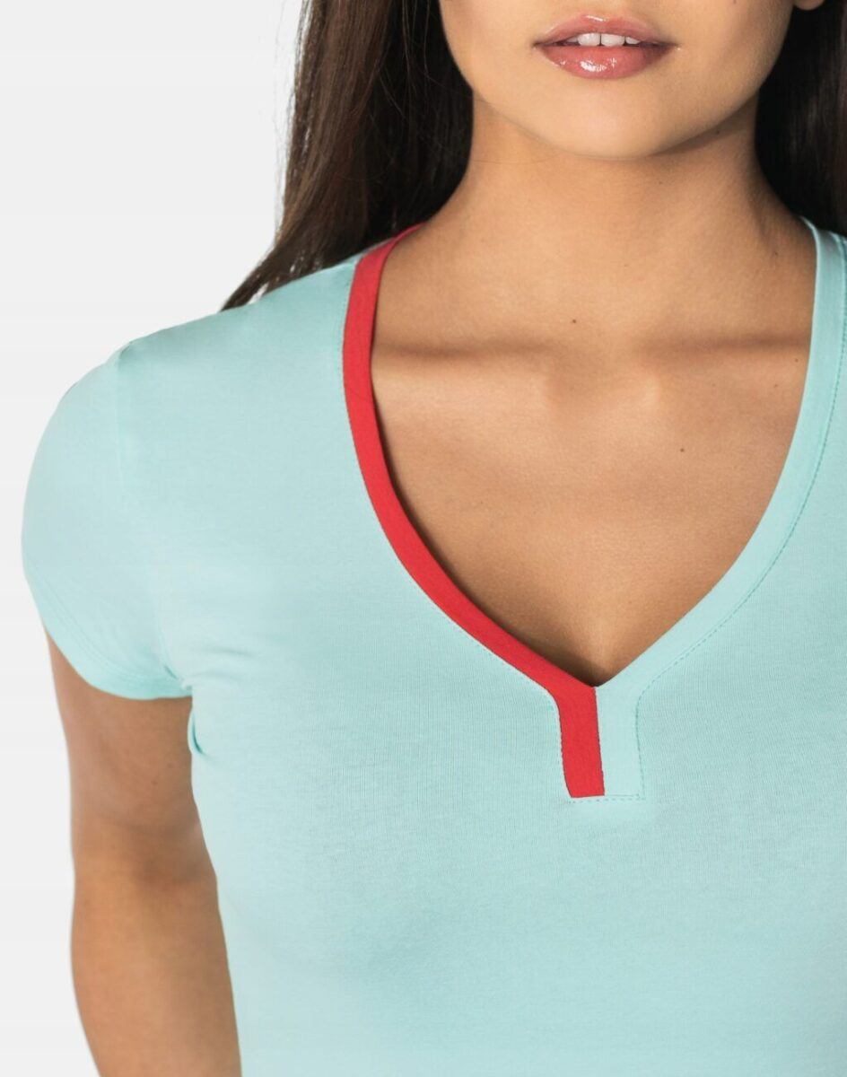 Komfortowa koszulka sportowa polskiej firmy RENNOX z kolekcji Fitness&Sport jest doskonałym wyborem dla kobiet aktywnych. Lekka, o delikatnie taliowanym kroju, cienka i przewiewna, idealna na co dzień jako element casualowego stroju czyniąc go lekkim i dostosowanym do wysokich temperatur. Może być z powodzeniem używana do rozmaitych zajęć sportowych jak i do noszenia na co dzień. Wykonana z wysokiej jakości dzianiny bawełnianej z domieszką elastanu. Zastosowany materiał jest oddychający „Dry-Fit”, odporny na promieniowanie UV, elastyczny, rozciągliwy w czterech kierunkach, idealnie dopasowuje się i jest bardzo komfortowy. Przyjemny w dotyku i odporny na zmechacenie a dzięki silikonowaniu włókien w procesie produkcji idealnie gładki.
