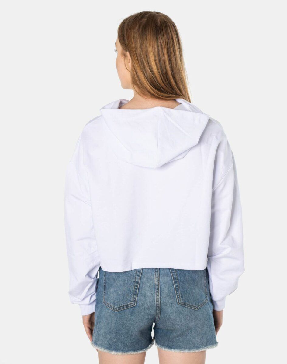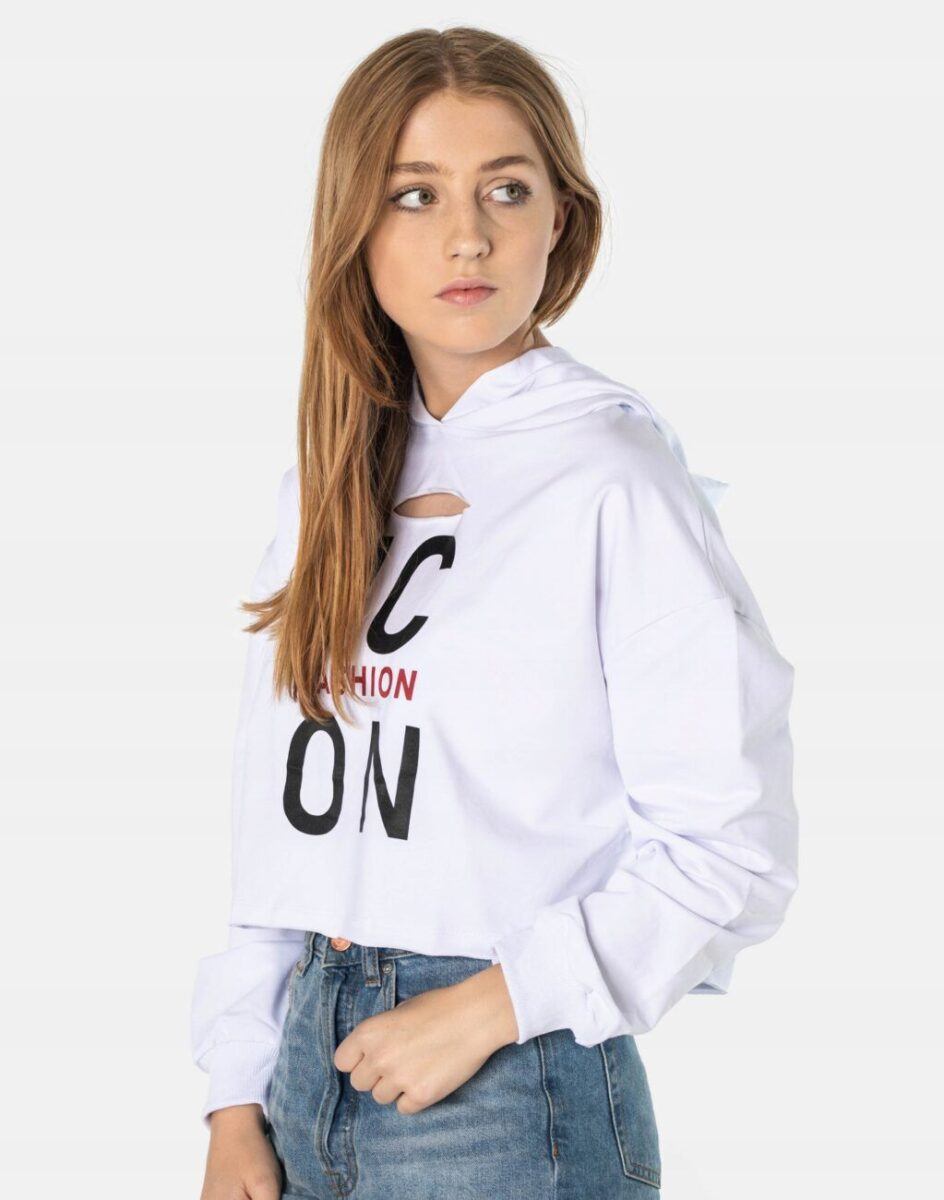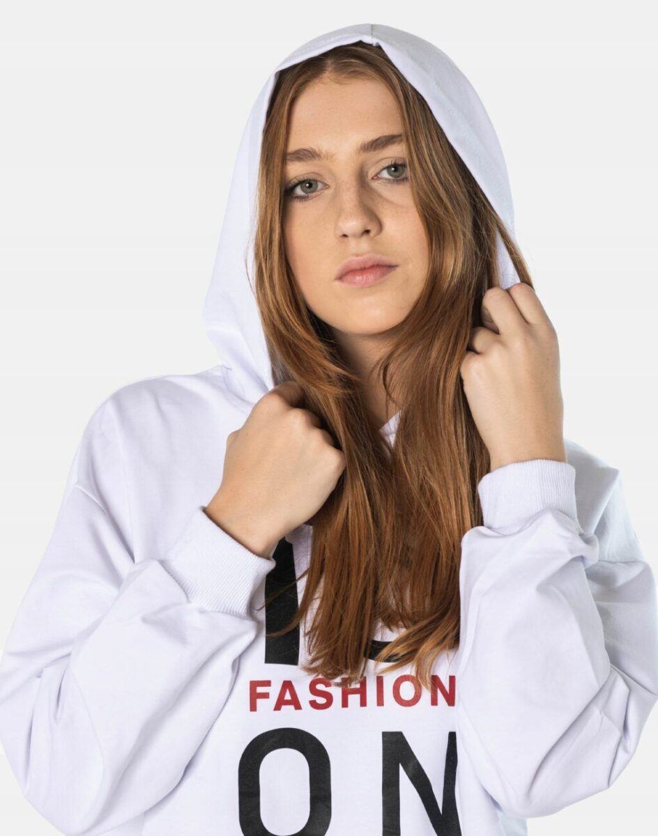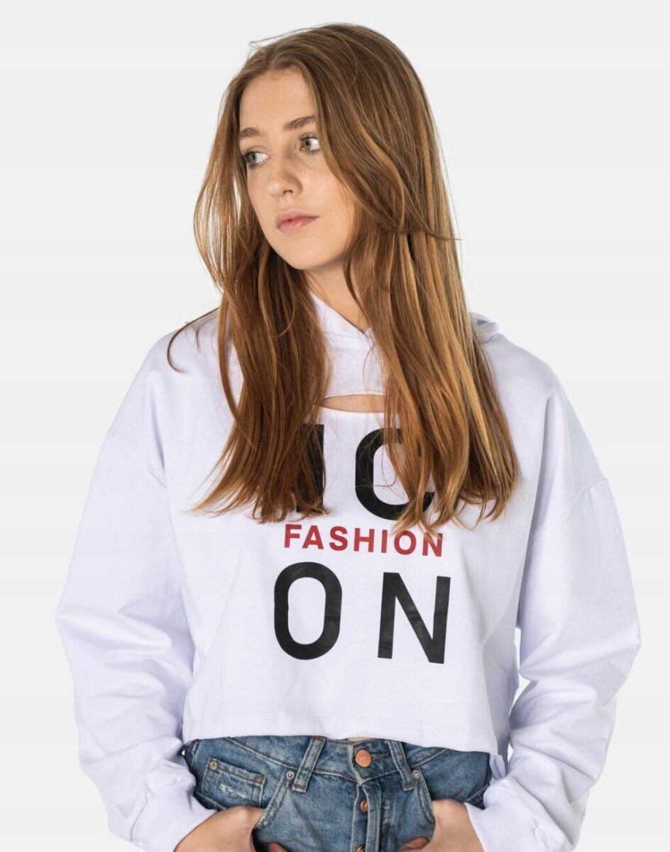 Sportowa, wyjątkowo dziewczęca krótka bluza z długim rękawem i praktycznym kapturem, to hit mody młodzieżowej, po który sięgają także dojrzałe panie bo prezentuje się świetnie na każdego rodzaju sylwetce. Z przodu bluzy naniesione trwałym termonadrukiem będące obecnie na topie duże napisy w stylu College z nimi przekażesz, co Ci w duszy gra. Inspirowane kampusowym klimatem amerykańskich uczelni, wyglądają rewelacyjnie w zestawie z jeansami lub dresowymi szortami. Tył gładki, bez nadruków. Wykonana z naturalnej, miękkiej, organicznej dzianiny bawełnianej o gramaturze 190g/m2 zapewniającej maksymalną wygodę i komfort użytkowania. Odpowiedni krój bluzy nie ogranicza swobody ruchów, a odpowiednia gramatura pozytywnie wpływa na komfort użytkowania.