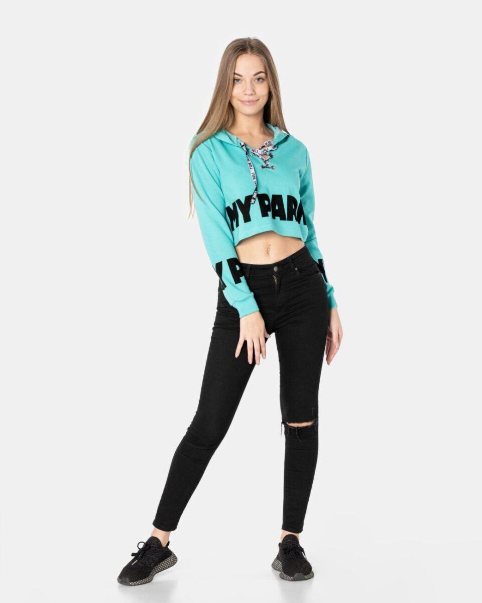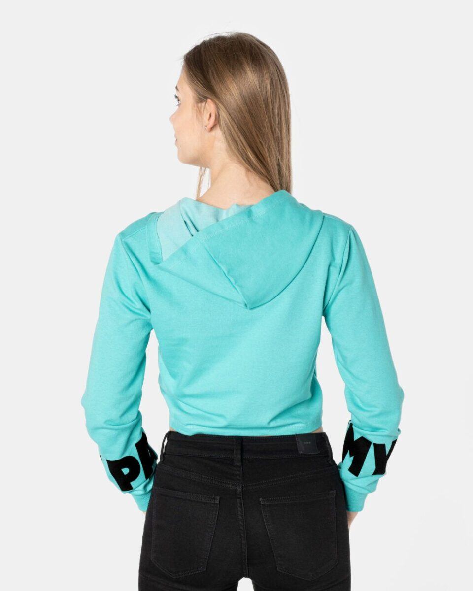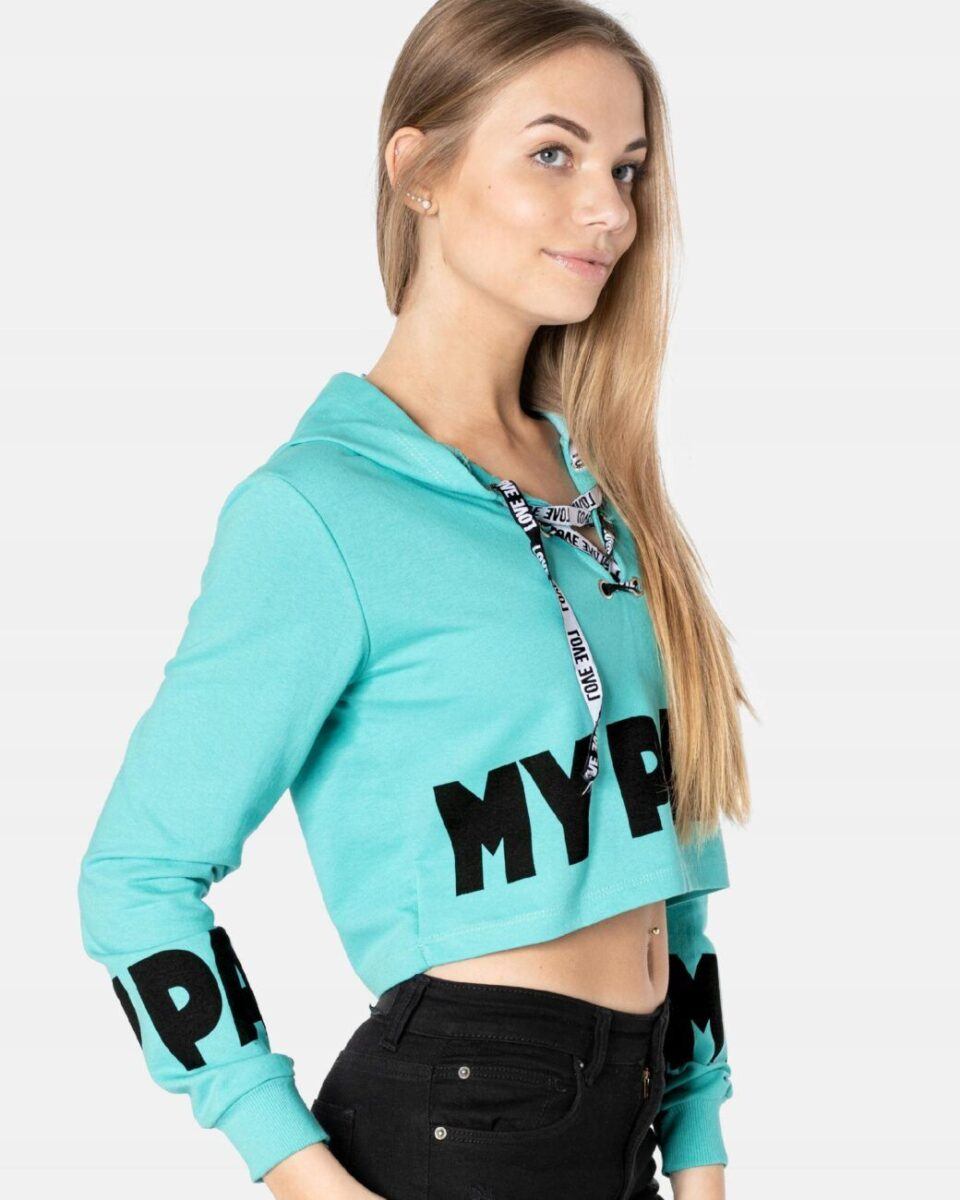 Sportowa, wyjątkowo dziewczęca krótka bluzka z długim rękawem i praktycznym kapturem, to hit mody młodzieżowej, po który sięgają także dojrzałe panie. Na bluzce naniesione trwałym termonadrukiem będące obecnie na topie duże napisy. Inspirowane kampusowym klimatem amerykańskich uczelni, wyglądają rewelacyjnie w zestawie z jeansami lub dresowymi szortami. Tył gładki, jednolity. Wykonana z naturalnej, miękkiej, organicznej dzianiny bawełnianej o gramaturze 140g/m2 zapewniającej maksymalną wygodę i komfort użytkowania. Odpowiedni krój bluzki nie ogranicza swobody ruchów, a niewielka gramatura pozytywnie wpływa na komfort użytkowania w ciepłe i gorące dni wiosny i lata.