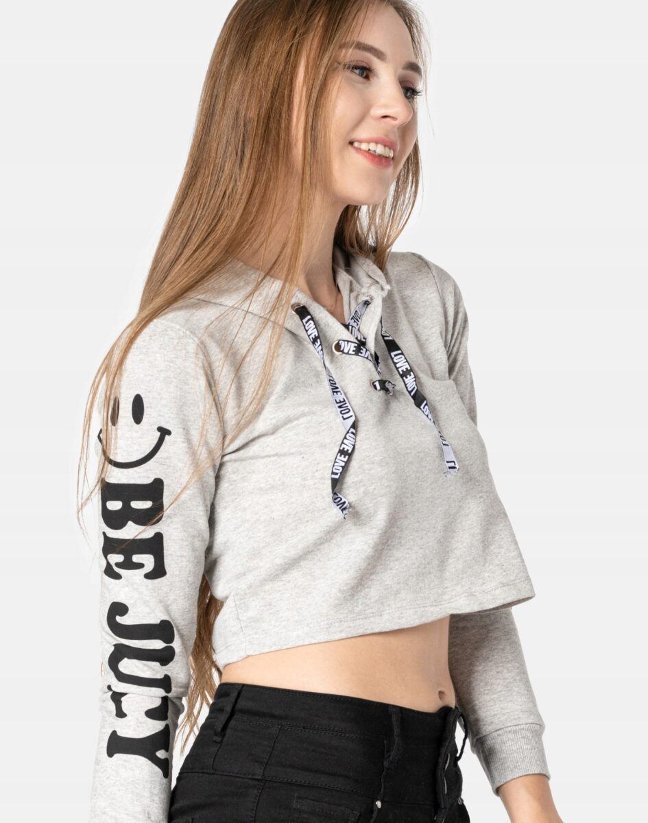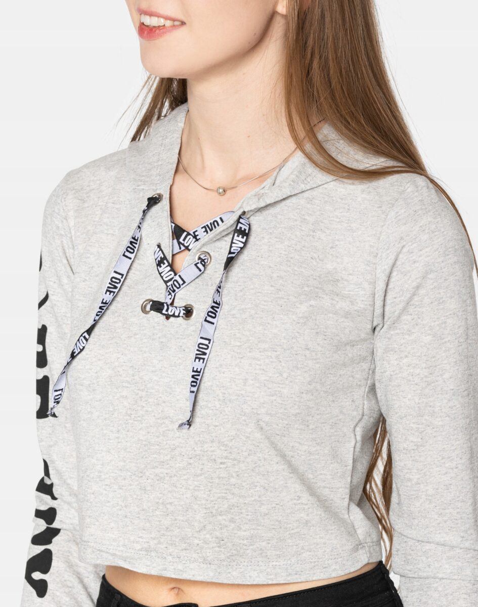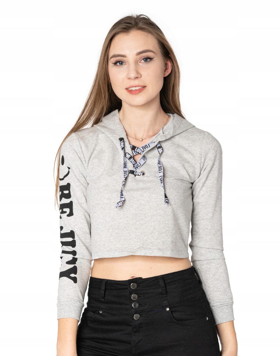 Sportowa, wyjątkowo dziewczęca krótka bluzka z długim rękawem i praktycznym kapturem, to hit mody młodzieżowej, po który sięgają także dojrzałe panie. Na rękawie naniesiony trwałym termonadrukiem będący obecnie na topie duży czarny napis. Inspirowane kampusowym klimatem amerykańskich uczelni, wyglądają rewelacyjnie w zestawie z jeansami lub dresowymi szortami. Tył gładki, jednolity. Wykonana z naturalnej, miękkiej, organicznej dzianiny bawełnianej o gramaturze 140g/m2 zapewniającej maksymalną wygodę i komfort użytkowania. Odpowiedni krój bluzki nie ogranicza swobody ruchów, a niewielka gramatura pozytywnie wpływa na komfort użytkowania w ciepłe i gorące dni wiosny i lata.