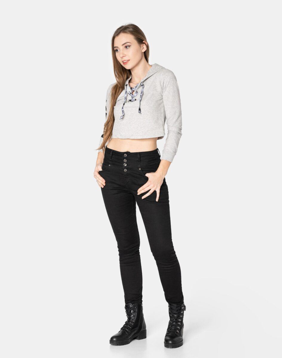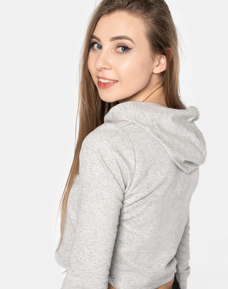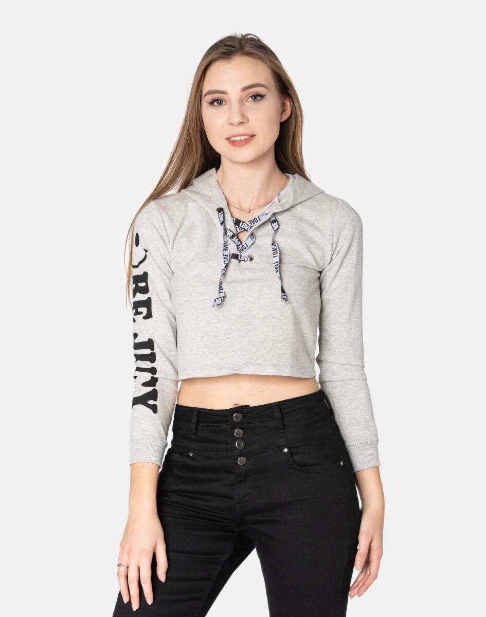 Sportowa, wyjątkowo dziewczęca krótka bluzka z długim rękawem i praktycznym kapturem, to hit mody młodzieżowej, po który sięgają także dojrzałe panie. Na rękawie naniesiony trwałym termonadrukiem będący obecnie na topie duży czarny napis. Inspirowane kampusowym klimatem amerykańskich uczelni, wyglądają rewelacyjnie w zestawie z jeansami lub dresowymi szortami. Tył gładki, jednolity. Wykonana z naturalnej, miękkiej, organicznej dzianiny bawełnianej o gramaturze 140g/m2 zapewniającej maksymalną wygodę i komfort użytkowania. Odpowiedni krój bluzki nie ogranicza swobody ruchów, a niewielka gramatura pozytywnie wpływa na komfort użytkowania w ciepłe i gorące dni wiosny i lata.