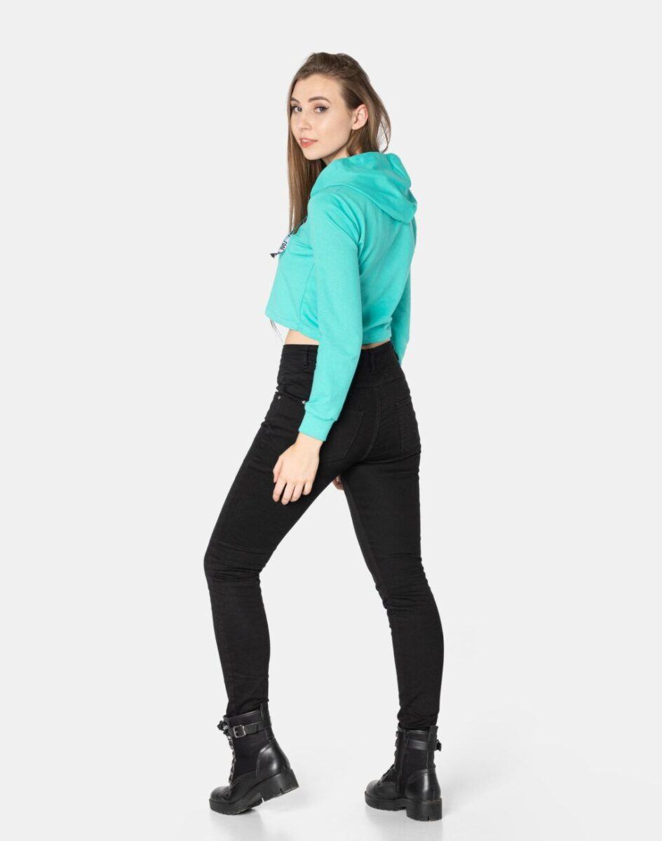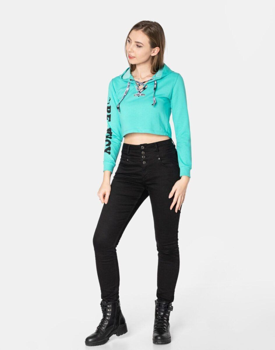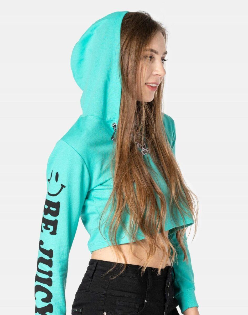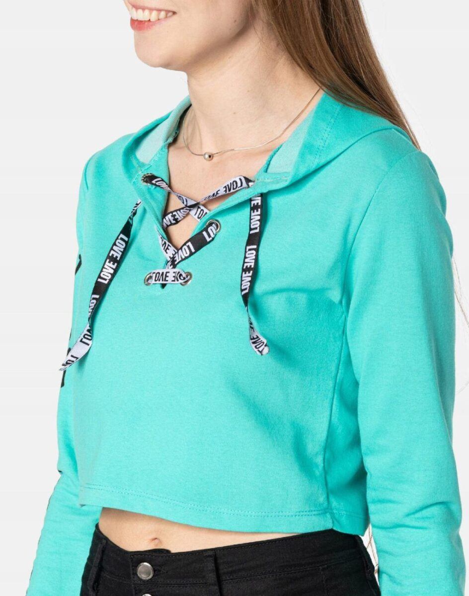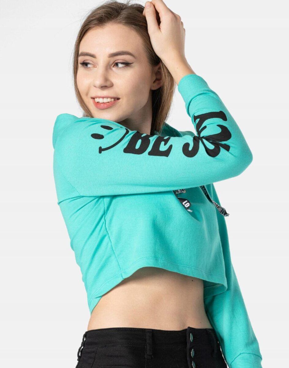 Sportowa, wyjątkowo dziewczęca krótka bluzka z długim rękawem i praktycznym kapturem, to hit mody młodzieżowej, po który sięgają także dojrzałe panie. Na rękawie naniesiony trwałym termonadrukiem będący obecnie na topie duży czarny napis. Inspirowane kampusowym klimatem amerykańskich uczelni, wyglądają rewelacyjnie w zestawie z jeansami lub dresowymi szortami. Tył gładki, jednolity. Wykonana z naturalnej, miękkiej, organicznej dzianiny bawełnianej o gramaturze 140g/m2 zapewniającej maksymalną wygodę i komfort użytkowania. Odpowiedni krój bluzki nie ogranicza swobody ruchów, a niewielka gramatura pozytywnie wpływa na komfort użytkowania w ciepłe i gorące dni wiosny i lata.