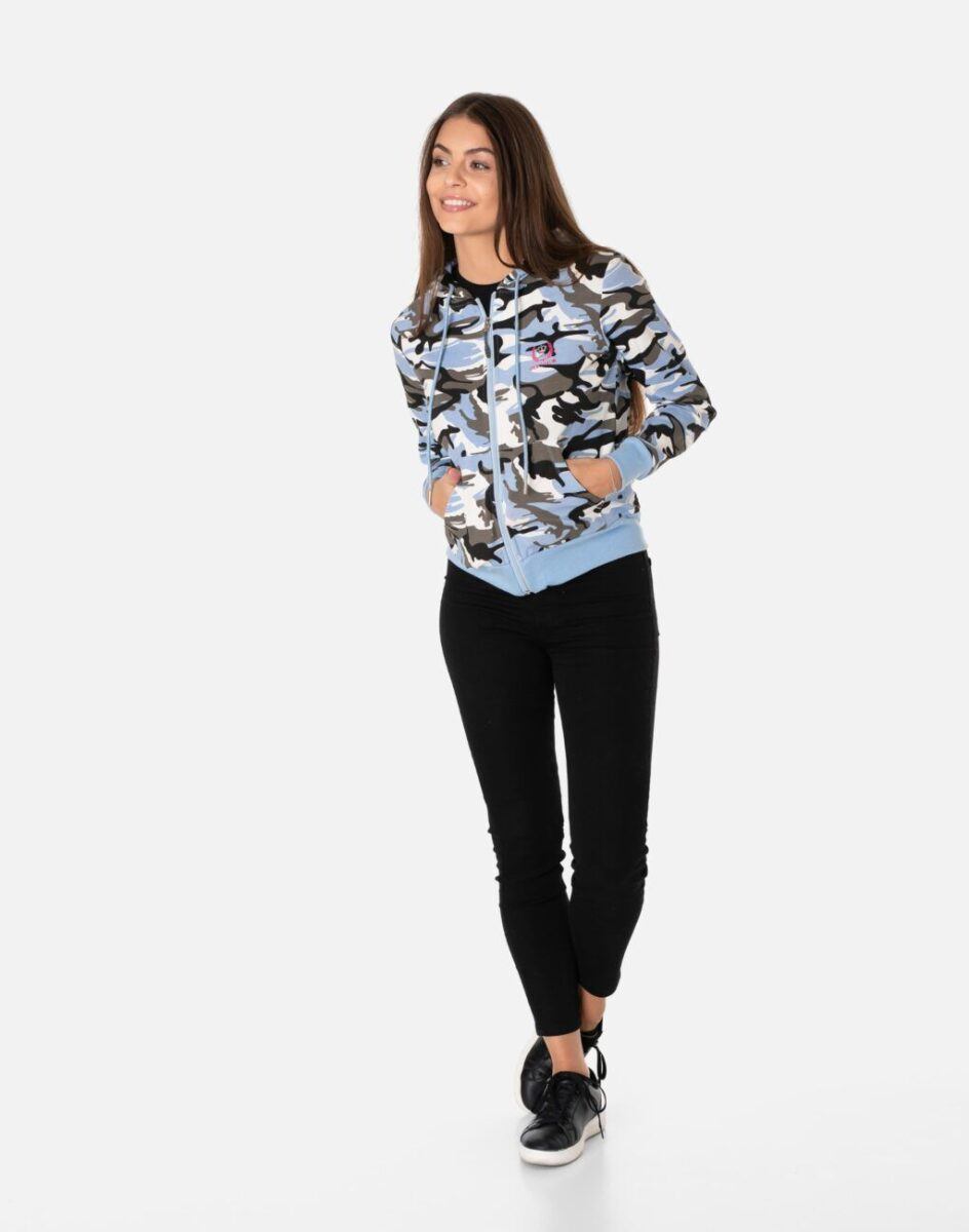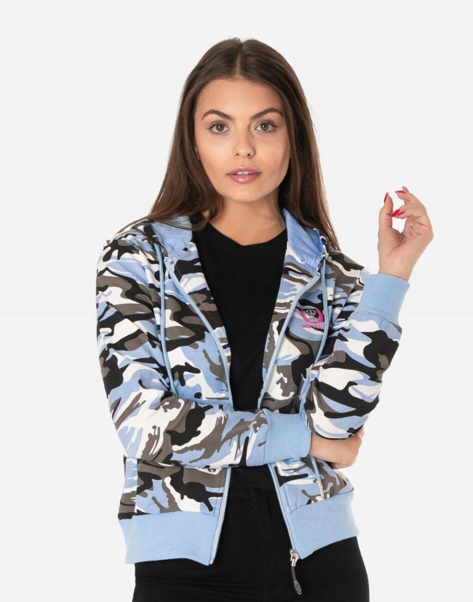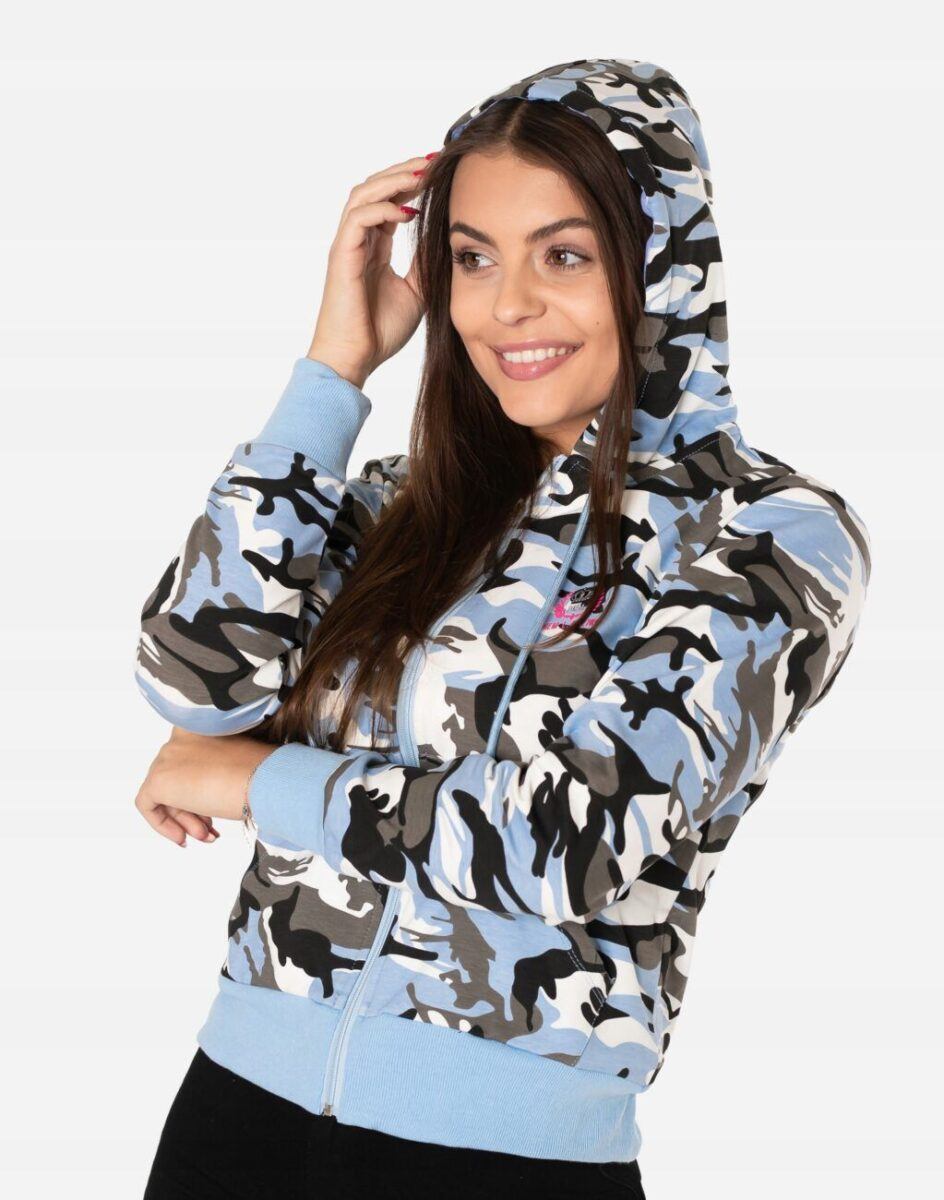 Sportowa damska bluza bawełniana moro, uszyta z cienkiej dzianiny dresowej z dodatkiem elastanu. Naturalna bawełna gwarantuje wchłanianie potu i oddychanie skóry, a sam materiał odznacza się dużą oddychalnością „Dry-Fit”. Dodatek elastanu to gwarancja pełnej swobody ruchów oraz stabilności rozmiarów i koloru po wielokrotnym praniu. Bluza zasuwana jest w całości na zamek błyskawiczny, posiada dwie przednie kieszenie na dłonie oraz zintegrowany kaptur z możliwością regulacji jego wielkości i dopasowania. Dół bluzy oraz rękawy wykończone szerokim elastycznym ściągaczem. Zewnętrzna powierzchnia bluzy jest ozdobiona w deseń inspirowany wojskowym wzorem moro CAMO, który znają wszyscy na świecie. Ten charakterystyczny wzór jest uwielbiany przez fanów i fanki militarnego stylu ubierania. Możesz w niej chodzić na co dzień, idealnie nadaje się również do uprawiania różnych dyscyplin sportu i rekreacji.