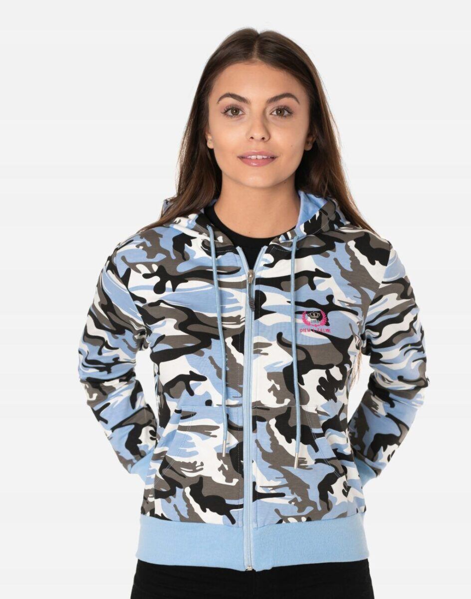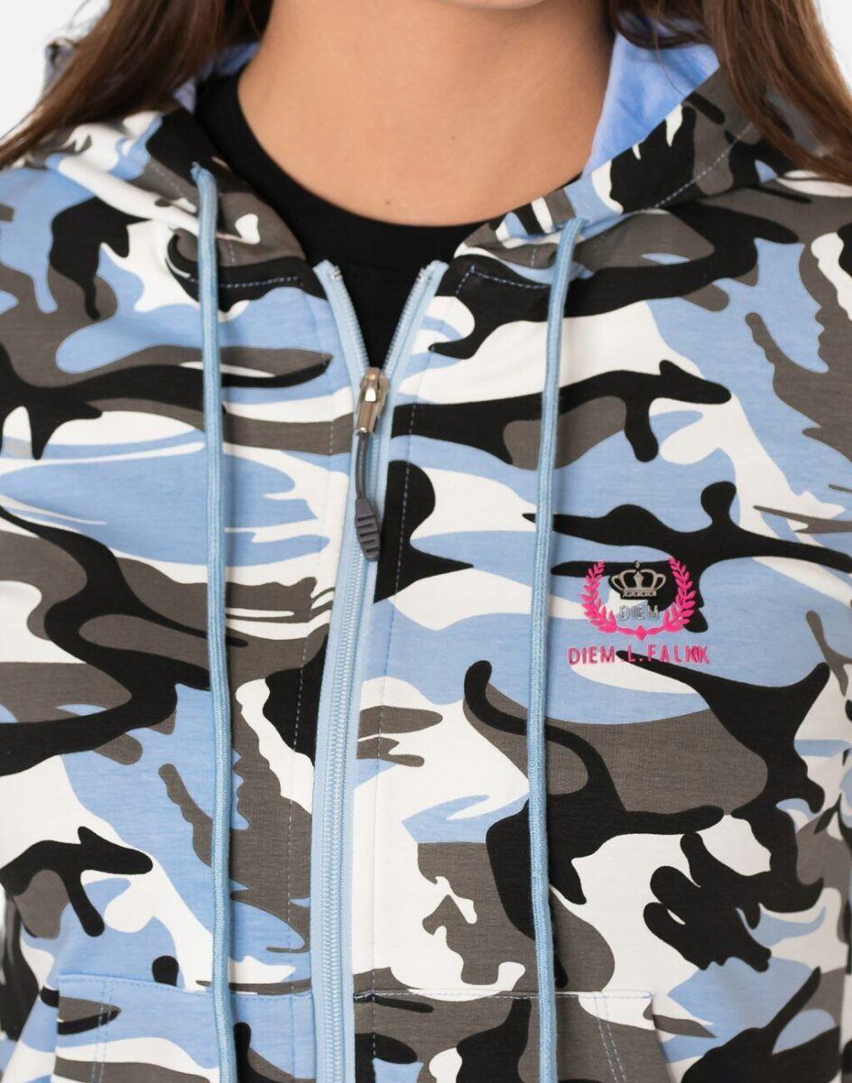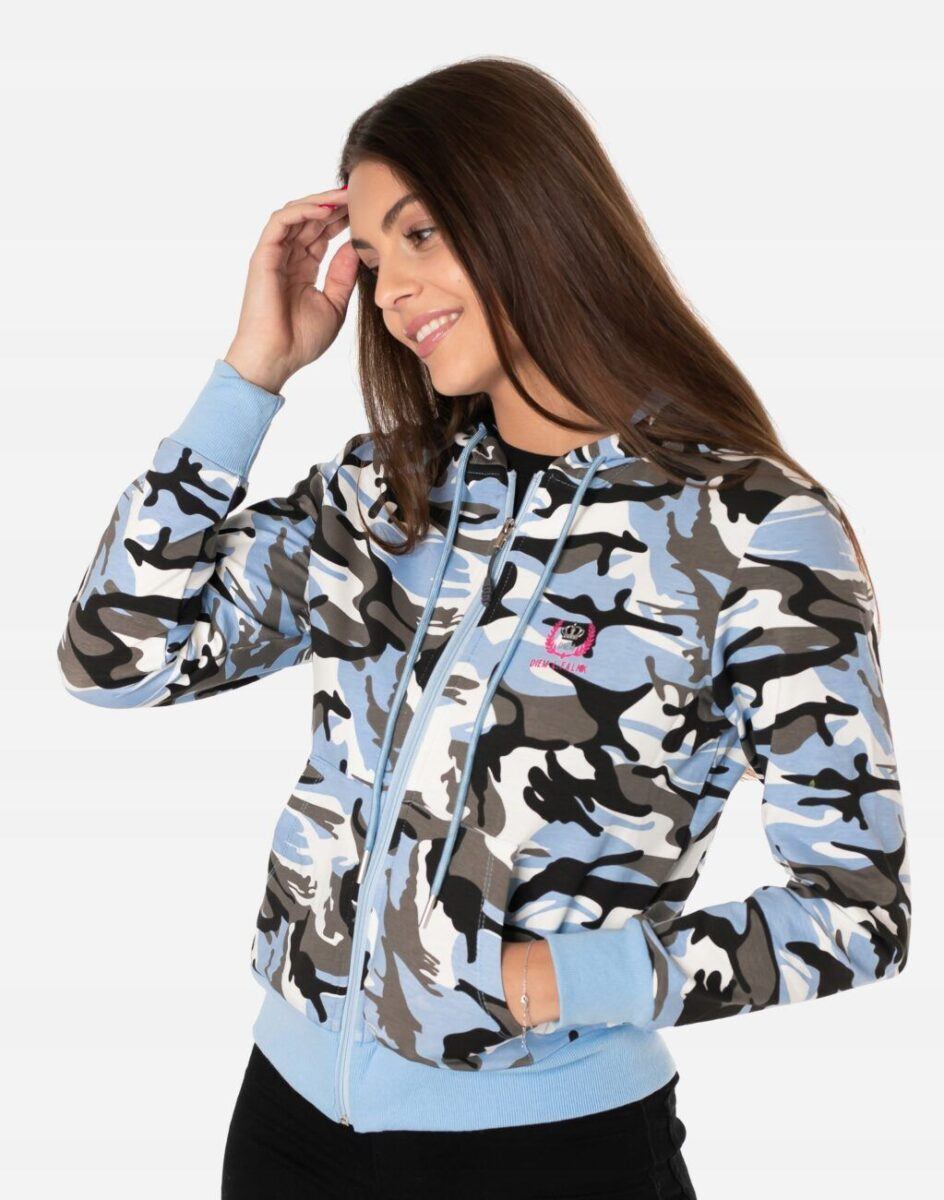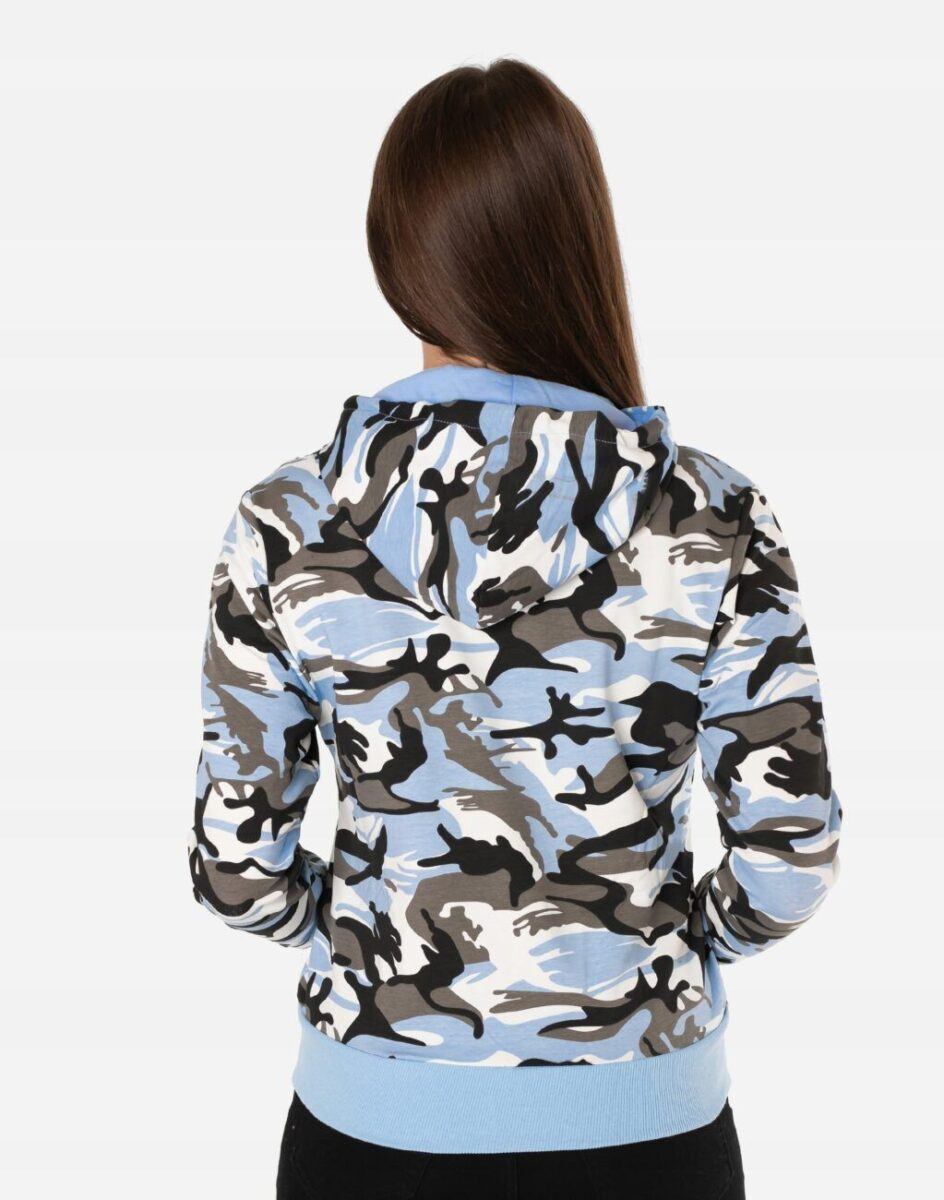 Sportowa damska bluza bawełniana moro, uszyta z cienkiej dzianiny dresowej z dodatkiem elastanu. Naturalna bawełna gwarantuje wchłanianie potu i oddychanie skóry, a sam materiał odznacza się dużą oddychalnością „Dry-Fit”. Dodatek elastanu to gwarancja pełnej swobody ruchów oraz stabilności rozmiarów i koloru po wielokrotnym praniu. Bluza zasuwana jest w całości na zamek błyskawiczny, posiada dwie przednie kieszenie na dłonie oraz zintegrowany kaptur z możliwością regulacji jego wielkości i dopasowania. Dół bluzy oraz rękawy wykończone szerokim elastycznym ściągaczem. Zewnętrzna powierzchnia bluzy jest ozdobiona w deseń inspirowany wojskowym wzorem moro CAMO, który znają wszyscy na świecie. Ten charakterystyczny wzór jest uwielbiany przez fanów i fanki militarnego stylu ubierania. Możesz w niej chodzić na co dzień, idealnie nadaje się również do uprawiania różnych dyscyplin sportu i rekreacji.