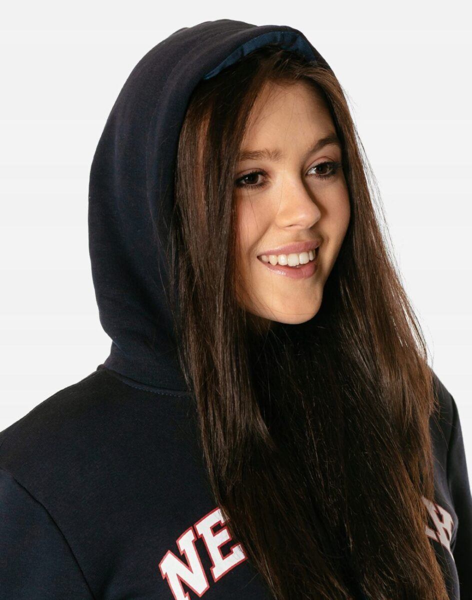 Sportowa bluza damska typu kangurka wyprodukowana z dzianiny bawełnianej, zapewniającej maksymalną wygodę i komfort użytkowania. Naturalna bawełna gwarantuje wspaniałą izolację cieplną, wchłanianie potu i oddychanie skóry, a sam materiał odznacza się dużą miękkością. Wysoka jakość zastosowanej do produkcji dzianiny bawełnianej to gwarancja pełnej swobody ruchów oraz stabilności rozmiarów i kolorów po wielokrotnym praniu. Klasyczna, gładka, wkładana przez głowę, przodem i tyłem dłuższa, bokami krótsza. Bluza posiada podwójną wygodną kieszeń tak zwaną „kangurkę” i zintegrowany kaptur z możliwością regulacji wielkości i dopasowania taśmowym ściągaczem. Ergonomiczny krój bluzy nie ogranicza swobody ruchów co wpływa pozytywnie na wygodę użytkowania.
