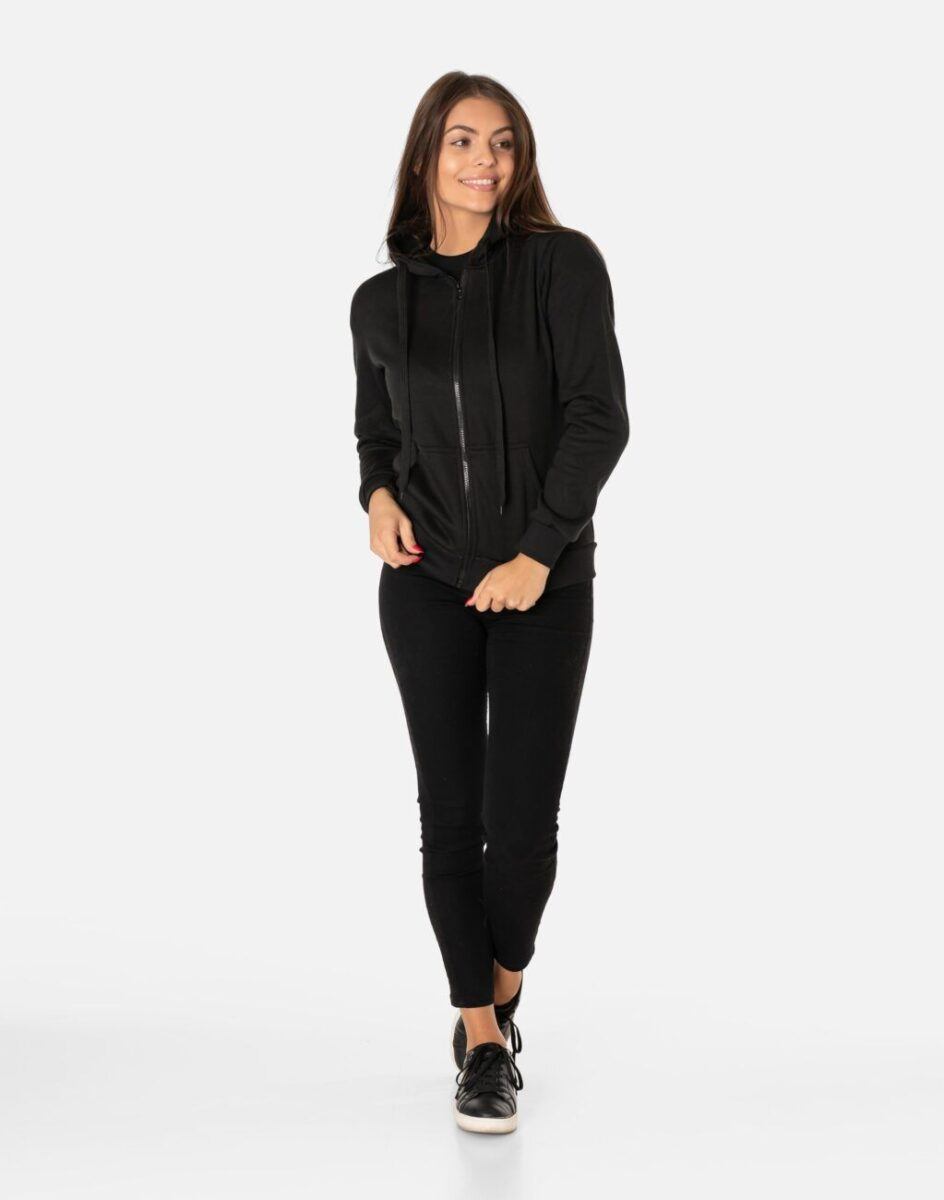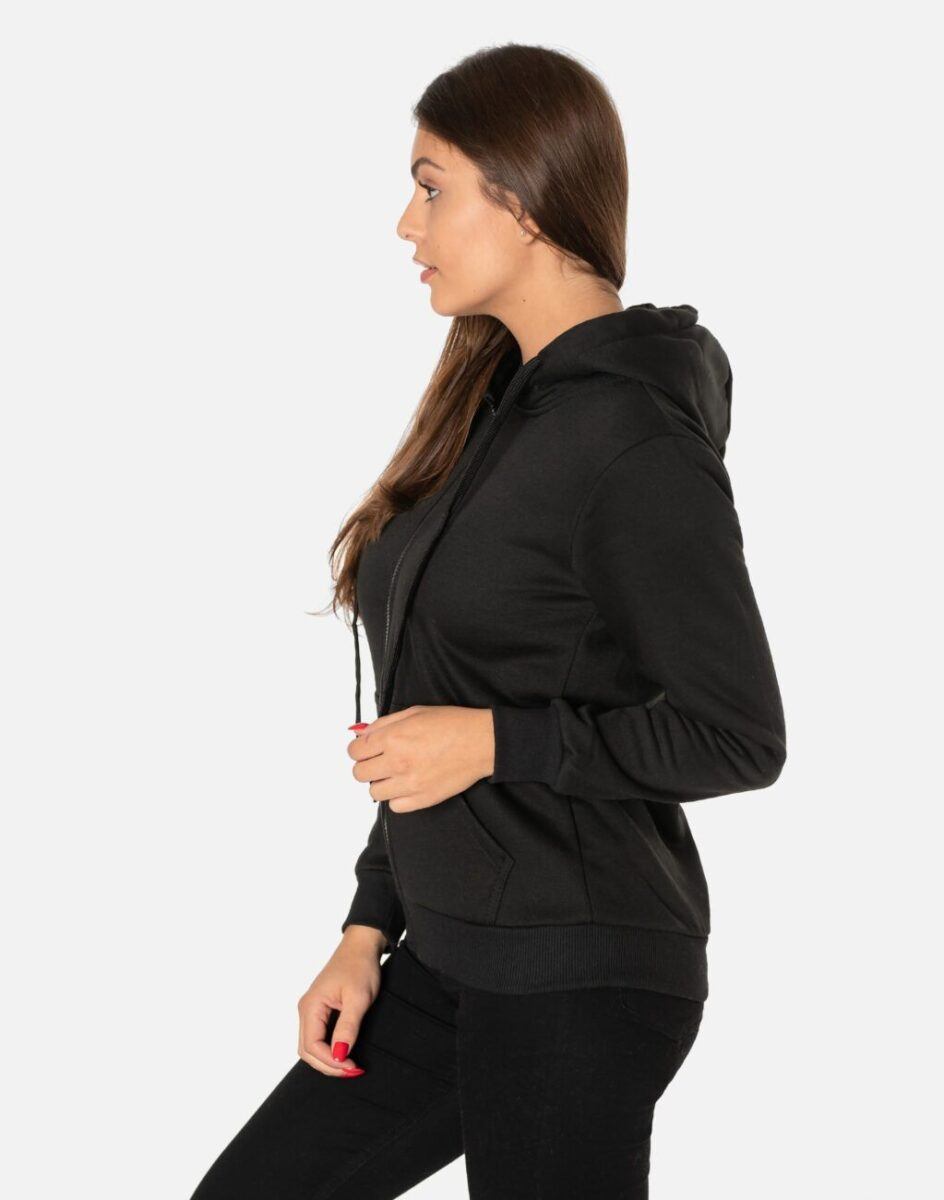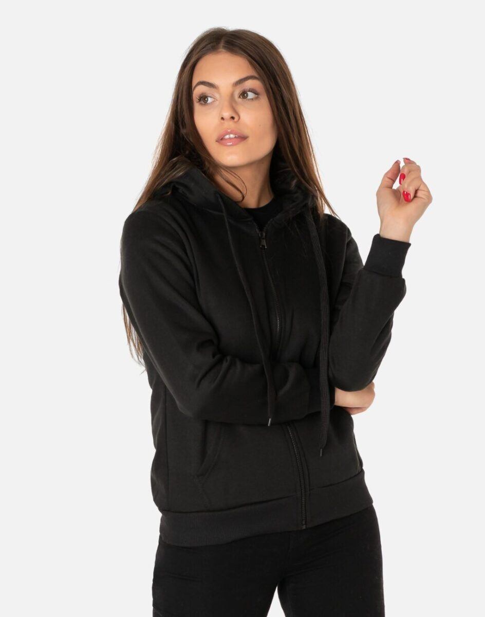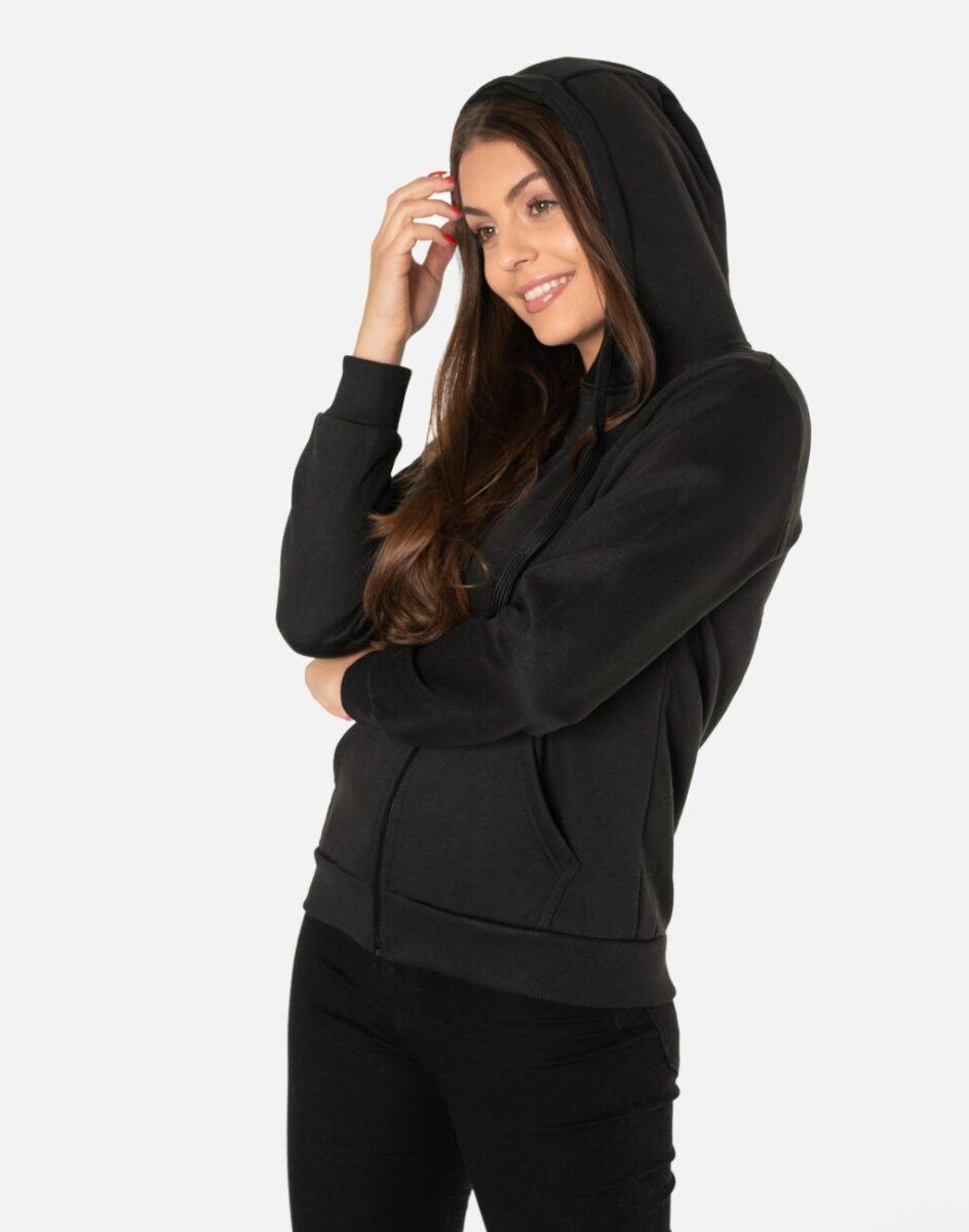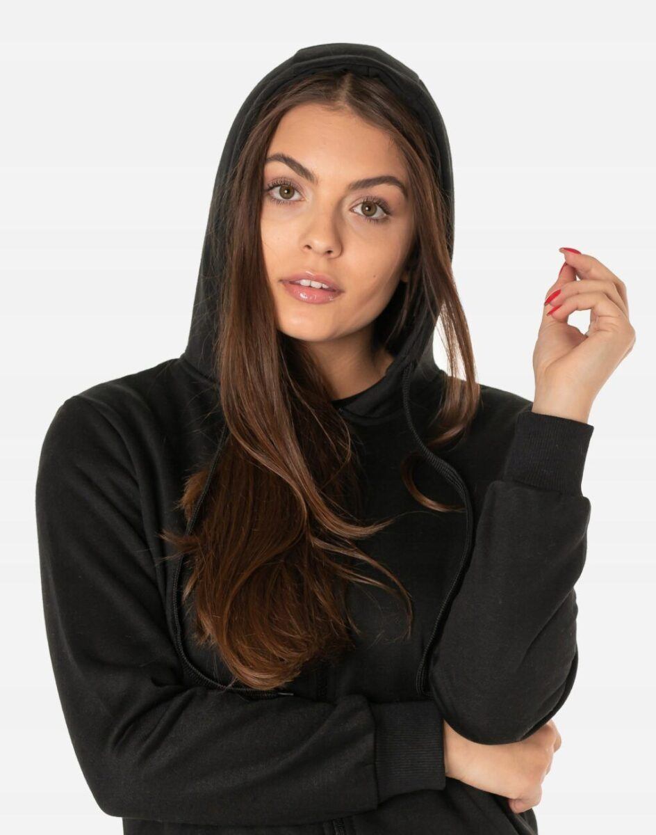 Znakomicie sprawdzi się w chłodniejsze dni, bo jest wyjątkowo ciepła i bardzo wygodna. Bluza zasuwana jest w całości na zamek błyskawiczny i posiada dwie naszywane kieszenie na dłonie. Dół bluzy oraz rękawy wykończone szerokim elastycznym ściągaczem co pozwala na precyzyjne dopasowanie bluzy do ciała i zapobiega utracie ciepła. Długość midi, która z powodzeniem zakrywa części ciała wrażliwe na chłód jak plecy na wysokości nerek i pośladki.