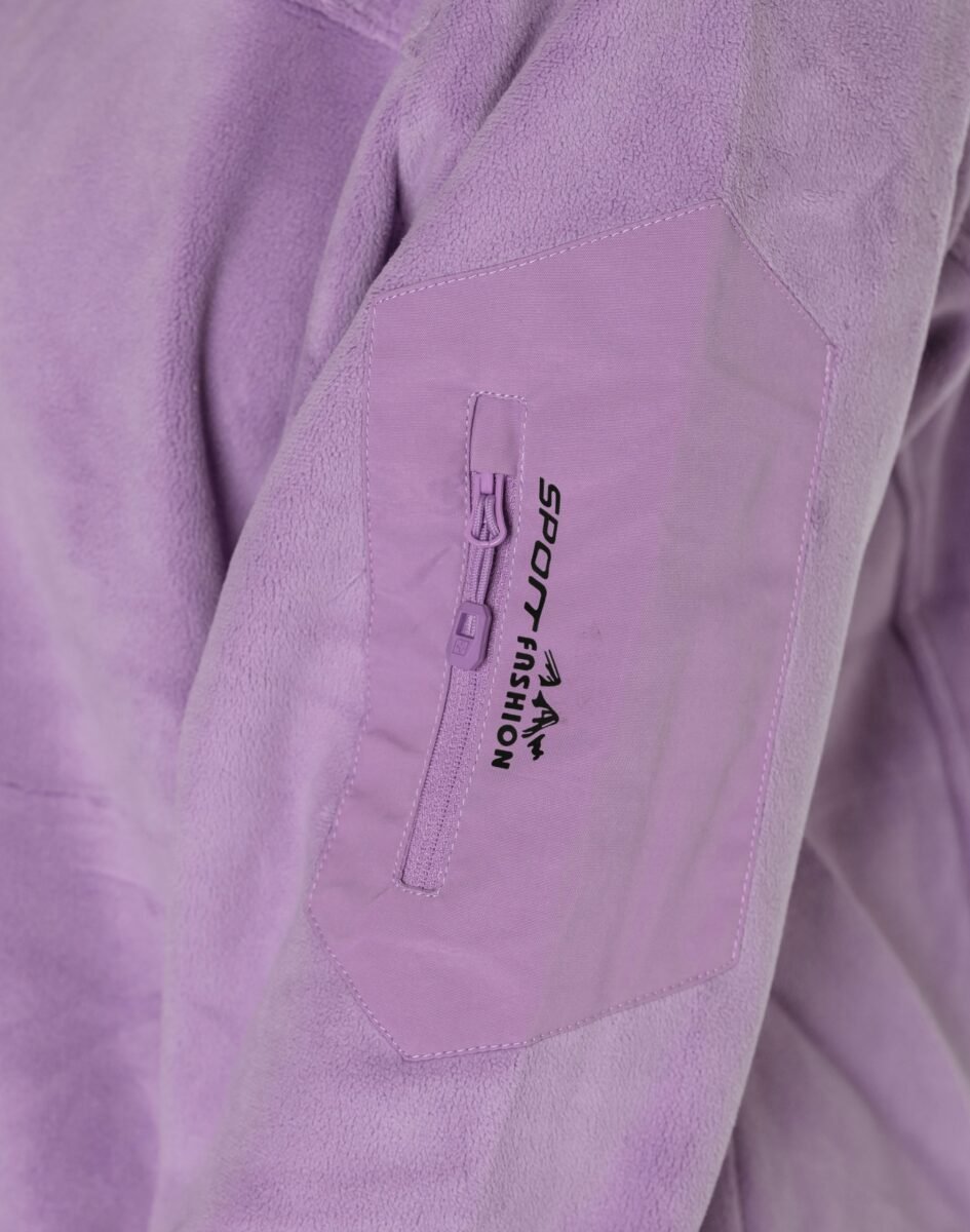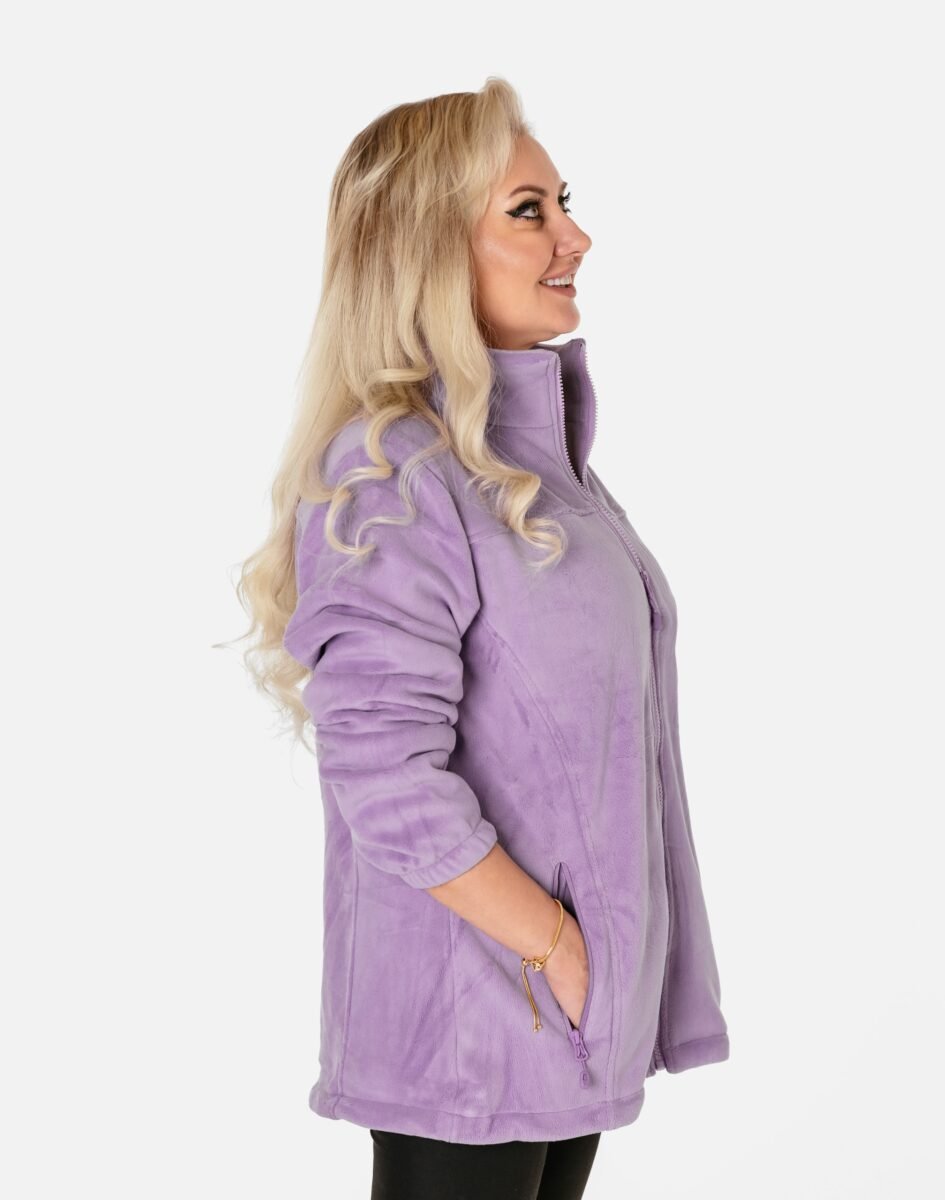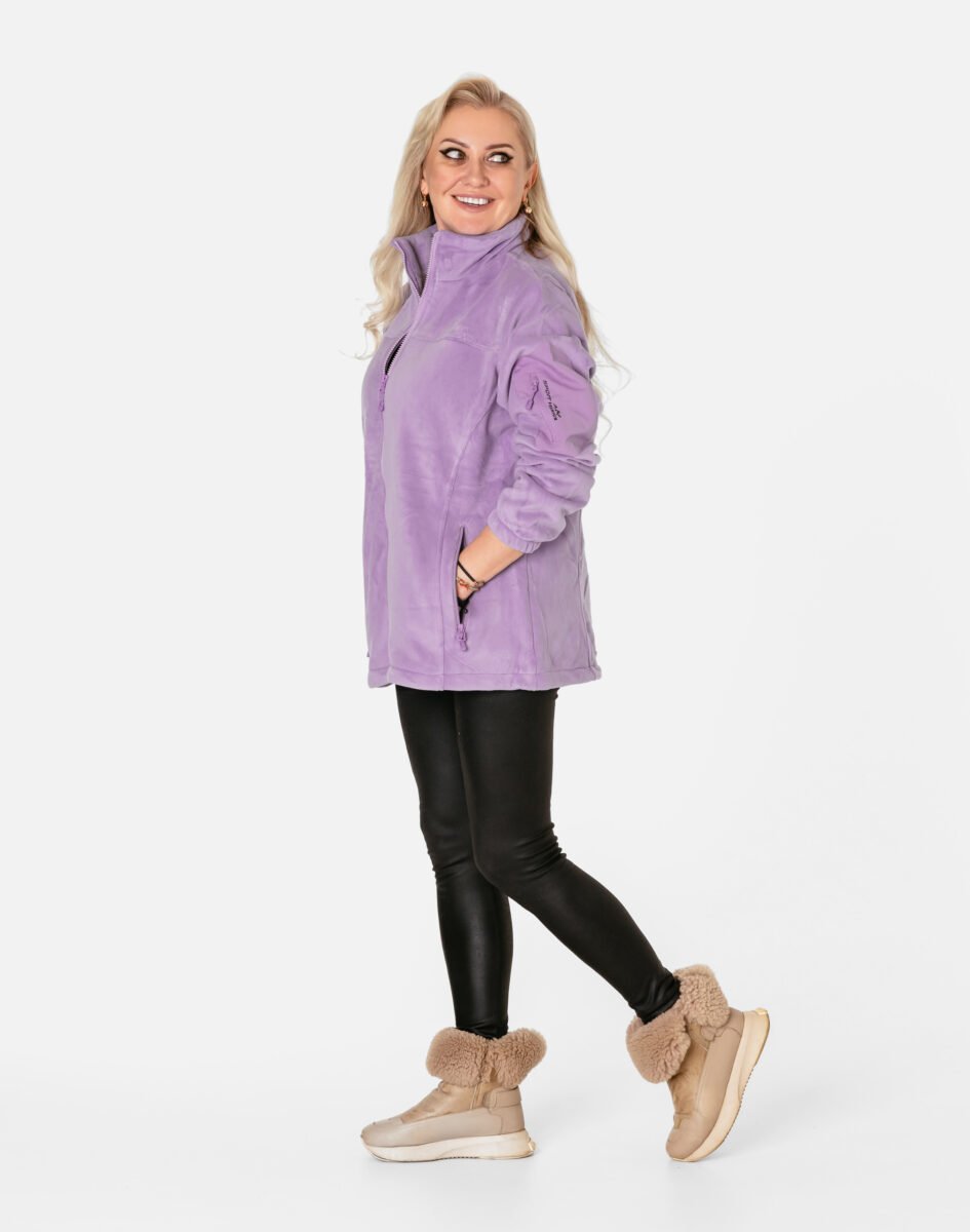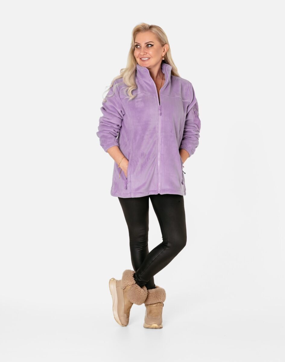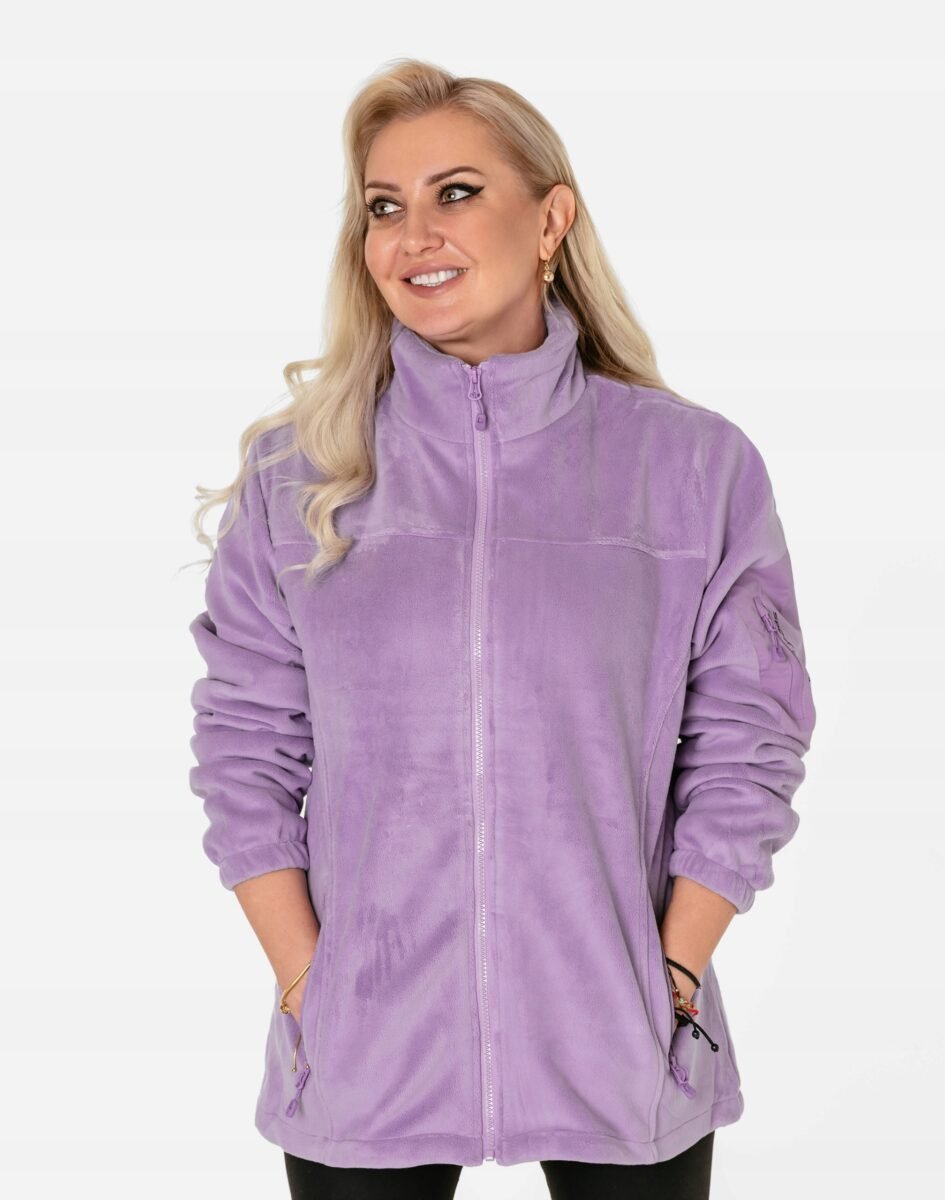 Bluza zasuwana jest w całości na zamek błyskawiczny i posiada dwie kieszenie na dłonie zasuwane na zamki błyskawiczne oraz naszywaną kieszonkę na lewym przedramieniu zasuwaną na zamek. Rękawy zakończone są elastycznym ściągaczem, a dół bluzy regulowany jest ściągaczem i stoperami co pozwala na precyzyjne dopasowanie do ciała i zapobiega utracie ciepła. Długość midi która z powodzeniem zakrywa części ciała wrażliwe na chłód jak plecy na wysokości nerek i pośladki. Znakomicie sprawdzi się w chłodniejsze dni, bo jest ciepła, wygodna i bardzo modna a praktyczny wysoki kołnierz/stójka ochroni Twoją szyję przed zimnem i wiatrem a często zastępuje nawet szalik co jest bardzo wygodne. Materiał polarowy jest wygodny w noszeniu, szybkoschnący i oddychający. Zapewnia bardzo przyjemny kontakt ze skórą oraz komfort cieplny. Fason typu regular wygodny, nie krepujący ruchów, odpowiednio wykrojony do noszenia na wierzchu.