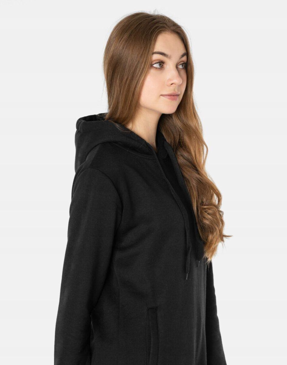 Sportowa długa bluza damska wyprodukowana z dzianiny bawełnianej, zapewniającej maksymalną wygodę i komfort użytkowania. Naturalna bawełna gwarantuje izolację cieplną, wchłanianie potu i oddychanie skóry, a sam materiał odznacza się dużą miękkością. Wysoka jakość dzianiny to gwarancja pełnej swobody ruchów oraz stabilności rozmiarów i kolorów po wielokrotnym praniu. Klasyczna, gładka, wkładana przez głowę. Dół bluzy oraz rękawy wykończone szerokim elastycznym ściągaczem. Bluza posiada z przodu dwie wpuszczane kieszenie na dłonie i zintegrowany kaptur z możliwością regulacji wielkości i dopasowania taśmowym ściągaczem. Ergonomiczny krój bluzy nie ogranicza swobody ruchów, a właściwe dla odzieży sportowej proporcje surowcowe wpływają pozytywnie na wygodę użytkowania. Możesz w niej chodzić na co dzień, idealnie nadaje się również do uprawiania różnych dyscyplin sportu i rekreacji.