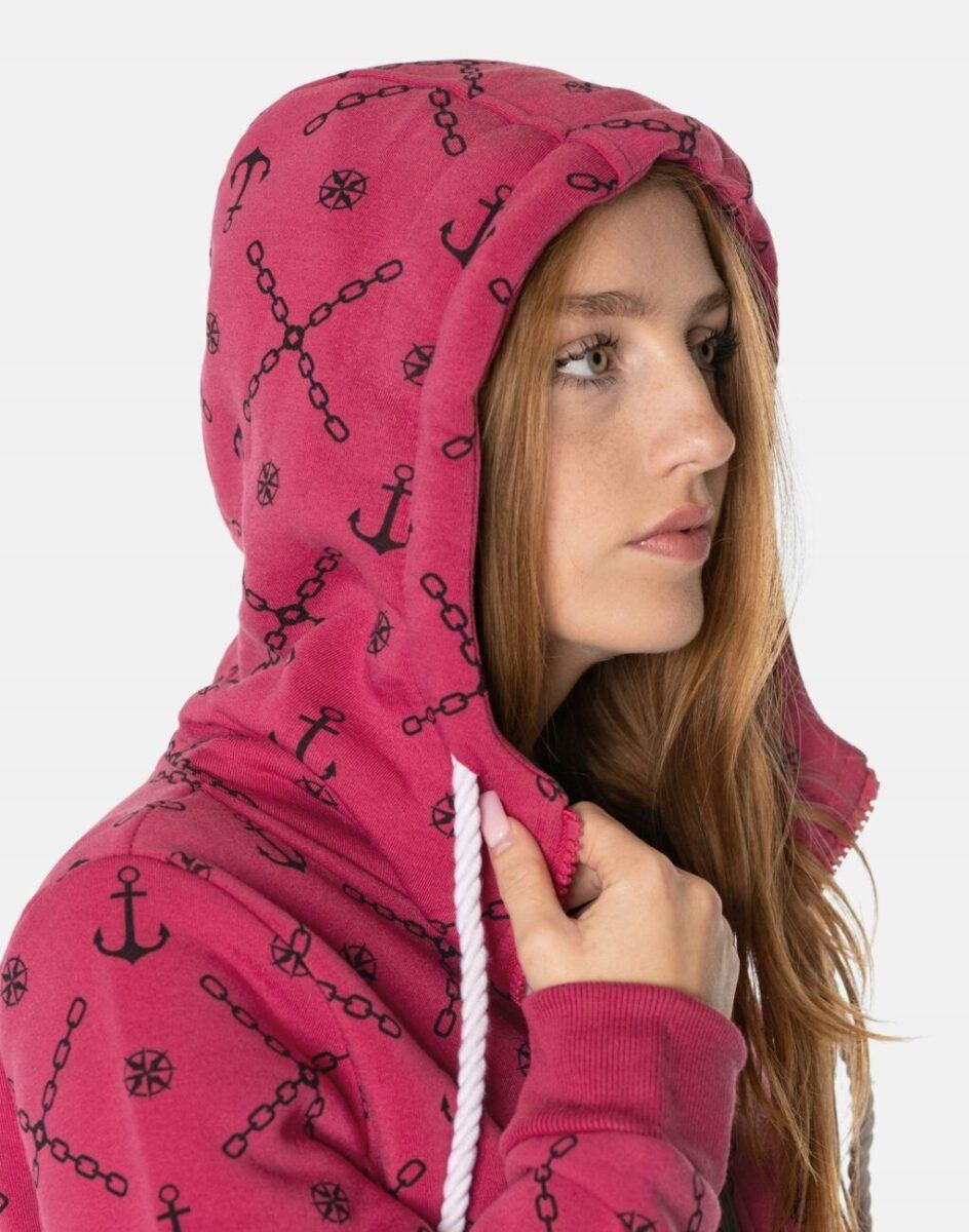 Znakomicie sprawdzi się w chłodniejsze dni bo jest wyjątkowo ciepła i bardzo wygodna, a wysoki zasuwany na zamek kołnierz zintegrowany z kapturem ochroni Twoją głowę, podbródek i szyję przed zimnem i wiatrem a często zastępuje nawet szalik co jest bardzo wygodne. Bluza zasuwana jest w całości na zamek błyskawiczny i posiada dwie wpuszczane kieszenie na dłonie. Dół bluzy oraz rękawy wykończone szerokim elastycznym ściągaczem co pozwala na precyzyjne dopasowanie bluzy do ciała i zapobiega utracie ciepła. Długość midi, która z powodzeniem zakrywa części ciała wrażliwe na chłód jak plecy na wysokości nerek i pośladki.