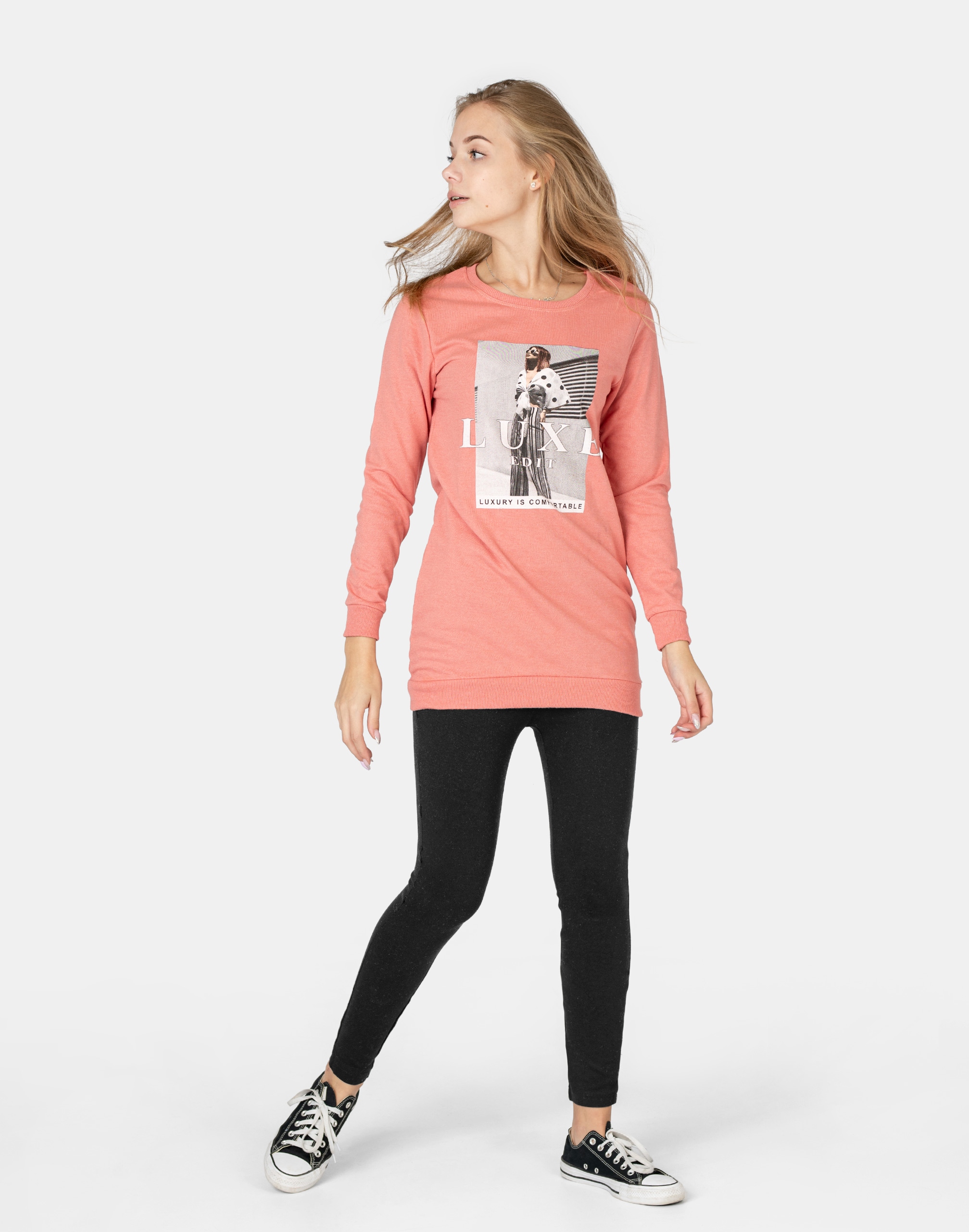 Długa sportowa bluza bawełniana przyda Ci się przez cały rok: w zimie możesz nosić ją pod kurtką, a wiosną, jesienią i latem przyda się jako samodzielne okrycie w chłodniejsze lub wietrzne dni. Uratuje cię w sytuacji, gdy nie będziesz miała czasu na wymyślanie, w co się ubrać.