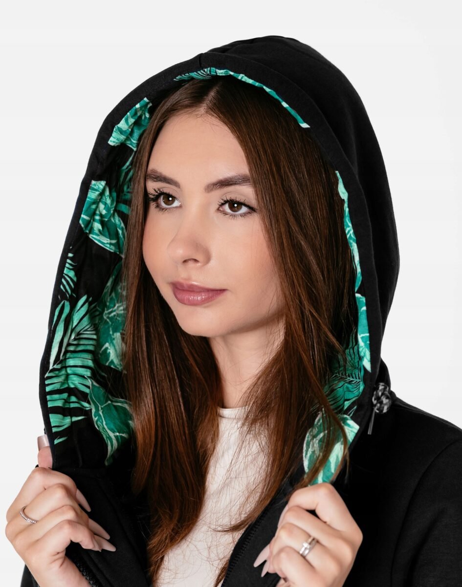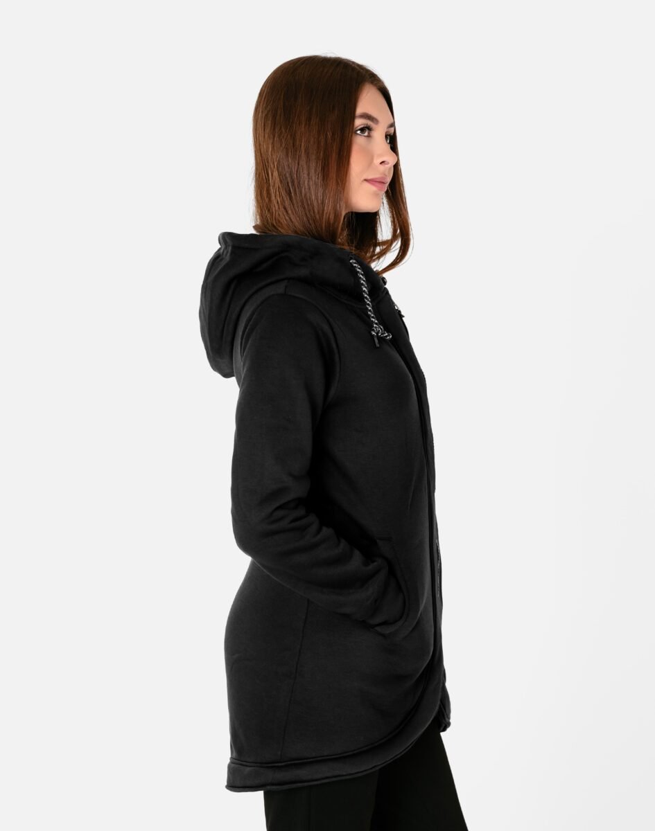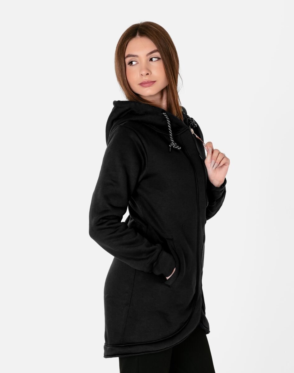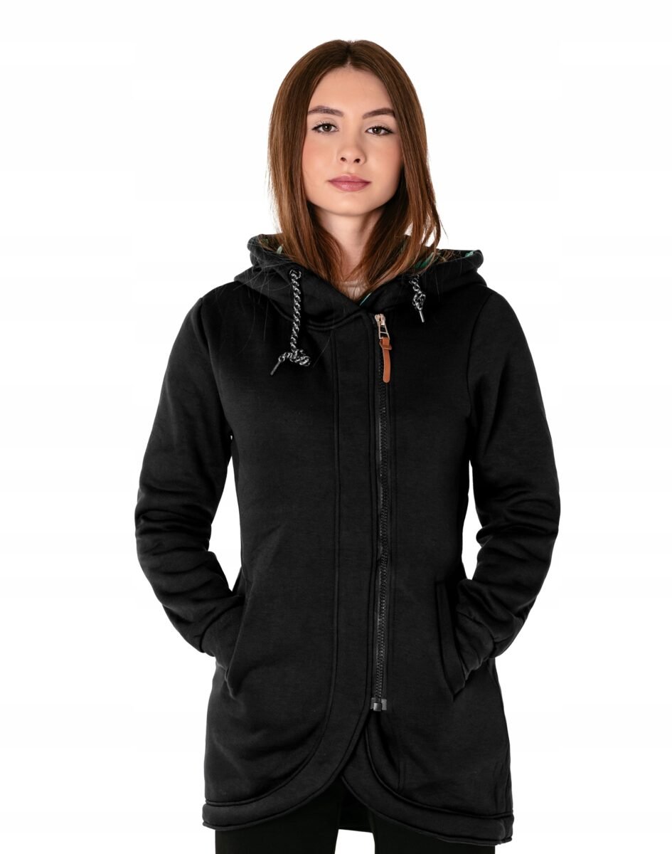 Znakomicie sprawdzi się w chłodniejsze dni, bo jest wyjątkowo ciepła i bardzo wygodna, a praktyczny kaptur ochroni Twoją głowę i szyję przed zimnem i wiatrem. Bluza/tunika zasuwana jest w całości, na firmowy zamek błyskawiczny i posiada dwie wpuszczane kieszenie na dłonie. Rękawy zakończone są szerokim elastycznym ściągaczem, co pozwala na precyzyjne dopasowanie bluzy do ciała i zapobiega utracie ciepła. Długość midi, asymetryczna – z tyłu dłuższa, a z przodu krótsza, która z powodzeniem zakrywa części ciała wrażliwe na chłód jak plecy na wysokości nerek, uda i pośladki.