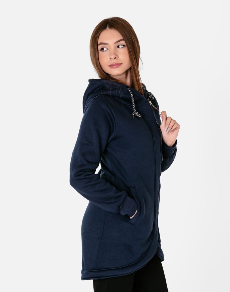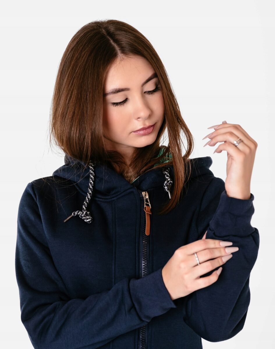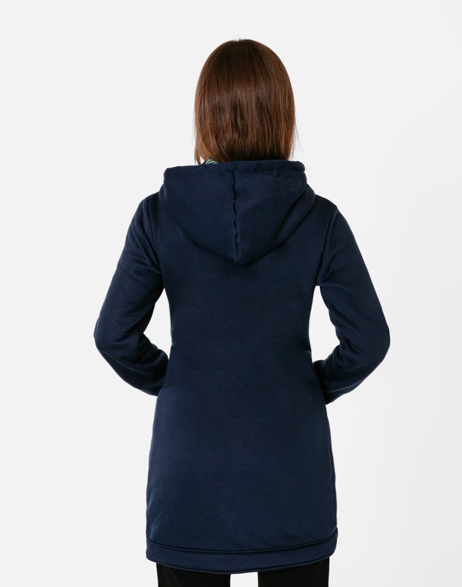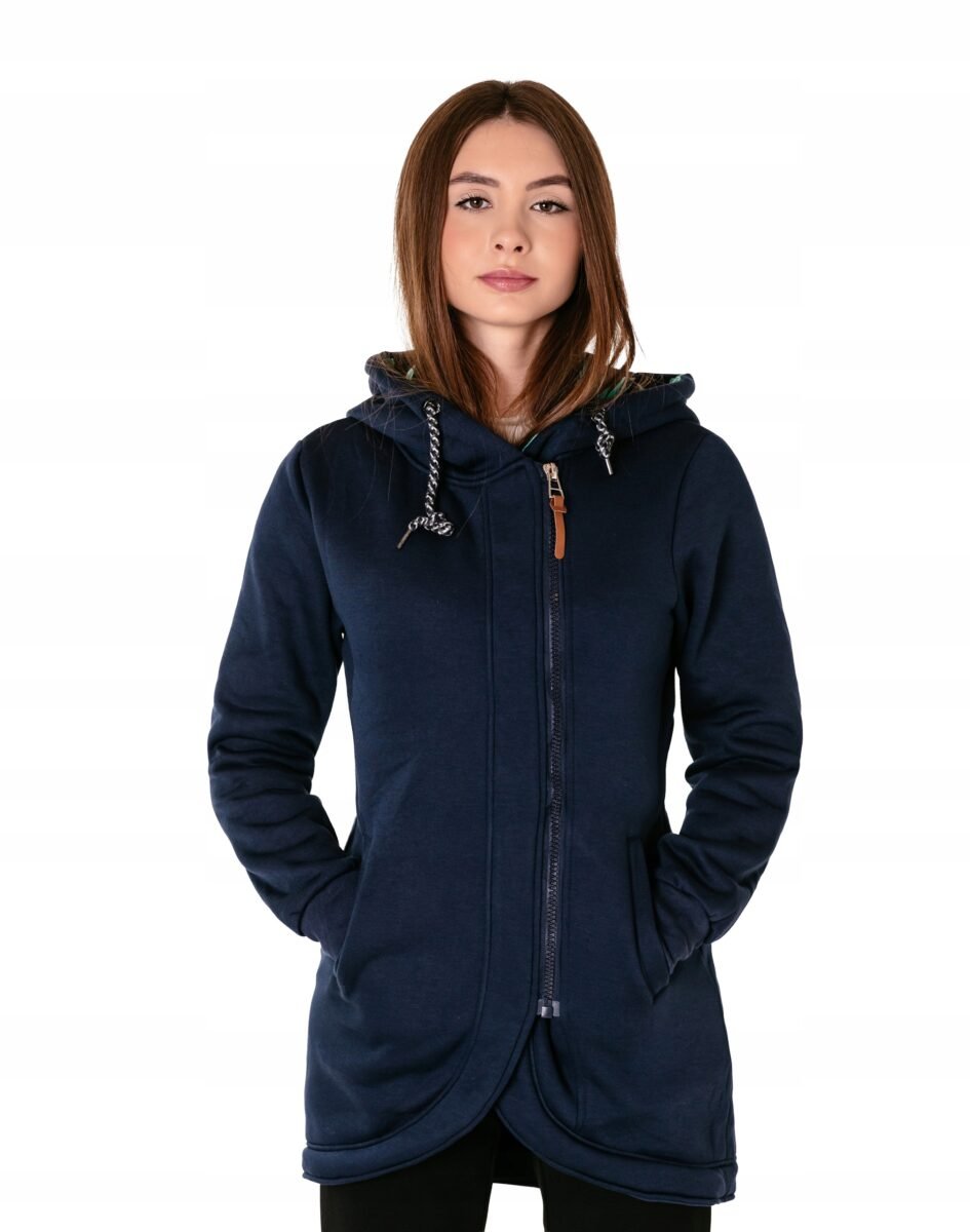 Znakomicie sprawdzi się w chłodniejsze dni, bo jest wyjątkowo ciepła i bardzo wygodna, a praktyczny kaptur ochroni Twoją głowę i szyję przed zimnem i wiatrem. Bluza/tunika zasuwana jest w całości, na firmowy zamek błyskawiczny i posiada dwie wpuszczane kieszenie na dłonie. Rękawy zakończone są szerokim elastycznym ściągaczem, co pozwala na precyzyjne dopasowanie bluzy do ciała i zapobiega utracie ciepła. Długość midi, asymetryczna – z tyłu dłuższa, a z przodu krótsza, która z powodzeniem zakrywa części ciała wrażliwe na chłód jak plecy na wysokości nerek, uda i pośladki.