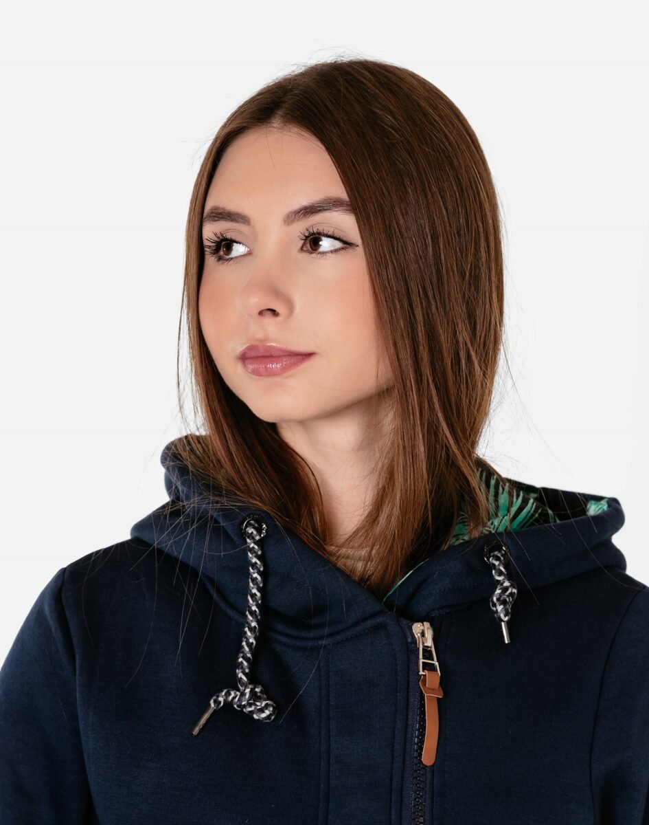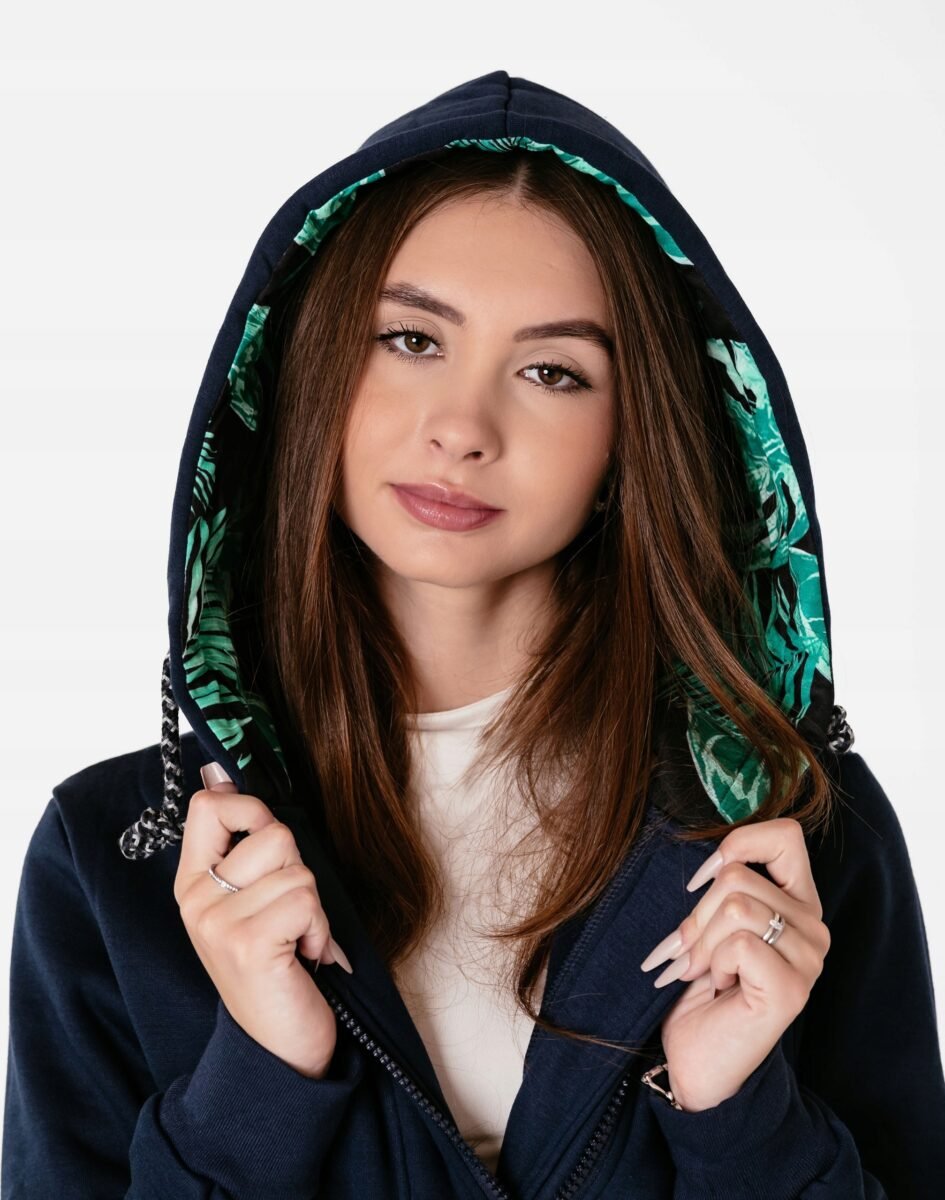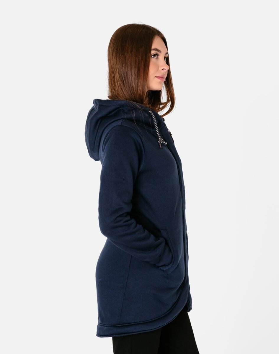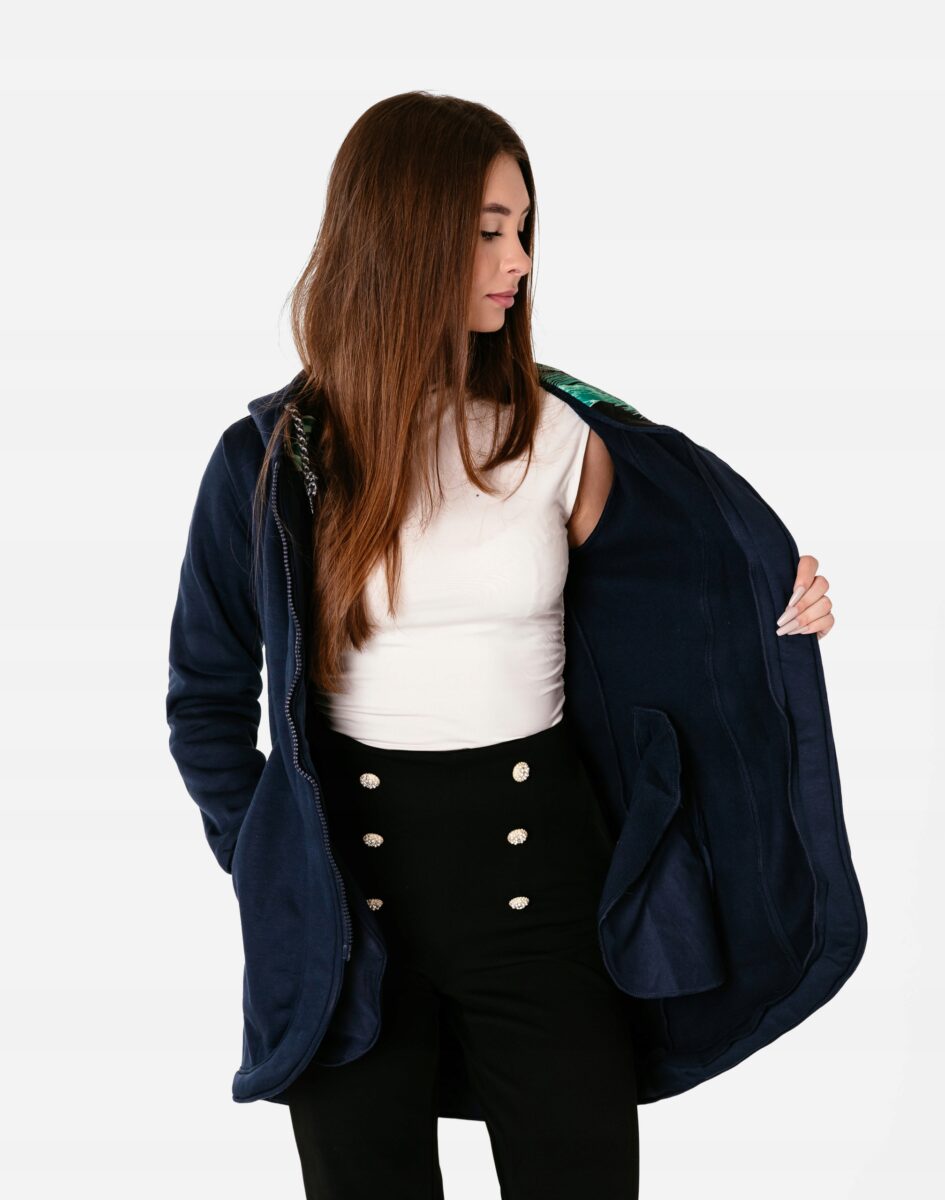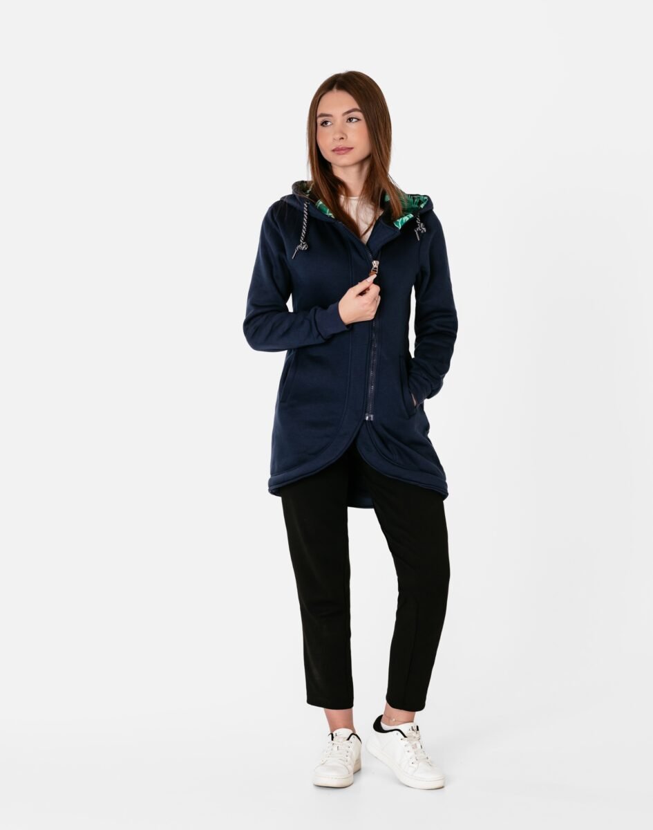 Znakomicie sprawdzi się w chłodniejsze dni, bo jest wyjątkowo ciepła i bardzo wygodna, a praktyczny kaptur ochroni Twoją głowę i szyję przed zimnem i wiatrem. Bluza/tunika zasuwana jest w całości, na firmowy zamek błyskawiczny i posiada dwie wpuszczane kieszenie na dłonie. Rękawy zakończone są szerokim elastycznym ściągaczem, co pozwala na precyzyjne dopasowanie bluzy do ciała i zapobiega utracie ciepła. Długość midi, asymetryczna – z tyłu dłuższa, a z przodu krótsza, która z powodzeniem zakrywa części ciała wrażliwe na chłód jak plecy na wysokości nerek, uda i pośladki.