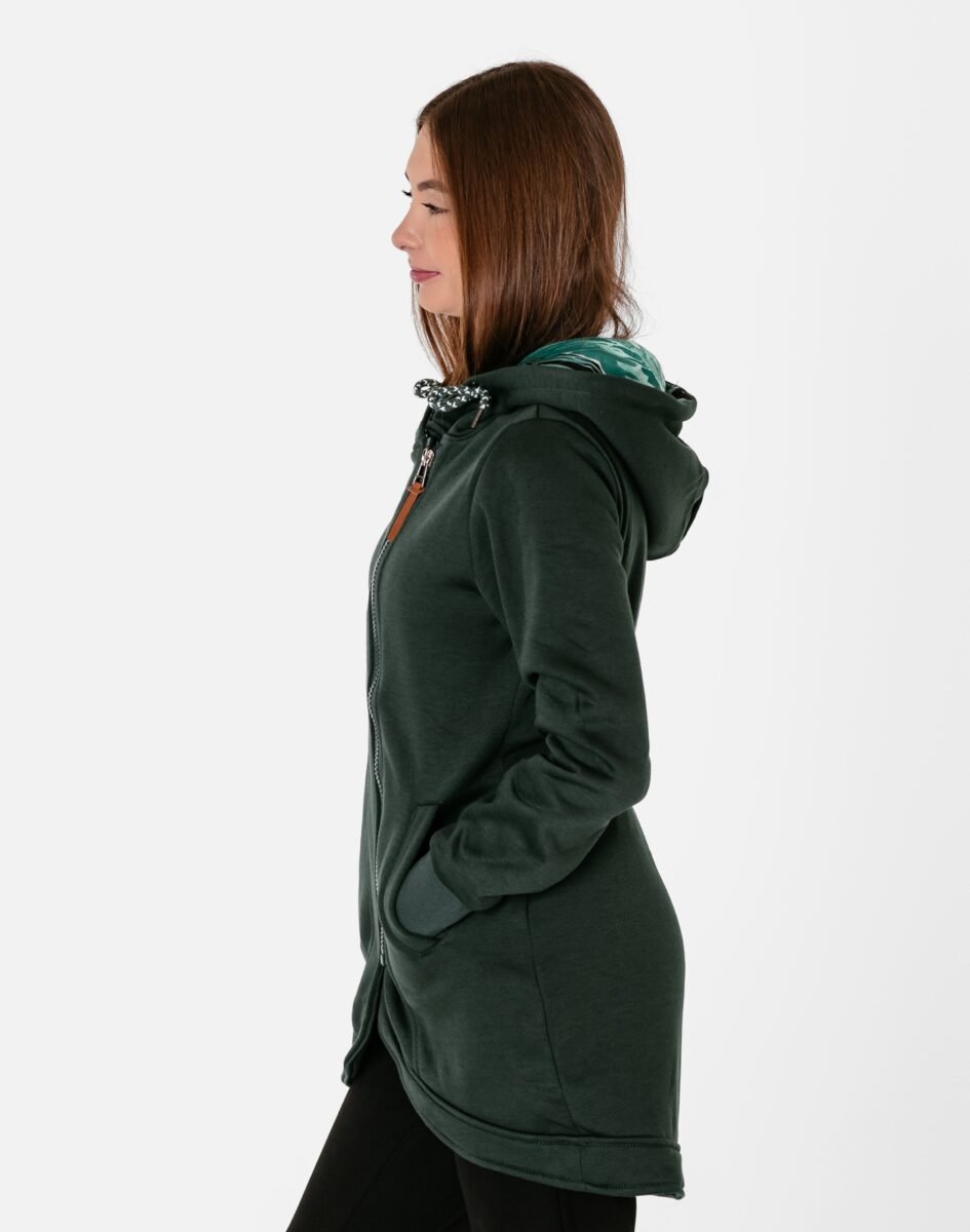 Znakomicie sprawdzi się w chłodniejsze dni, bo jest wyjątkowo ciepła i bardzo wygodna, a praktyczny kaptur ochroni Twoją głowę i szyję przed zimnem i wiatrem. Bluza/tunika zasuwana jest w całości, na firmowy zamek błyskawiczny i posiada dwie wpuszczane kieszenie na dłonie. Rękawy zakończone są szerokim elastycznym ściągaczem, co pozwala na precyzyjne dopasowanie bluzy do ciała i zapobiega utracie ciepła. Długość midi, asymetryczna – z tyłu dłuższa, a z przodu krótsza, która z powodzeniem zakrywa części ciała wrażliwe na chłód jak plecy na wysokości nerek, uda i pośladki.