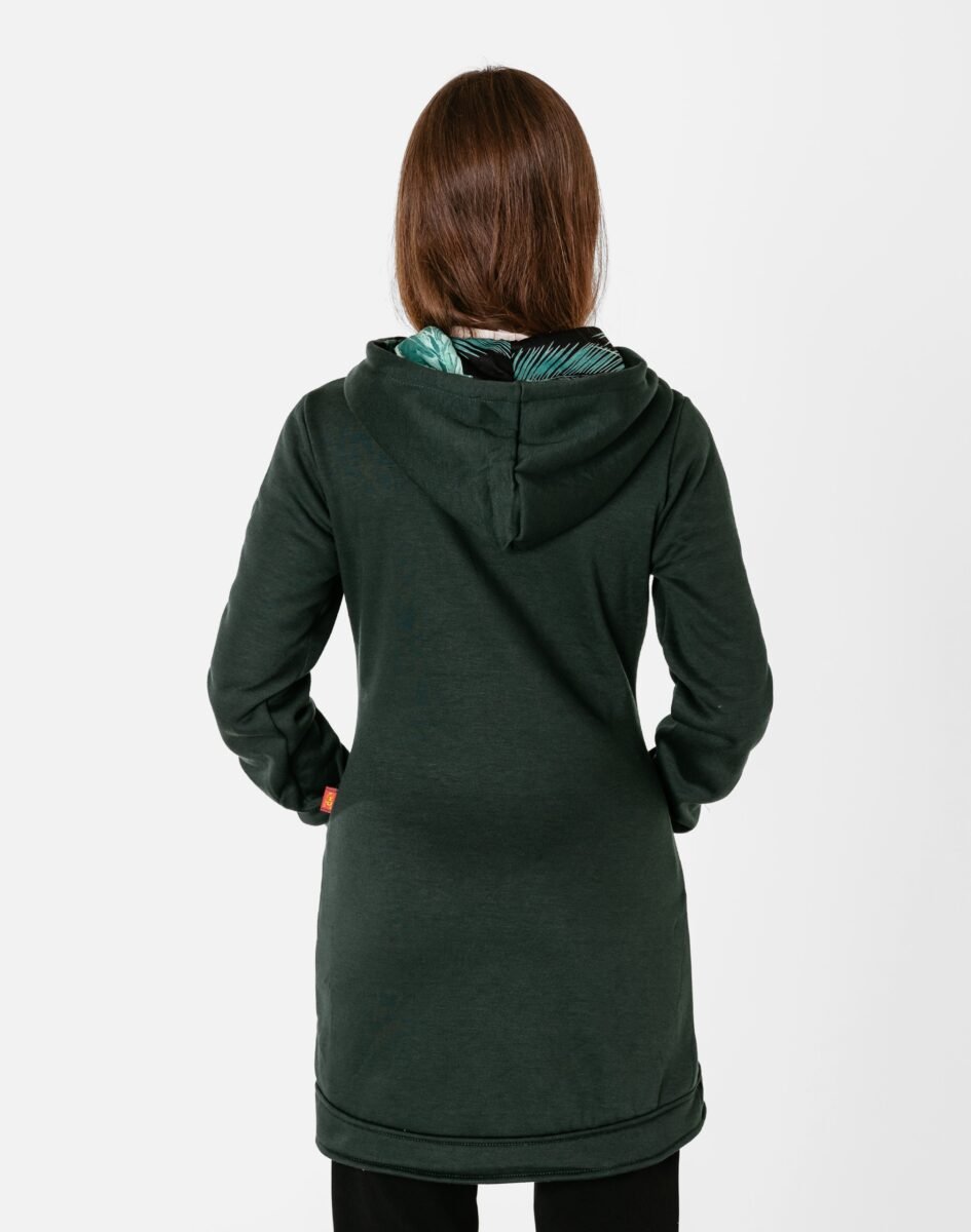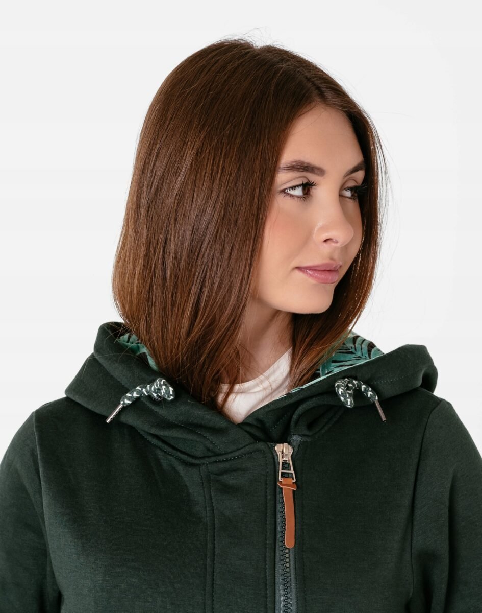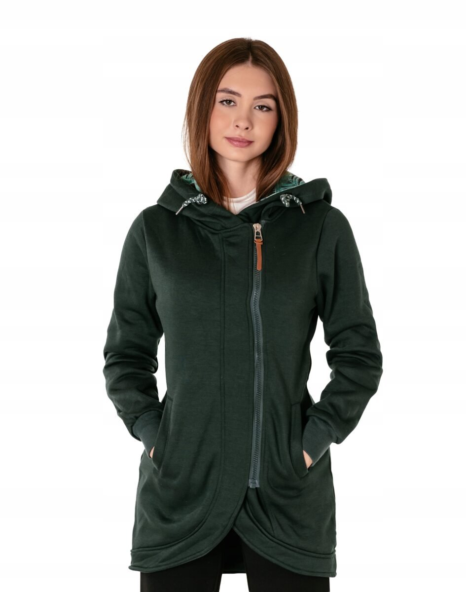 Znakomicie sprawdzi się w chłodniejsze dni, bo jest wyjątkowo ciepła i bardzo wygodna, a praktyczny kaptur ochroni Twoją głowę i szyję przed zimnem i wiatrem. Bluza/tunika zasuwana jest w całości, na firmowy zamek błyskawiczny i posiada dwie wpuszczane kieszenie na dłonie. Rękawy zakończone są szerokim elastycznym ściągaczem, co pozwala na precyzyjne dopasowanie bluzy do ciała i zapobiega utracie ciepła. Długość midi, asymetryczna – z tyłu dłuższa, a z przodu krótsza, która z powodzeniem zakrywa części ciała wrażliwe na chłód jak plecy na wysokości nerek, uda i pośladki.