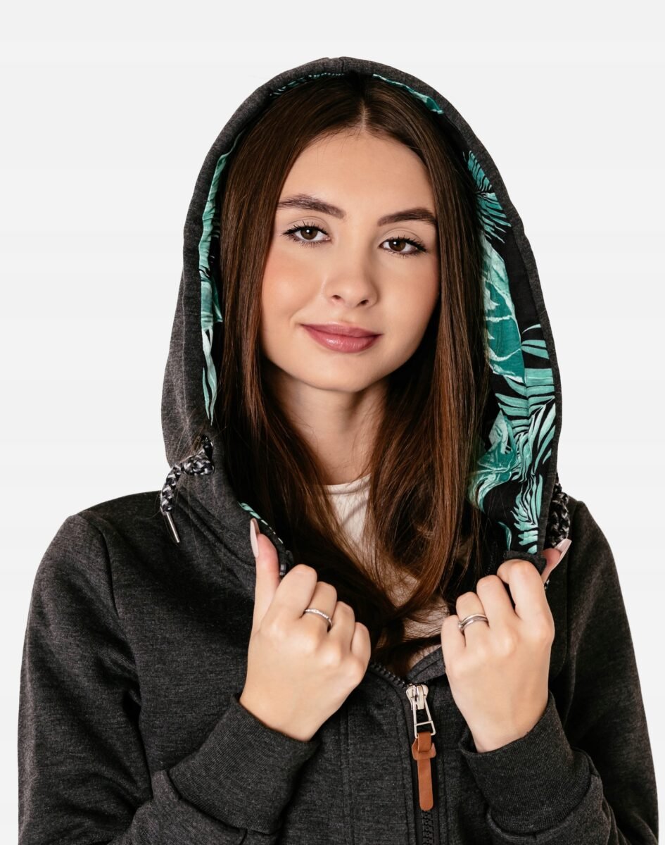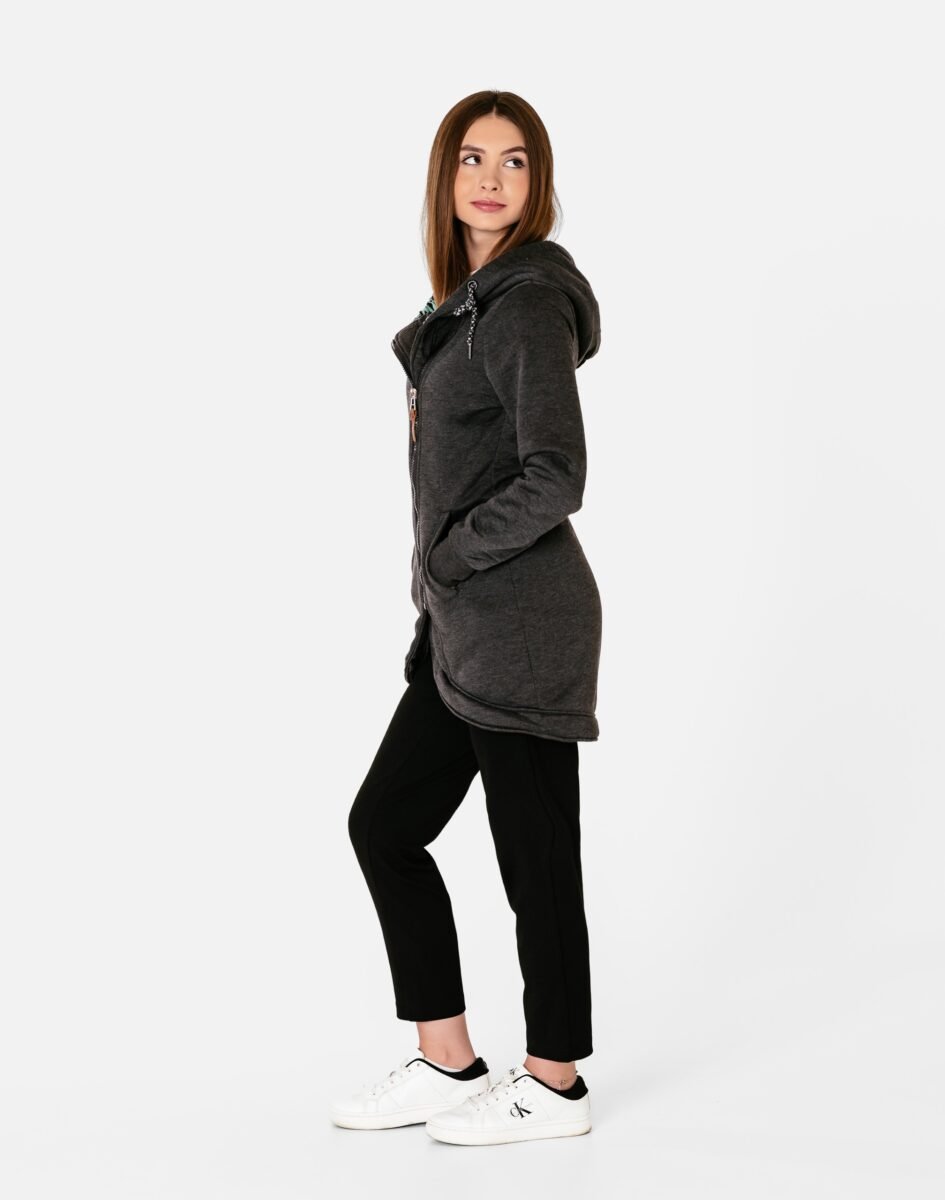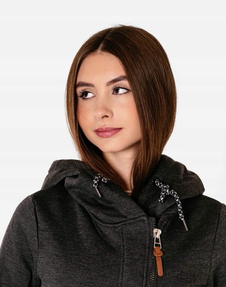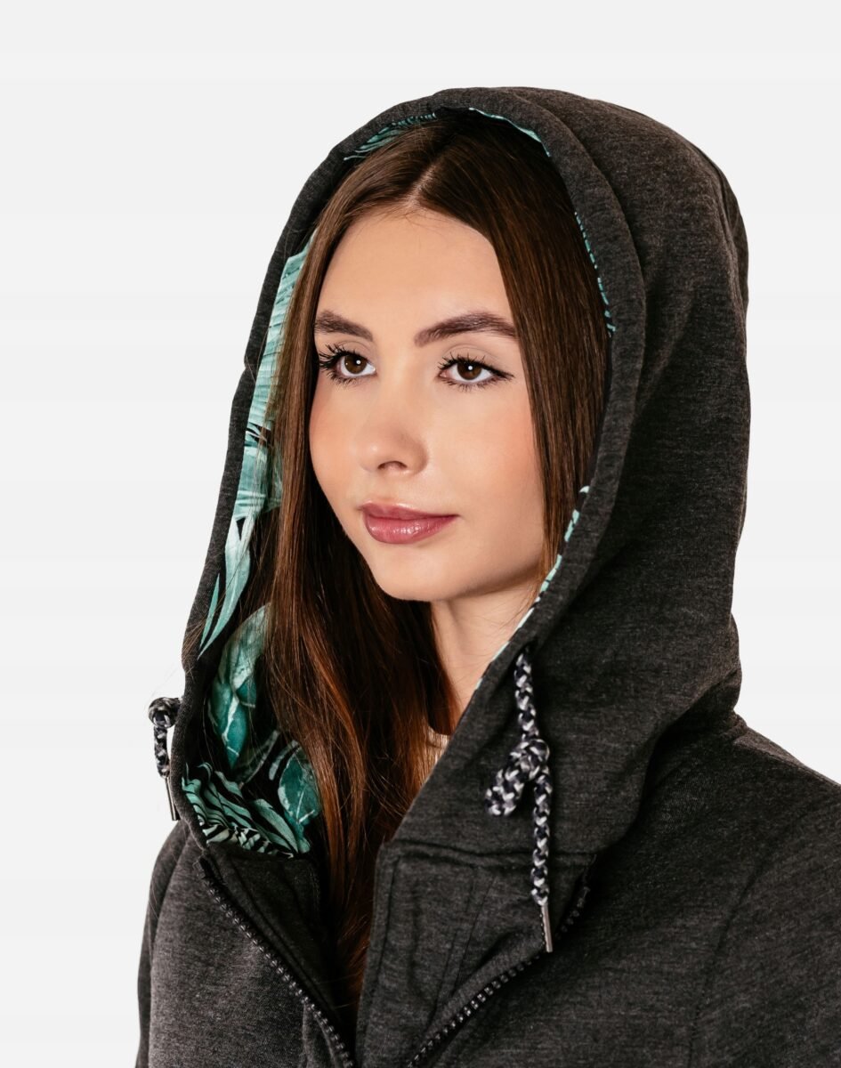 Znakomicie sprawdzi się w chłodniejsze dni, bo jest wyjątkowo ciepła i bardzo wygodna, a praktyczny kaptur ochroni Twoją głowę i szyję przed zimnem i wiatrem. Bluza/tunika zasuwana jest w całości, na firmowy zamek błyskawiczny i posiada dwie wpuszczane kieszenie na dłonie. Rękawy zakończone są szerokim elastycznym ściągaczem, co pozwala na precyzyjne dopasowanie bluzy do ciała i zapobiega utracie ciepła. Długość midi, asymetryczna – z tyłu dłuższa, a z przodu krótsza, która z powodzeniem zakrywa części ciała wrażliwe na chłód jak plecy na wysokości nerek, uda i pośladki.
