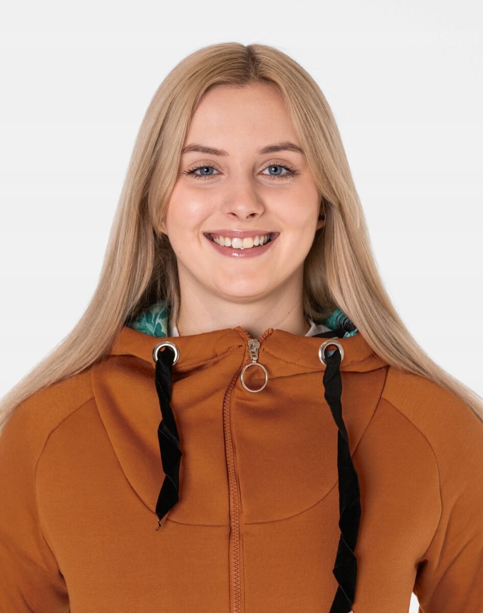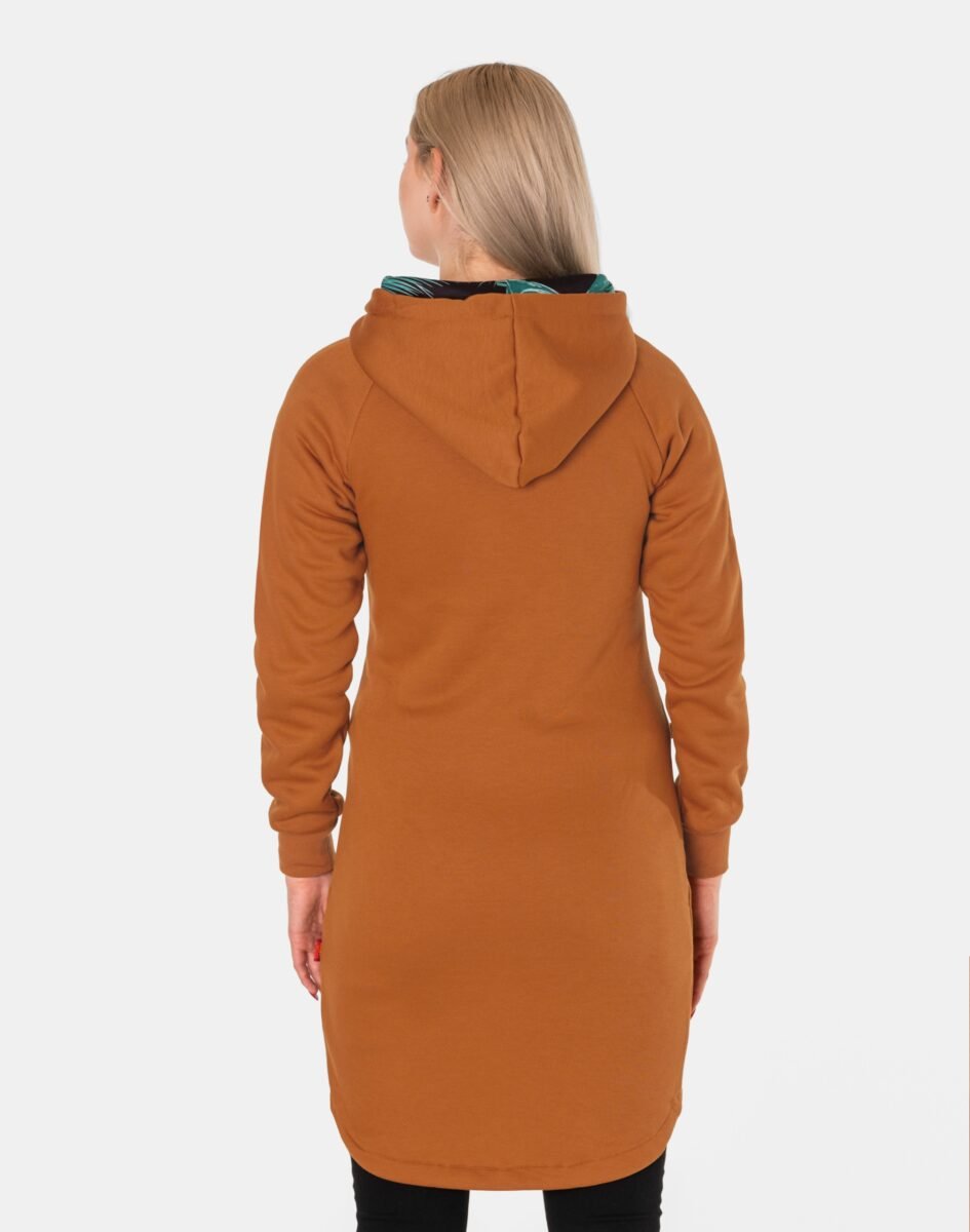 Znakomicie sprawdzi się w chłodniejsze dni, bo jest wyjątkowo ciepła i bardzo wygodna, a praktyczny kaptur ochroni Twoją głowę i szyję przed zimnem i wiatrem. Bluza/tunika zasuwana jest w całości, wraz z wysokim kołnierzem-stójką na zamek błyskawiczny i posiada dwie wpuszczane kieszenie na dłonie. Rękawy zakończone są szerokim elastycznym ściągaczem, co pozwala na precyzyjne dopasowanie bluzy do ciała i zapobiega utracie ciepła. Długość midi, asymetryczna – z tyłu dłuższa, a z przodu krótsza, która z powodzeniem zakrywa części ciała wrażliwe na chłód jak plecy na wysokości nerek i pośladki.