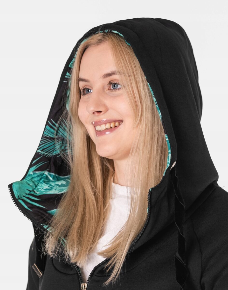 Znakomicie sprawdzi się w chłodniejsze dni, bo jest wyjątkowo ciepła i bardzo wygodna, a praktyczny kaptur ochroni Twoją głowę i szyję przed zimnem i wiatrem. Bluza/tunika zasuwana jest w całości, wraz z wysokim kołnierzem-stójką na zamek błyskawiczny i posiada dwie wpuszczane kieszenie na dłonie. Rękawy zakończone są szerokim elastycznym ściągaczem, co pozwala na precyzyjne dopasowanie bluzy do ciała i zapobiega utracie ciepła. Długość midi, asymetryczna – z tyłu dłuższa, a z przodu krótsza, która z powodzeniem zakrywa części ciała wrażliwe na chłód jak plecy na wysokości nerek i pośladki.